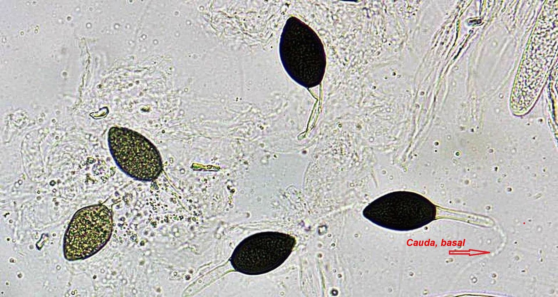 Fibrillose Caudae am Sporenkopf. Bei vielen Sporen nicht vorhanden.