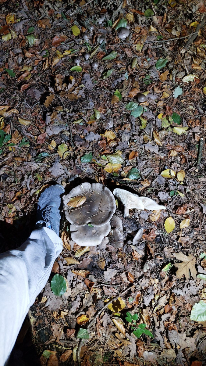 also gestern abend im dunklen Wald standen da ein paar Pilze, deren Hüte (zumindest bei den älteren Exemplaren) Richtung 20 cm Durchmesser gingen. Foto gemacht (Schuh [Gr 44] als Größenvergleich) und gedacht "So große Dinger gibt es sicherlich nicht viele, findest du zu Hause heraus". Leider nicht. Wenn ich eine Suchmaschine mit "großer grauer Hut" füttere, bekomme ich Kopfbedeckungen angezeigt. In meiner Literatur kann ich auch nicht nach Hutgröße filtern... und nun argere ich mich, kein Schnitttbild gemacht zu haben, nicht am Pilz gerochen zu haben etc....