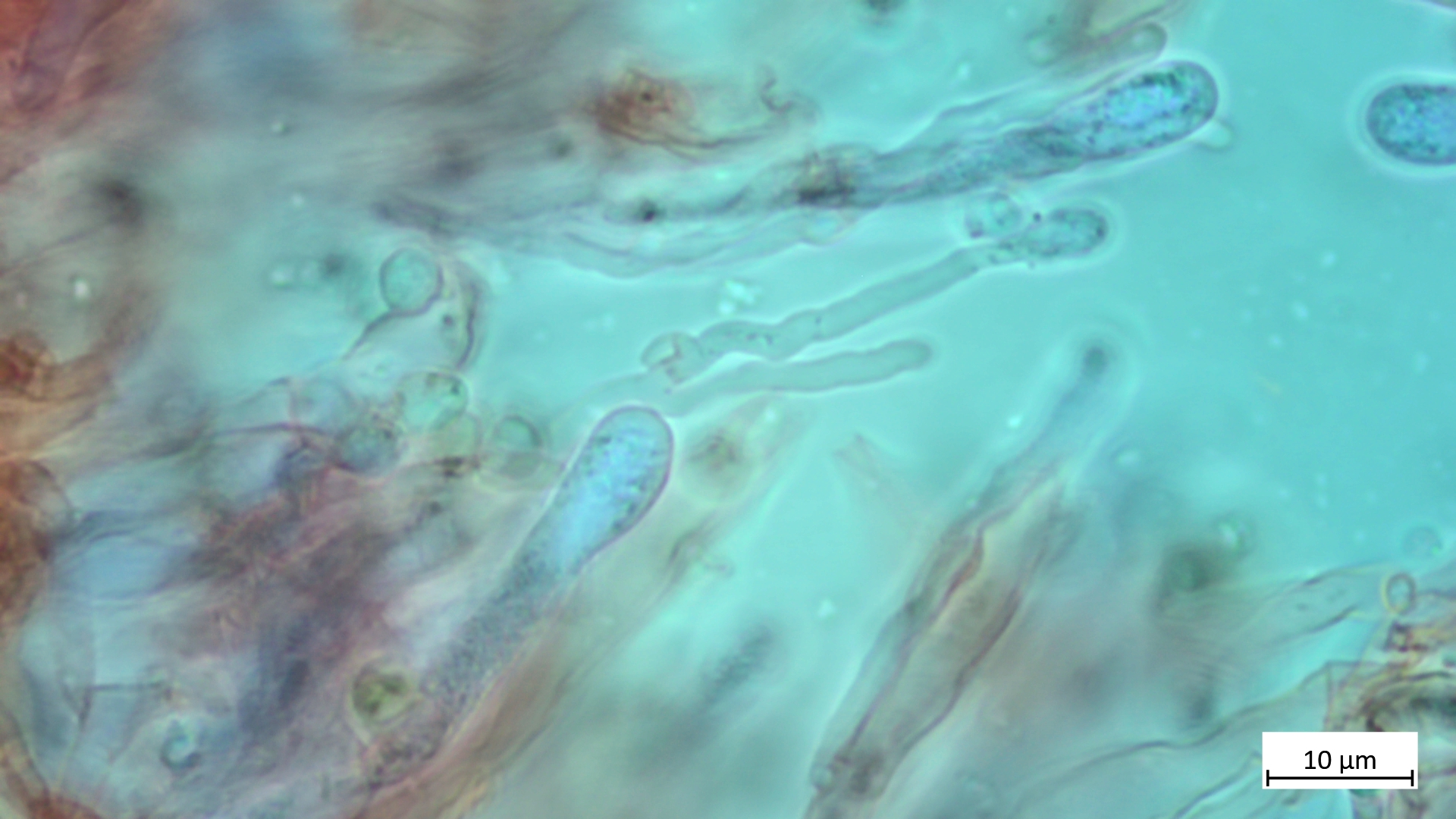 Schwer getan habe ich mich mit den Schnallen. Manche Arten sträuben sich einfach, mal die Basdien vom Rest zu lösen und freie Sicht zu erlauben. Habe gequetscht, gezupft ... aber so wirklich glücklich bin ich mit der Sicht auf die Basidienbasis nicht geworden. Schnallen sind aber scheinbar vorhanden. Nach langer Suche zumindest diese zwei Bilderchen hier:
