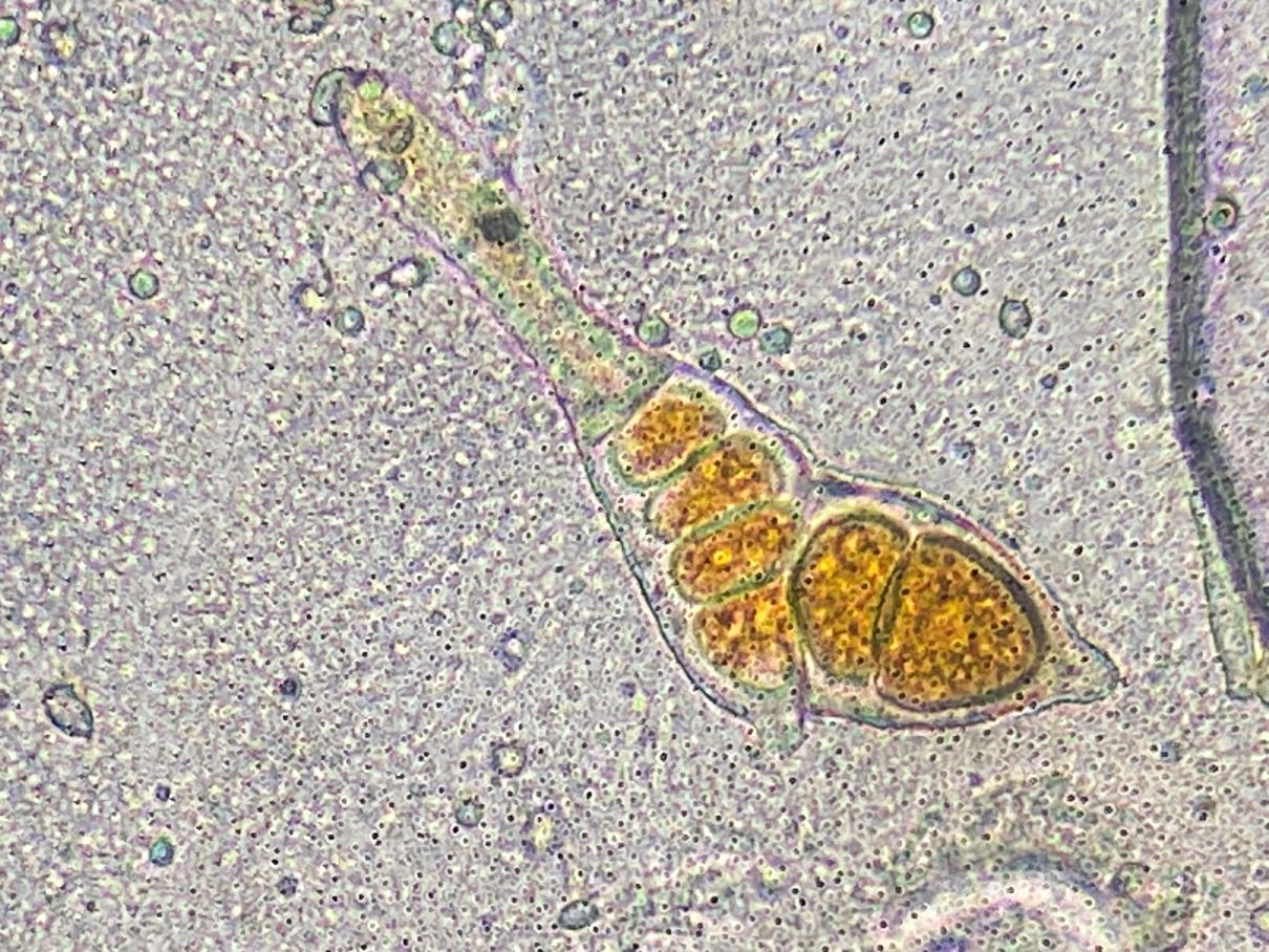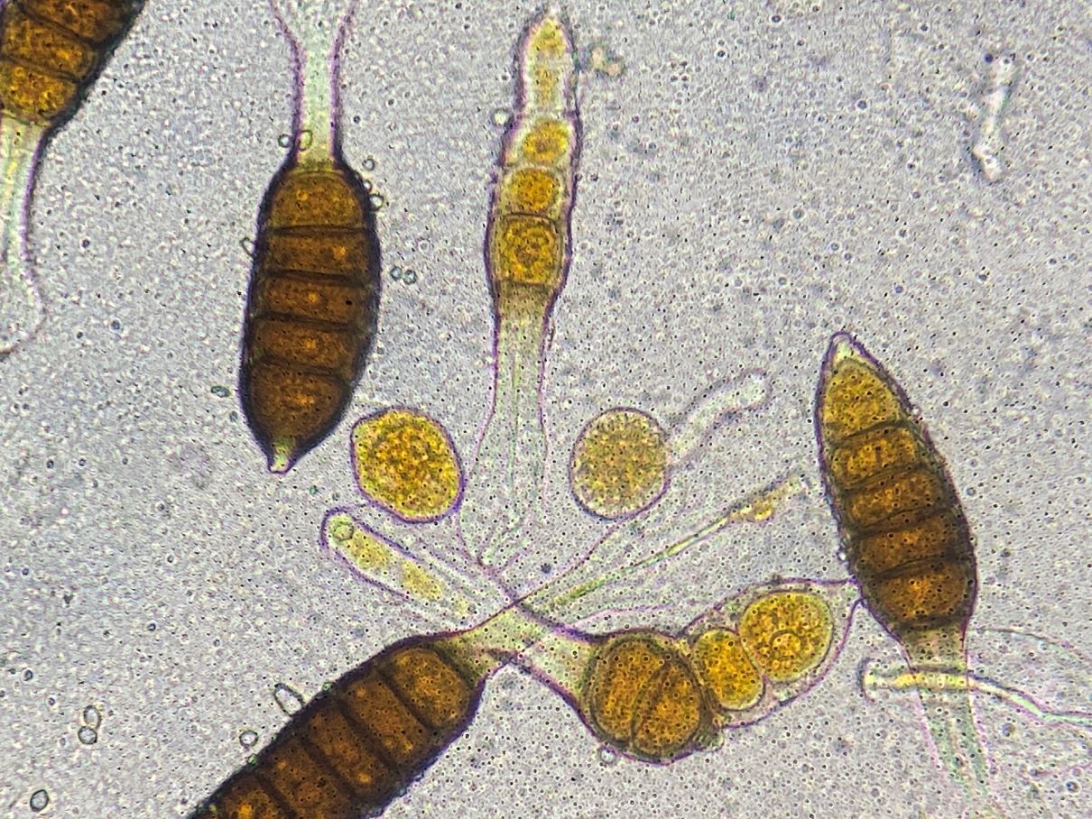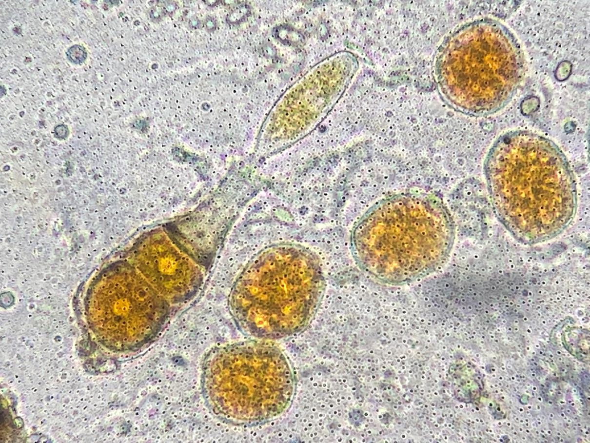 Die Formen auf den Fotos würde man wohl als Teliosporen und Uredosporen bezeichnen; dasselbe galt auch zunächst für mich. Aber mir kommen Zweifel. Bei diesem Phragmidium tuberculatum haben die Teliosporen in der Regel sechs Kammern. Diese Kammern werden hier gelegentlich zu runden orangen Objekten umgewandelt. Diese orangen Kugeln ähneln nun sehr den „Uredosporen“. Kann es sein, dass diese „Uredosporen“ Vermehrungszellen aus den Teliosporen sind? Basidien habe ich keine gesehen. Ich sah auch keine leeren Teliosporen, aber viele mit weniger als sechs Kammern/Kugeln.