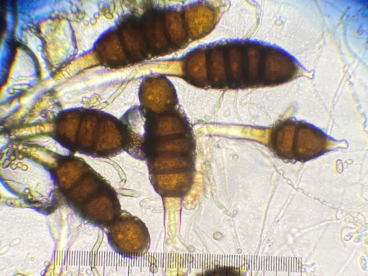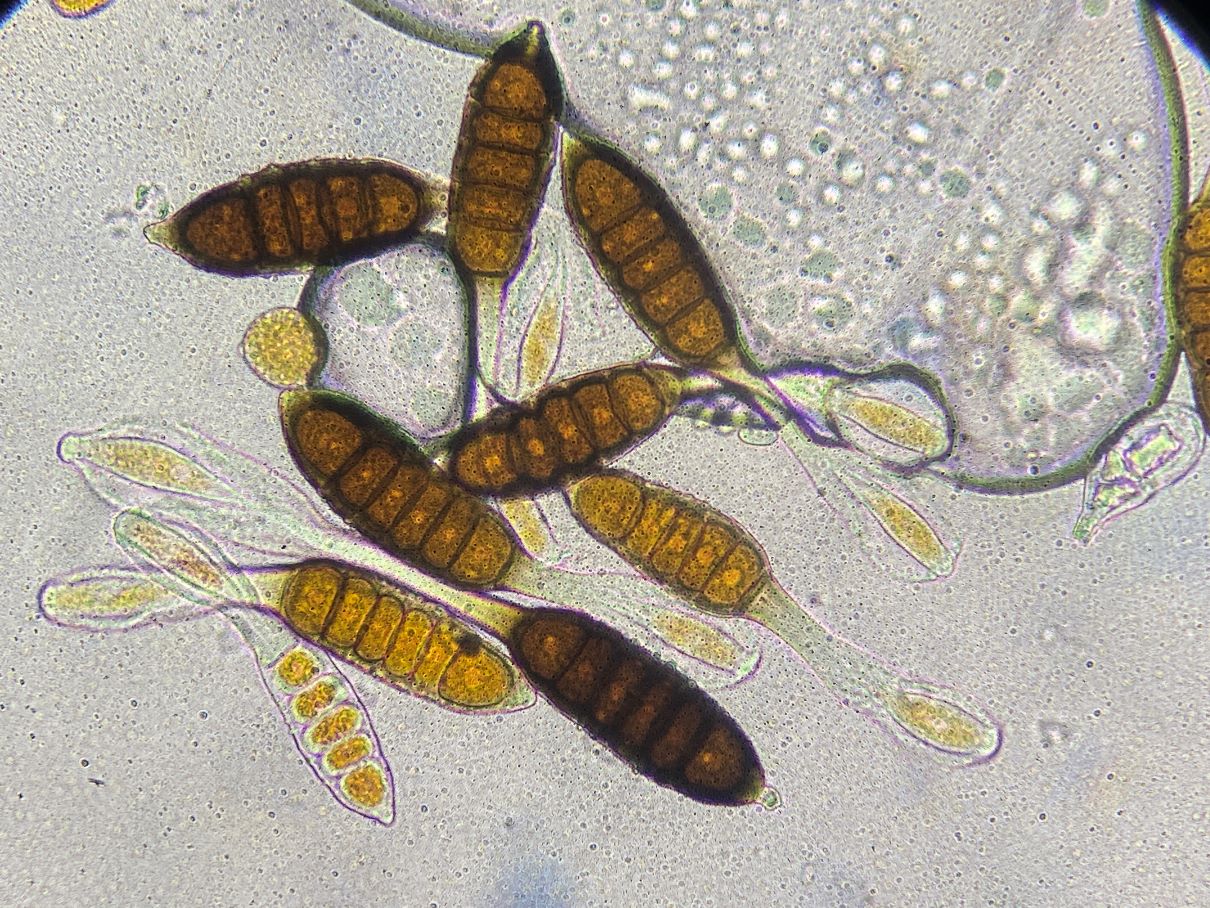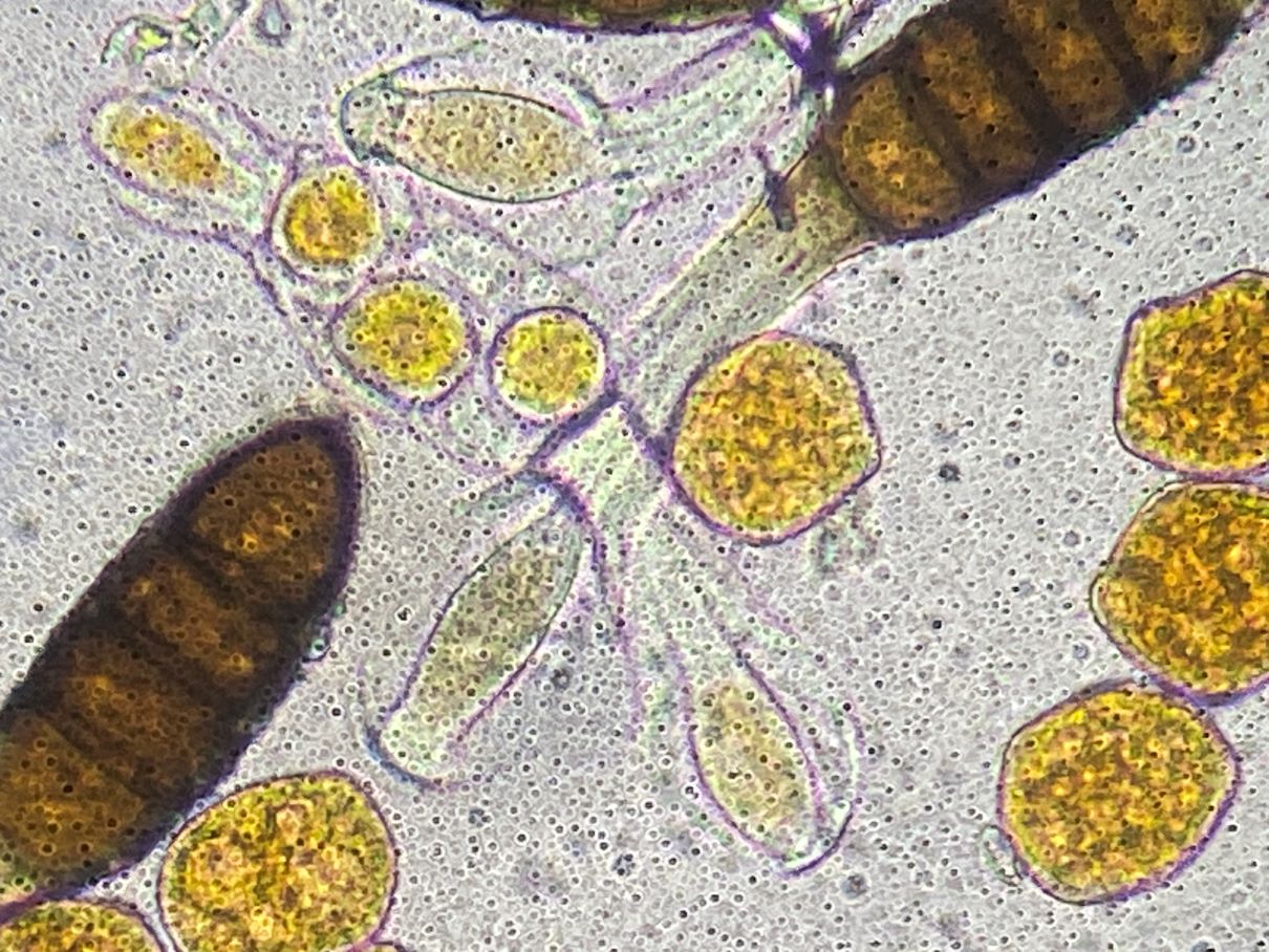 Die Formen auf den Fotos würde man wohl als Teliosporen und Uredosporen bezeichnen; dasselbe galt auch zunächst für mich. Aber mir kommen Zweifel. Bei diesem Phragmidium tuberculatum haben die Teliosporen in der Regel sechs Kammern. Diese Kammern werden hier gelegentlich zu runden orangen Objekten umgewandelt. Diese orangen Kugeln ähneln nun sehr den „Uredosporen“. Kann es sein, dass diese „Uredosporen“ Vermehrungszellen aus den Teliosporen sind? Basidien habe ich keine gesehen. Ich sah auch keine leeren Teliosporen, aber viele mit weniger als sechs Kammern/Kugeln.
