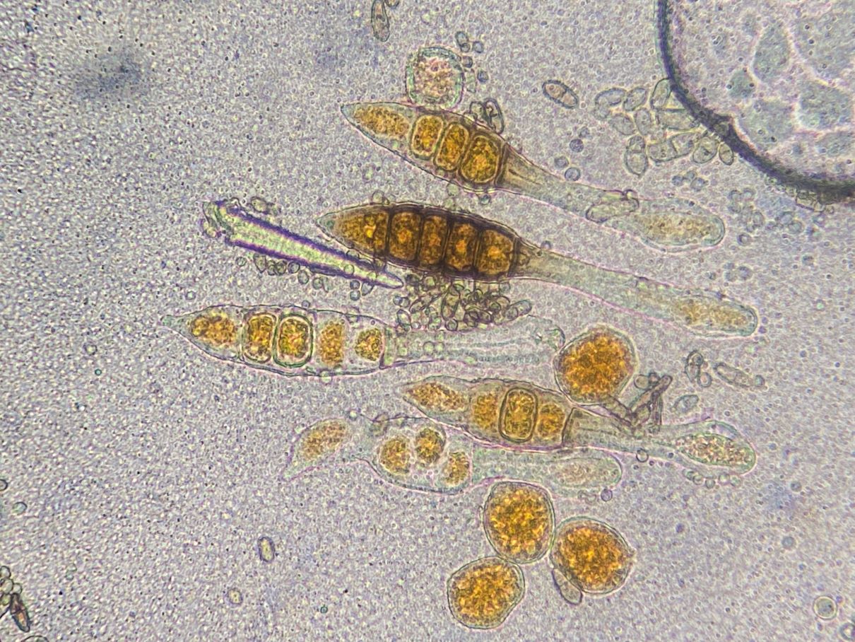 Die Formen auf den Fotos würde man wohl als Teliosporen und Uredosporen bezeichnen; dasselbe galt auch zunächst für mich. Aber mir kommen Zweifel. Bei diesem Phragmidium tuberculatum haben die Teliosporen in der Regel sechs Kammern. Diese Kammern werden hier gelegentlich zu runden orangen Objekten umgewandelt. Diese orangen Kugeln ähneln nun sehr den „Uredosporen“. Kann es sein, dass diese „Uredosporen“ Vermehrungszellen aus den Teliosporen sind? Basidien habe ich keine gesehen. Ich sah auch keine leeren Teliosporen, aber viele mit weniger als sechs Kammern/Kugeln.
