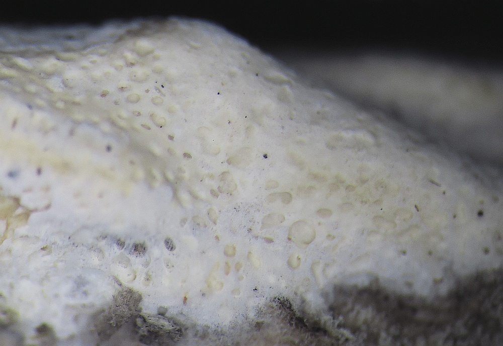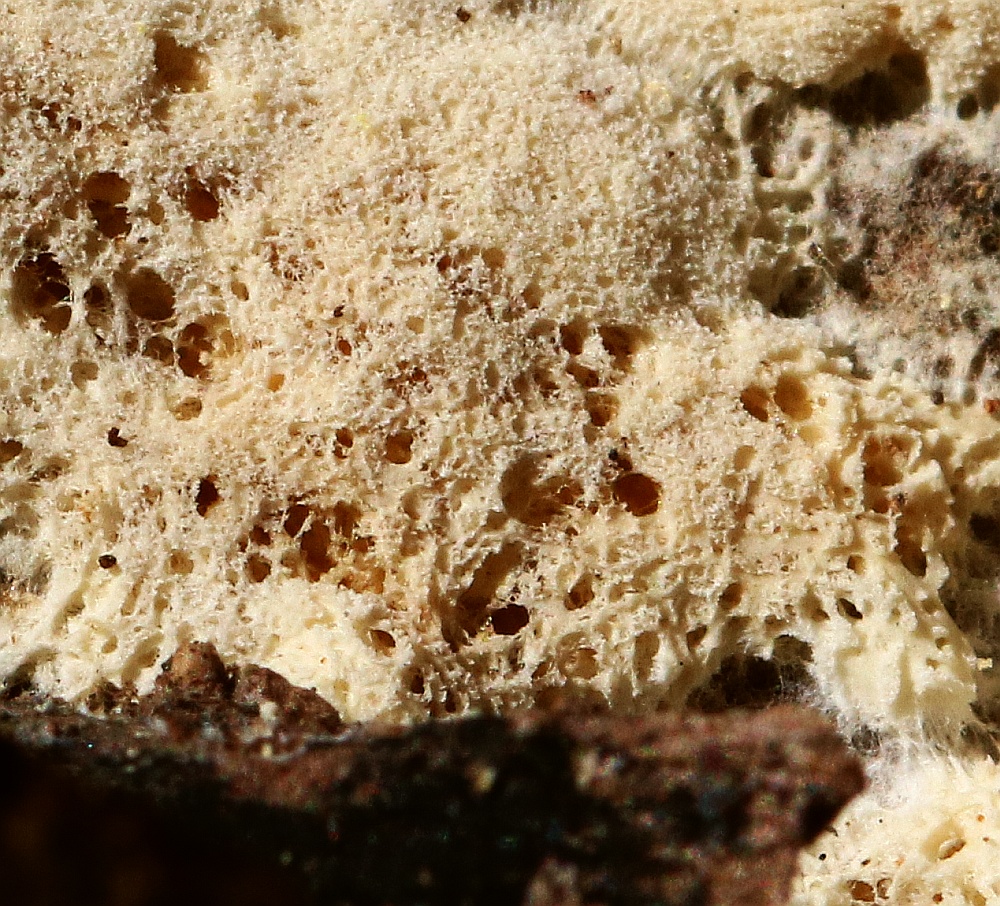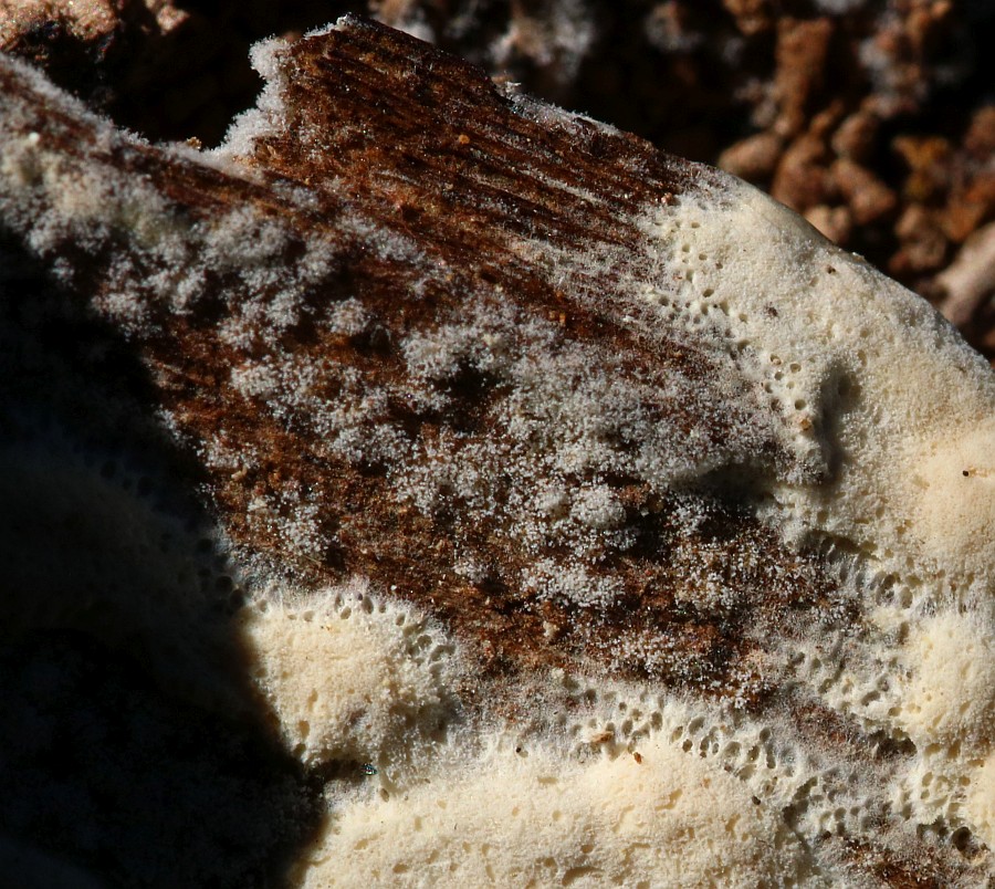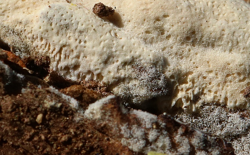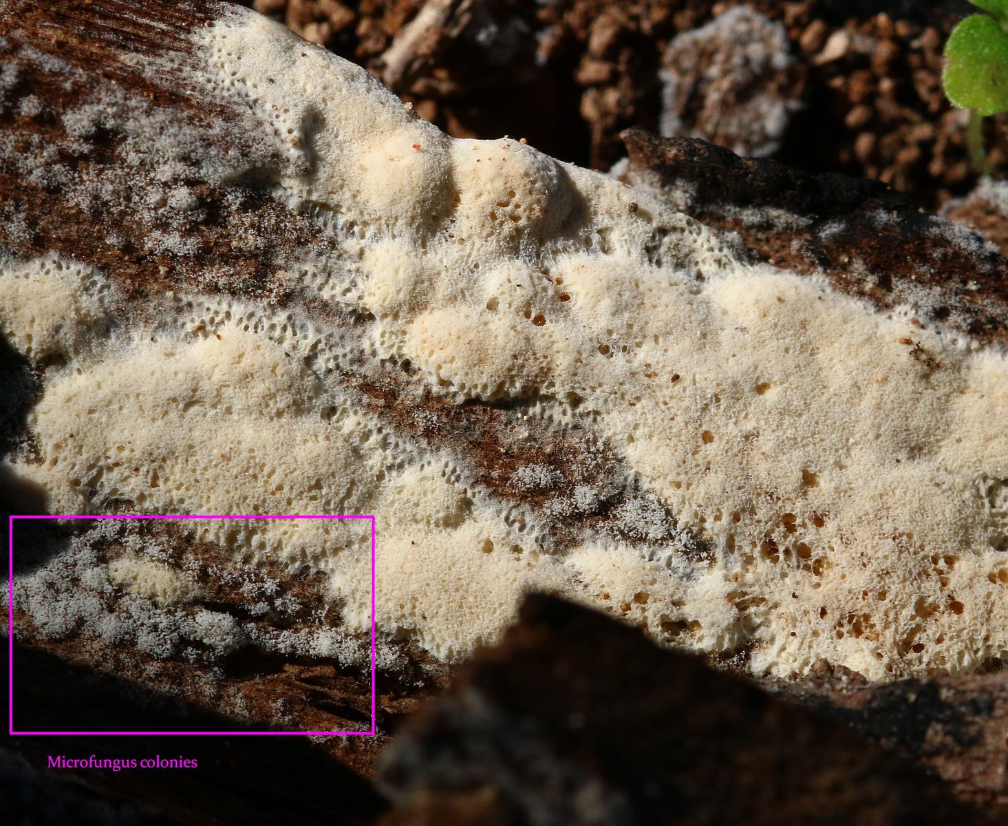 It is a white polypore which seems to be accompanied by its amorphous stage as grayish - olive green colonies at the perimeter of the crust. I include several photos of the teleomorph and anamorph, both macro and micro.