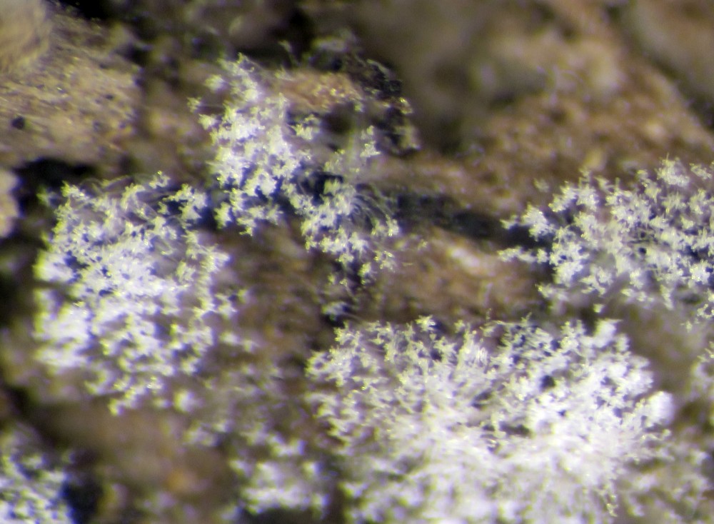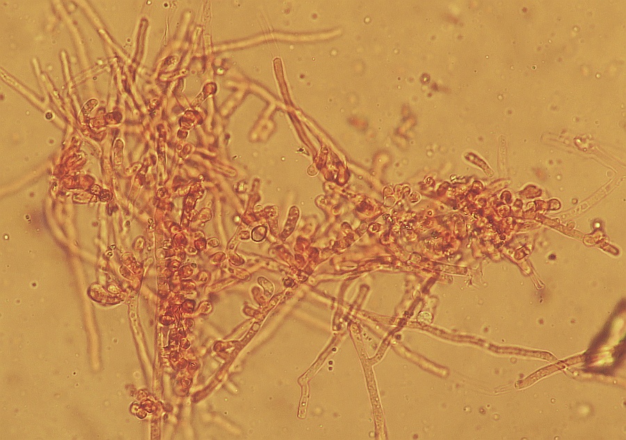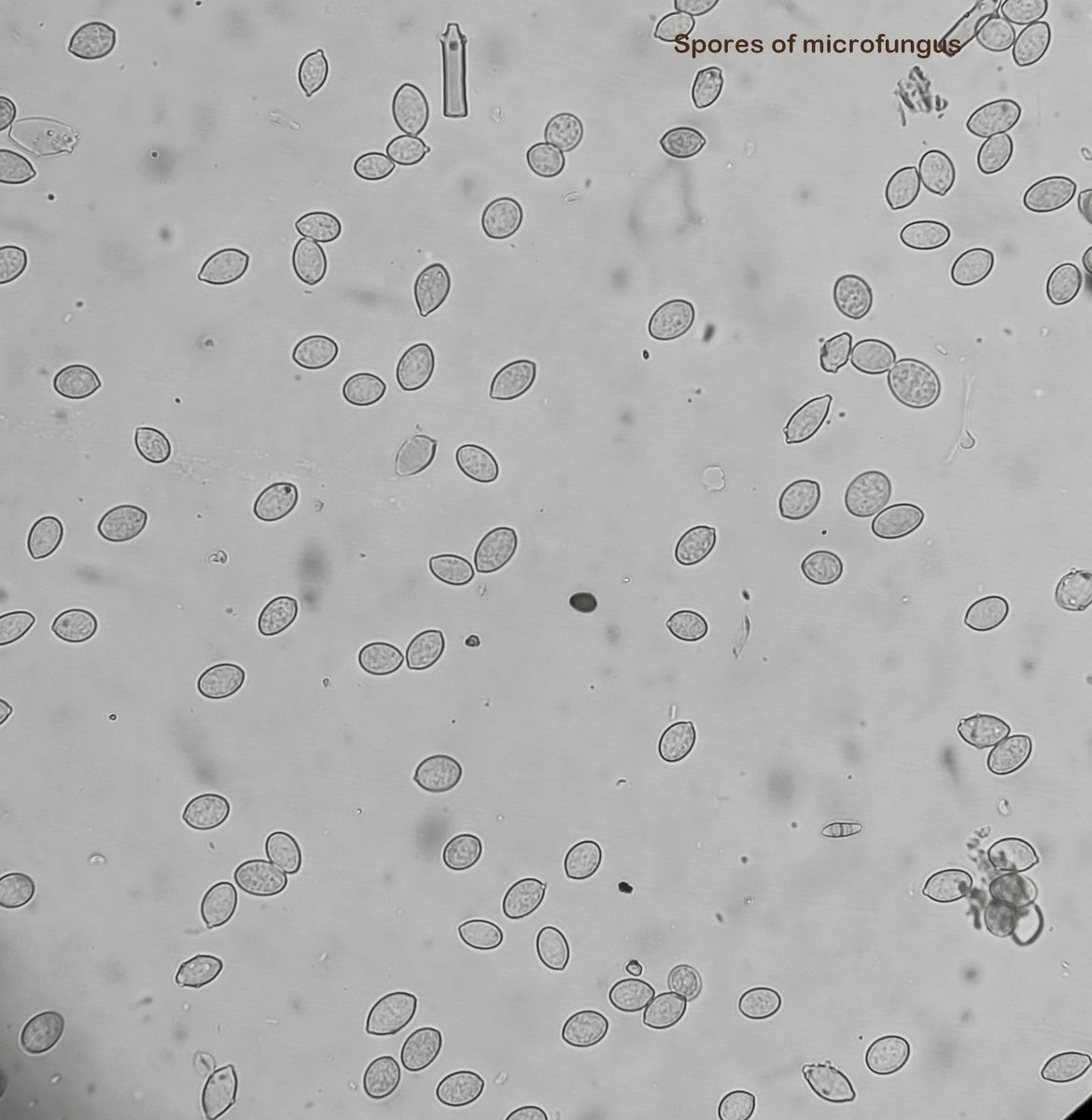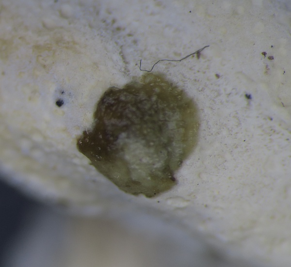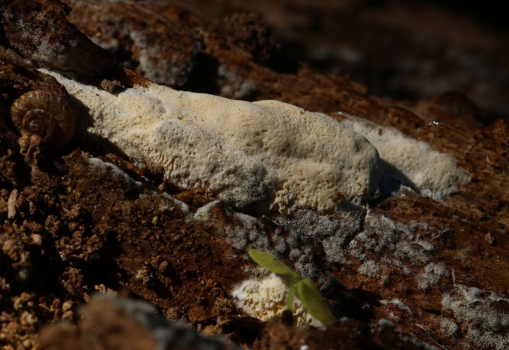 It is a white polypore which seems to be accompanied by its amorphous stage as grayish - olive green colonies at the perimeter of the crust. I include several photos of the teleomorph and anamorph, both macro and micro.
