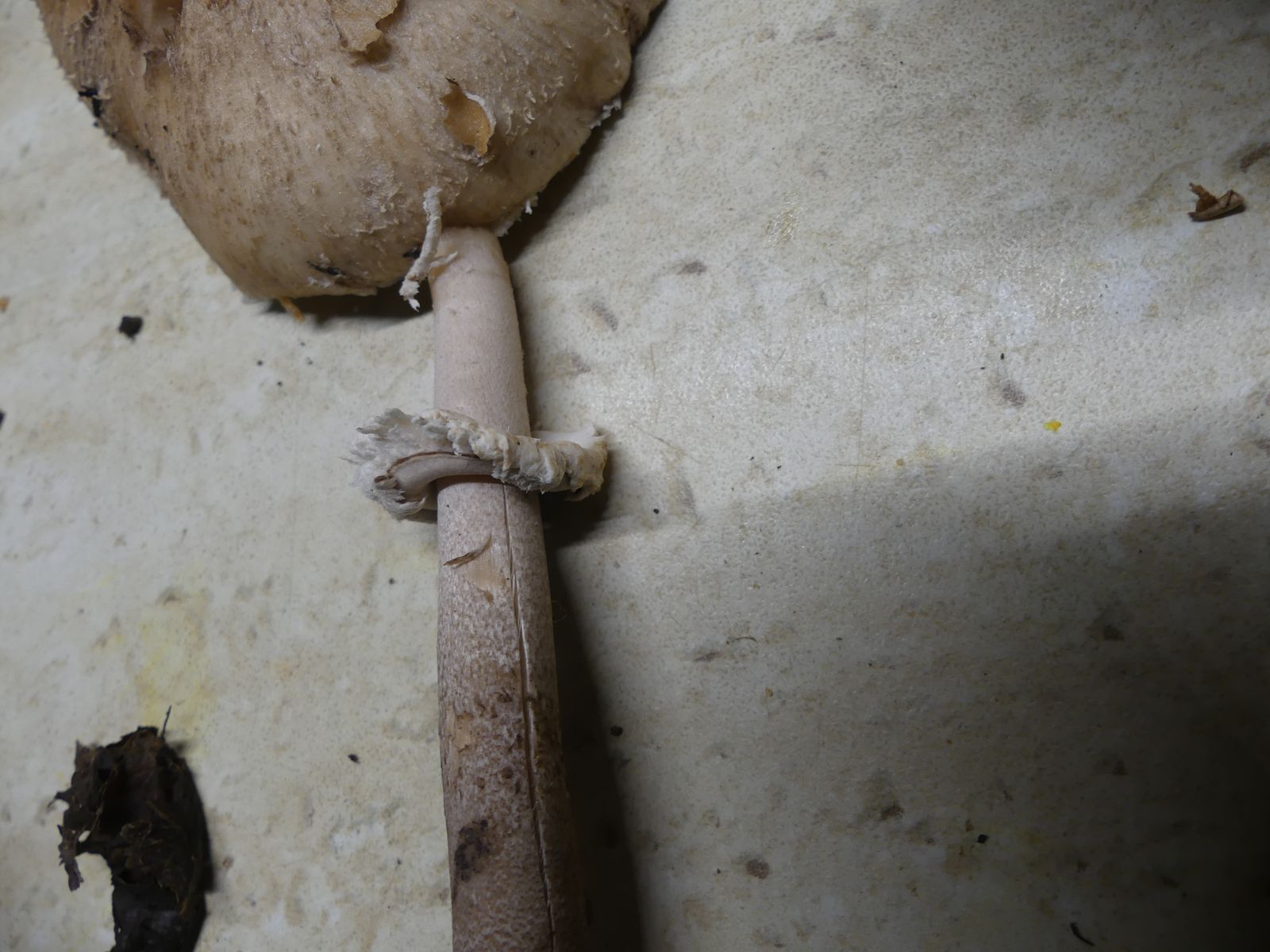 Last but not least sollten diese beiden Exemplare "normale" Riesenschirmpilze M. procera sein. Keine ausgeprägte Warze in der Hutmitte, deutlich dickere Stielmaschette und Natterung des Stiels: