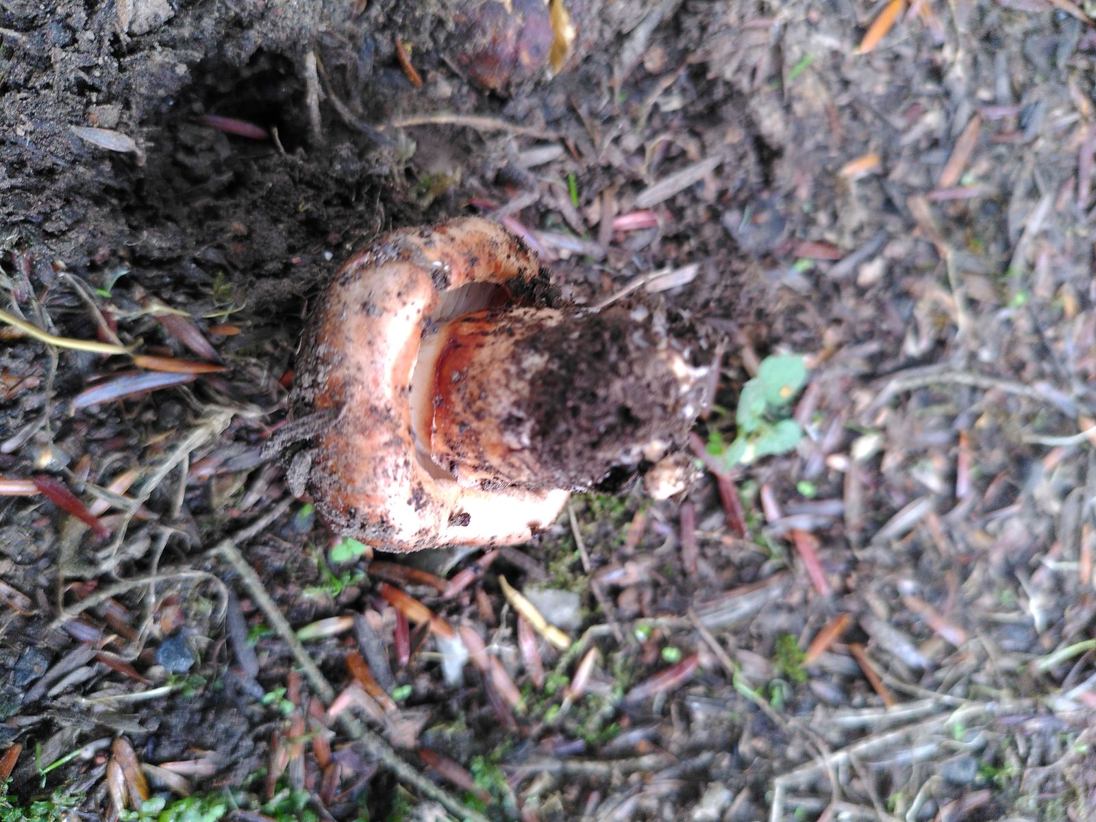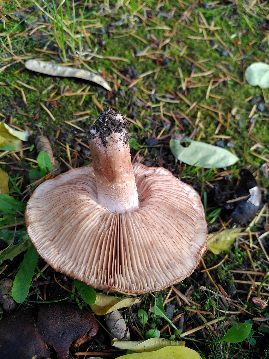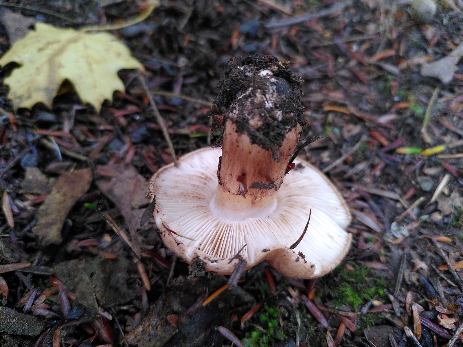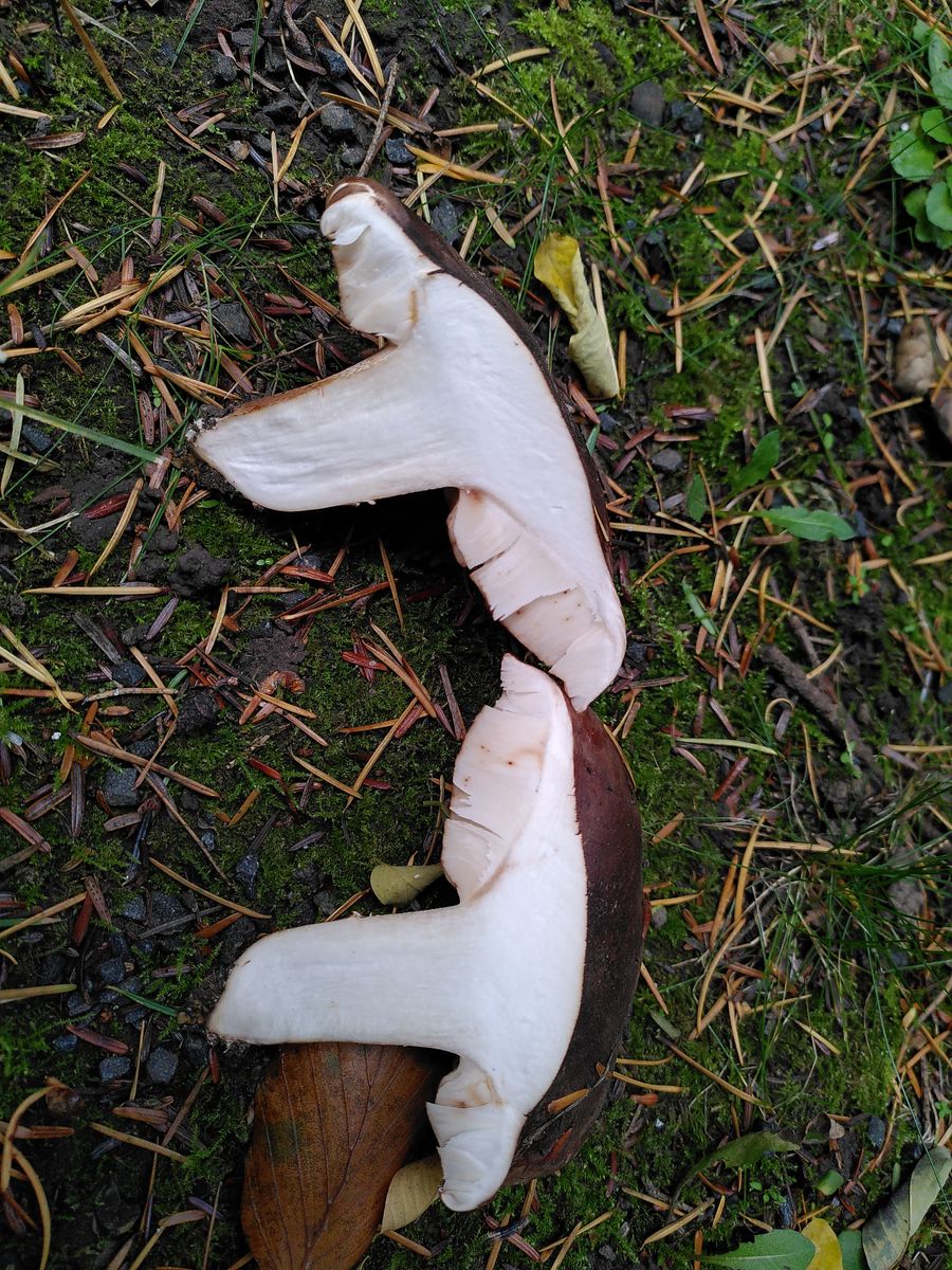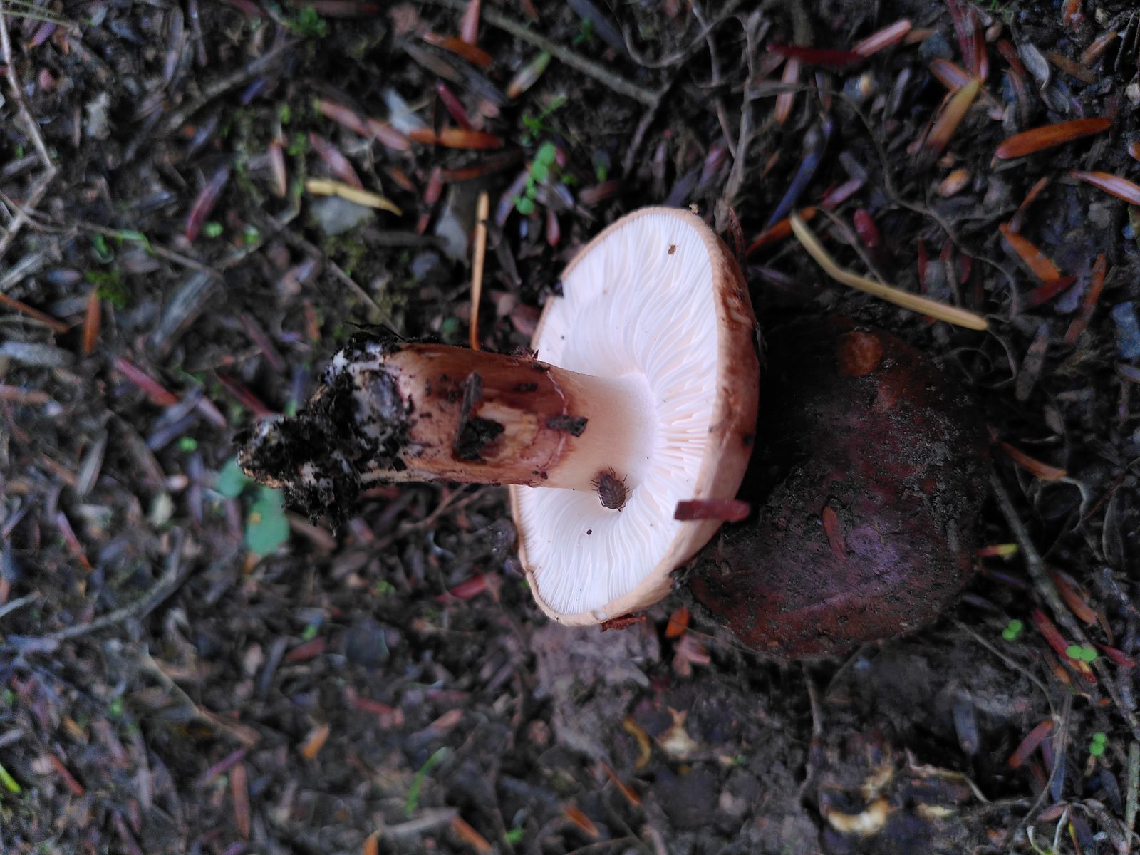 die weißbraunen Mehlstinker sind nicht leicht auseinanderzuhalten. Neben T. batschii sind noch T. striatum oder T. ustaloides in der Verlosung. Diese drei haben eine Pseudoringzone und einen abrupten Braun-Weiß-Übergang in der oberen Stielhälfte. Normalerweise hilft hier der Baumpartner weiter, aber welche Arten unter Hemlock-Tanne kommen, wüsste ich jetzt auf Anhieb nicht.