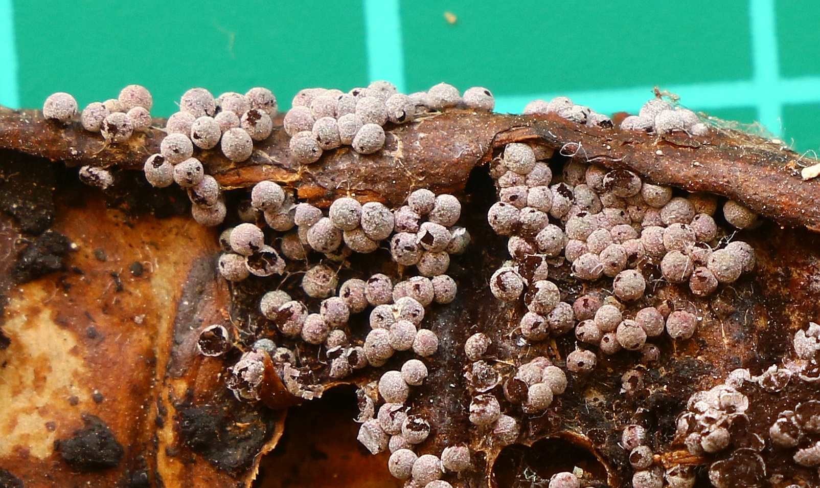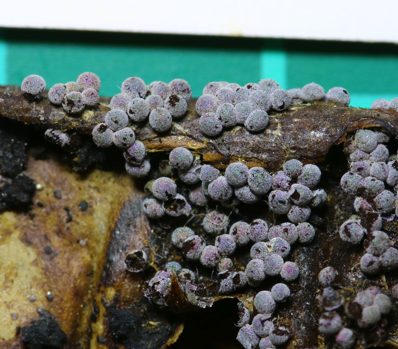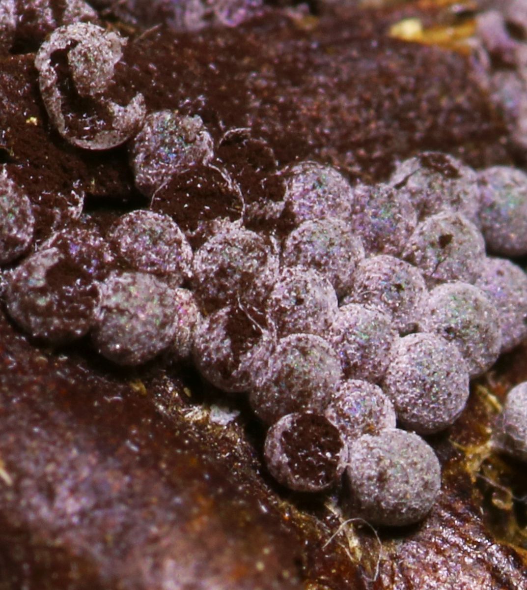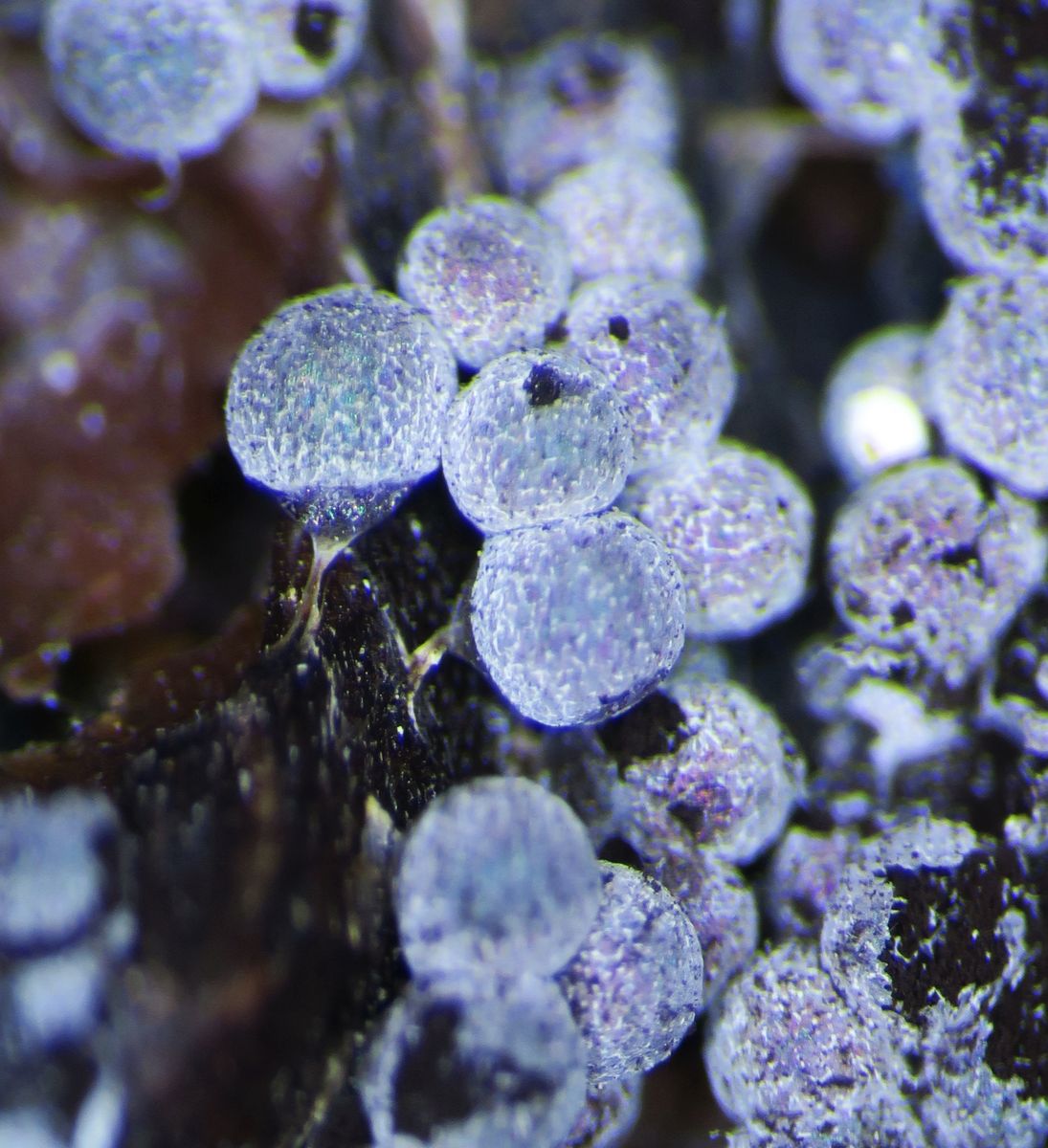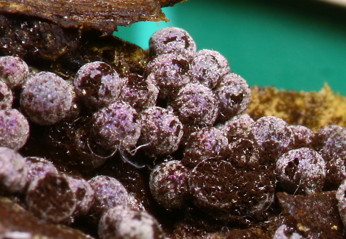 The myxocarps are about 0.5-0.9 mm across, seem spherical but a lateral view shows they have a conical blackish base and sometimes a cream-mustard pseudostipe, making some of the fruiting bodies have a pear-shape structure. Interestingly the lime on the peridium is not thick, rather vein-line with nodules scattered here and there and overall, the peridium is moderately irridiscent esp. in artificial (LED) light.
