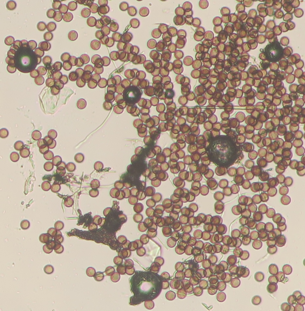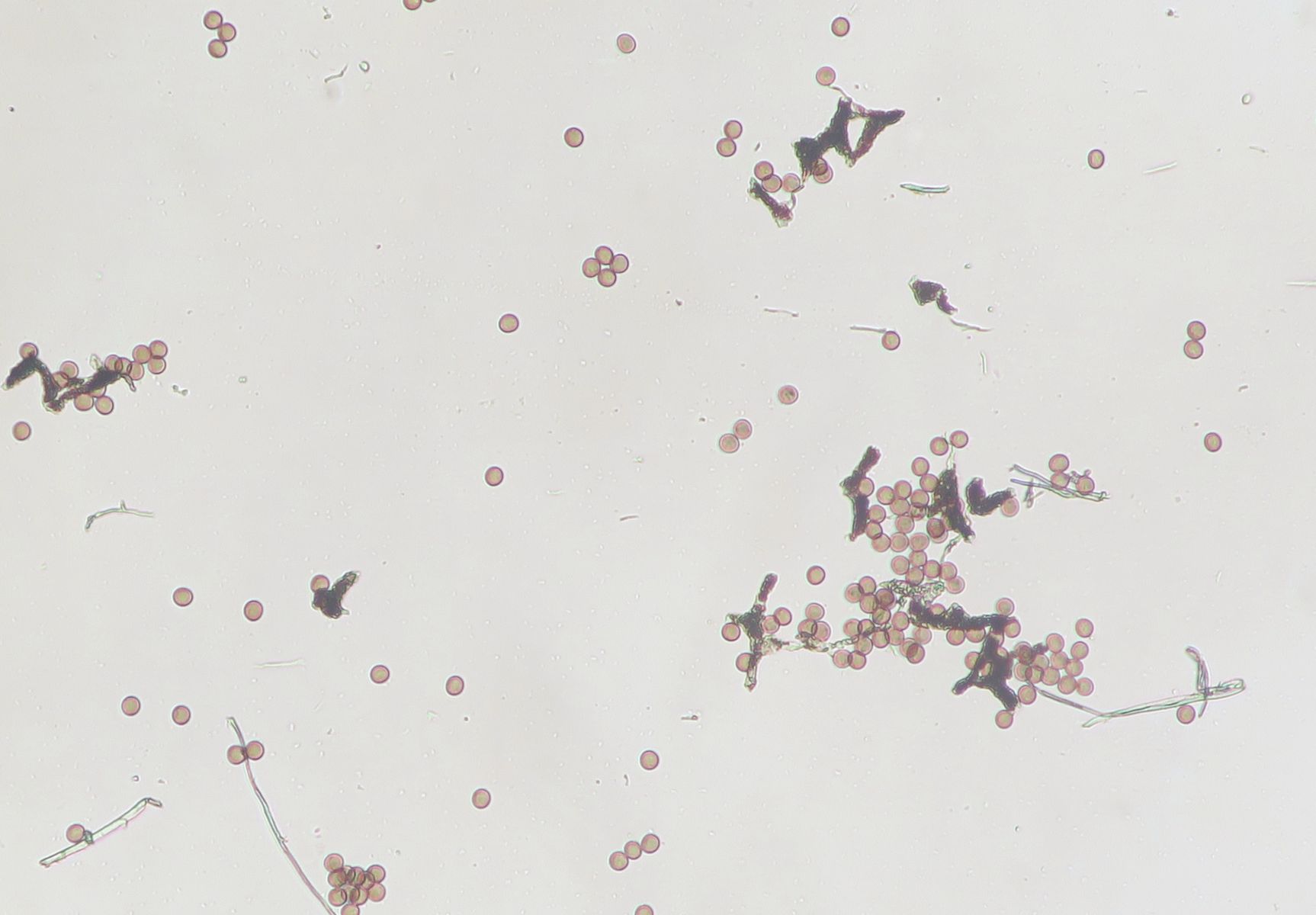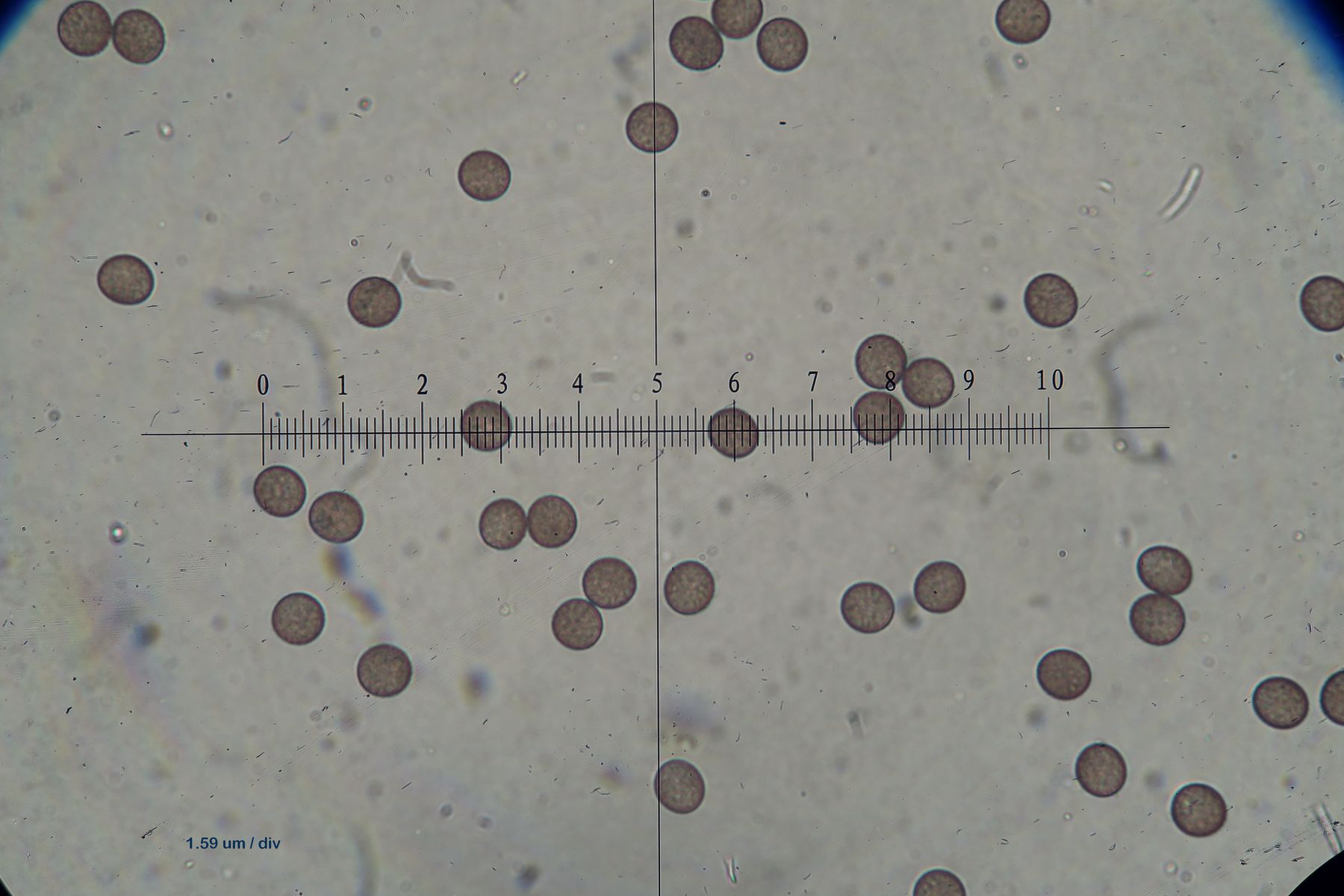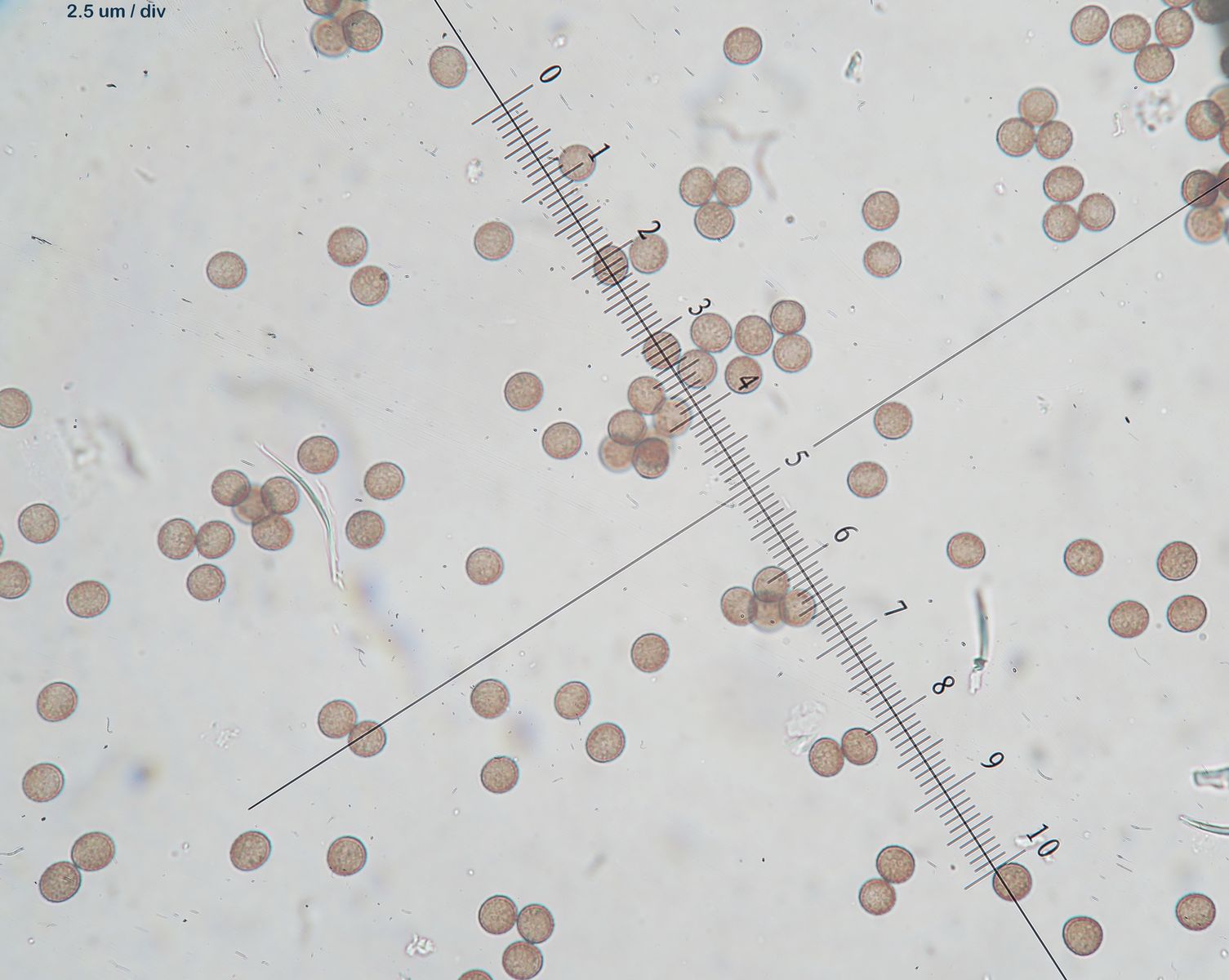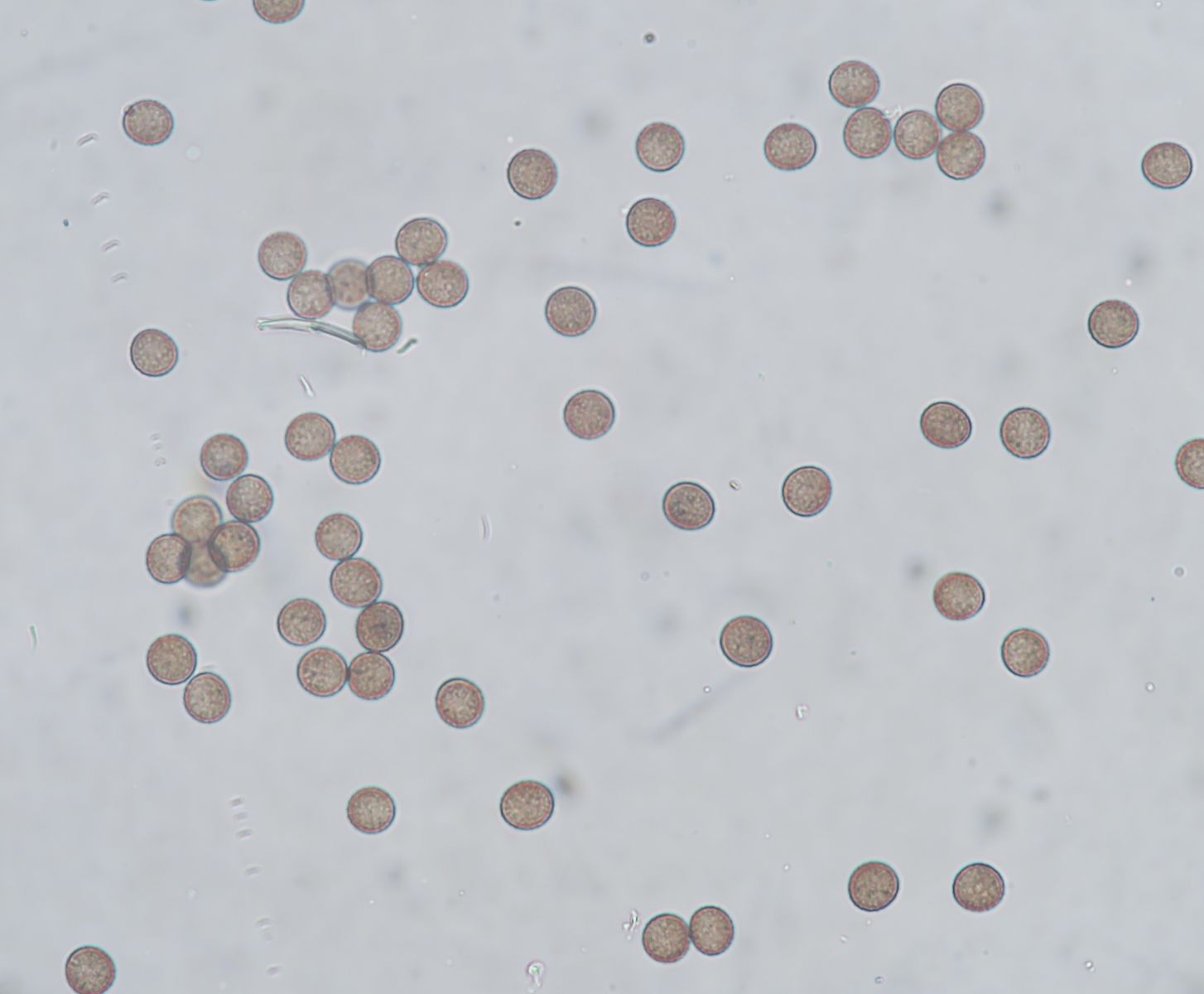 The spores are globular, spinulose-punctate with very tiny dot-like projections rather than warts of spines, evenly distributed without dark or pale patches or lines or irregular patches whatsoever. They measure (8.5)9.0-10.0(10.5) um across, rather homogenous.