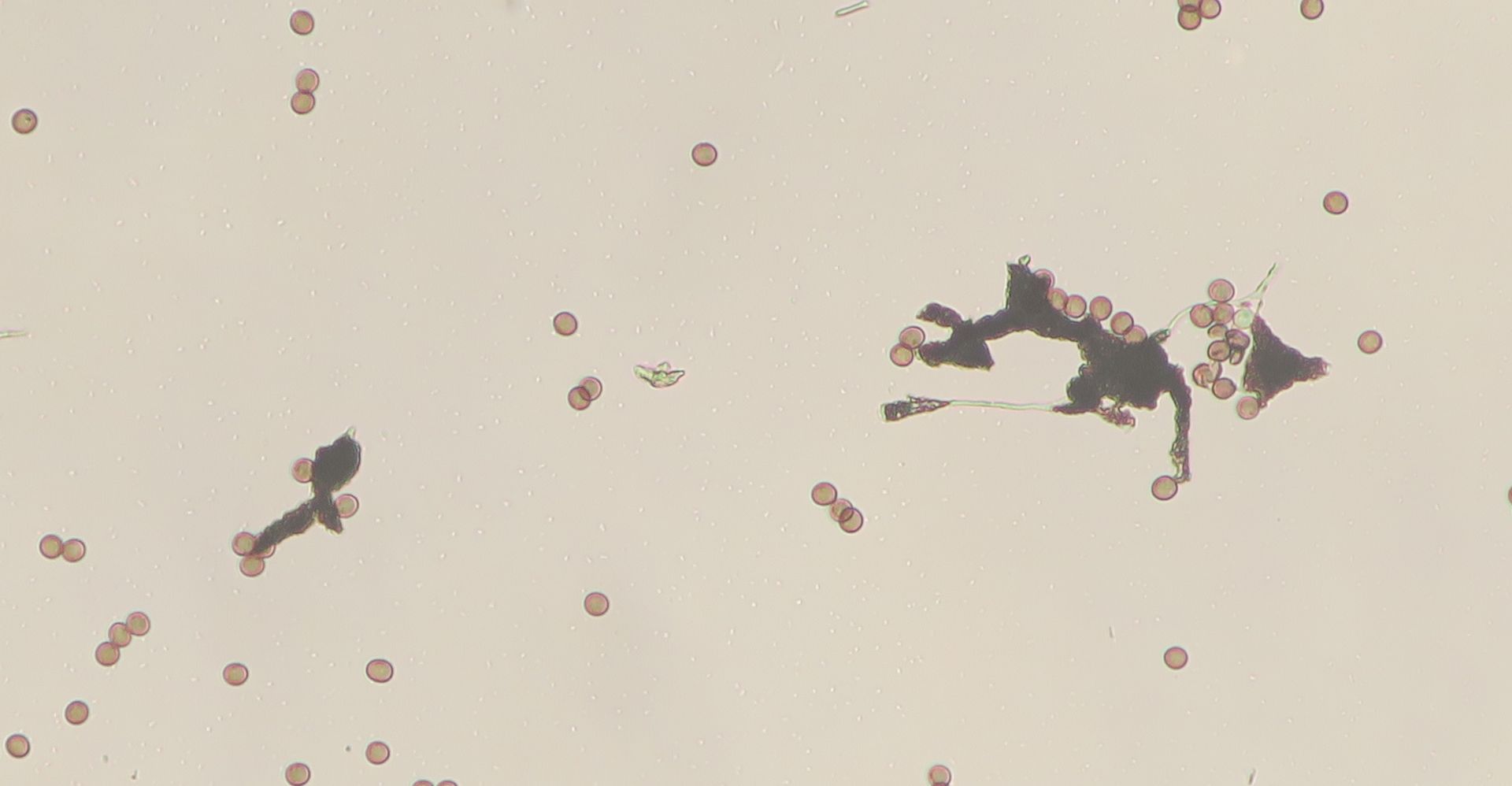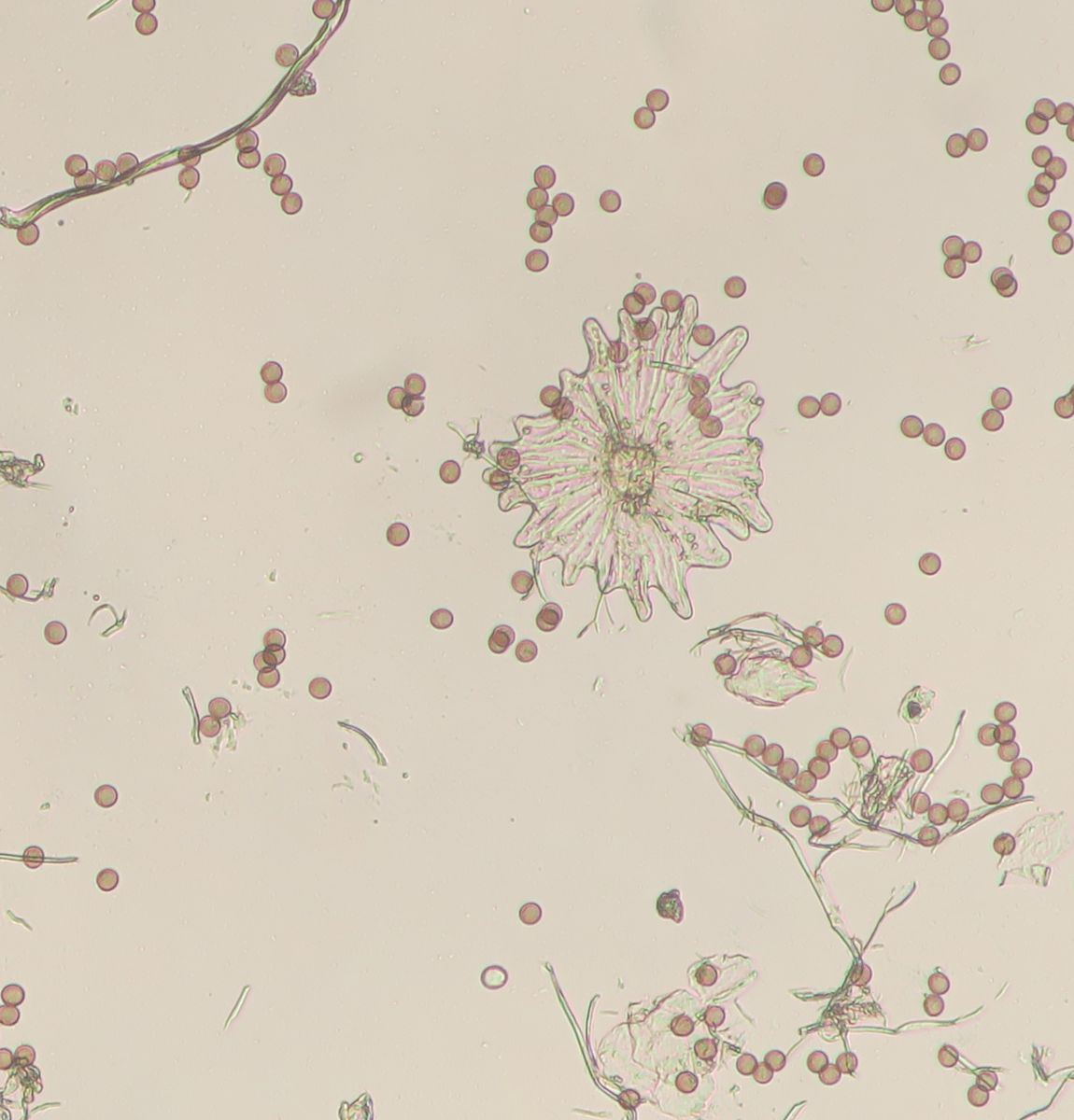 Essentially, the structure is made of columnar lime with various Y-shaped particles but also with fine, hyaline threads from them. For me, it is more a Badhamoid capillitium, but not sure.