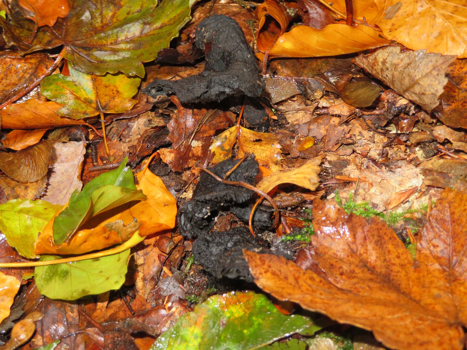 Ich hatte dieser Tage von einer "Kurzexkursion" (Spaziergang) in den Wald berichtet, wo leider kurz nach Fund & Fotos eines Igel-Stachelbarts die Speicherkarte krepiert war. Bin jetzt nochmal hin, u.a. wegen dieser merkwürdigen, schwarzen Pilze. Die sind alle schon über den Zenit hinaus gewesen, einige schienen schon zu zerfallen. Aber alle waren gleichmäßig kohlrabenschwarz.