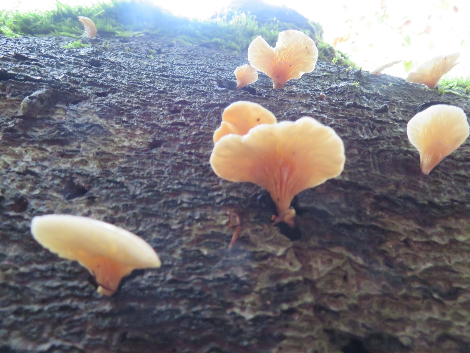 Aus der "Ferne" dachte ich "Super, kleine Austernpilze". Aber aus der Nähe war ich mir da nicht mehr so sicher. Die sind auf den Bildern alle +/- so groß wie eine 1-Euro-Münze, höchstens wie eine 2-Euro-Münze. Und die zwei, die ich zum Fotografieren vom Holz gelöst haben, ließen sich sehr leicht lösen.