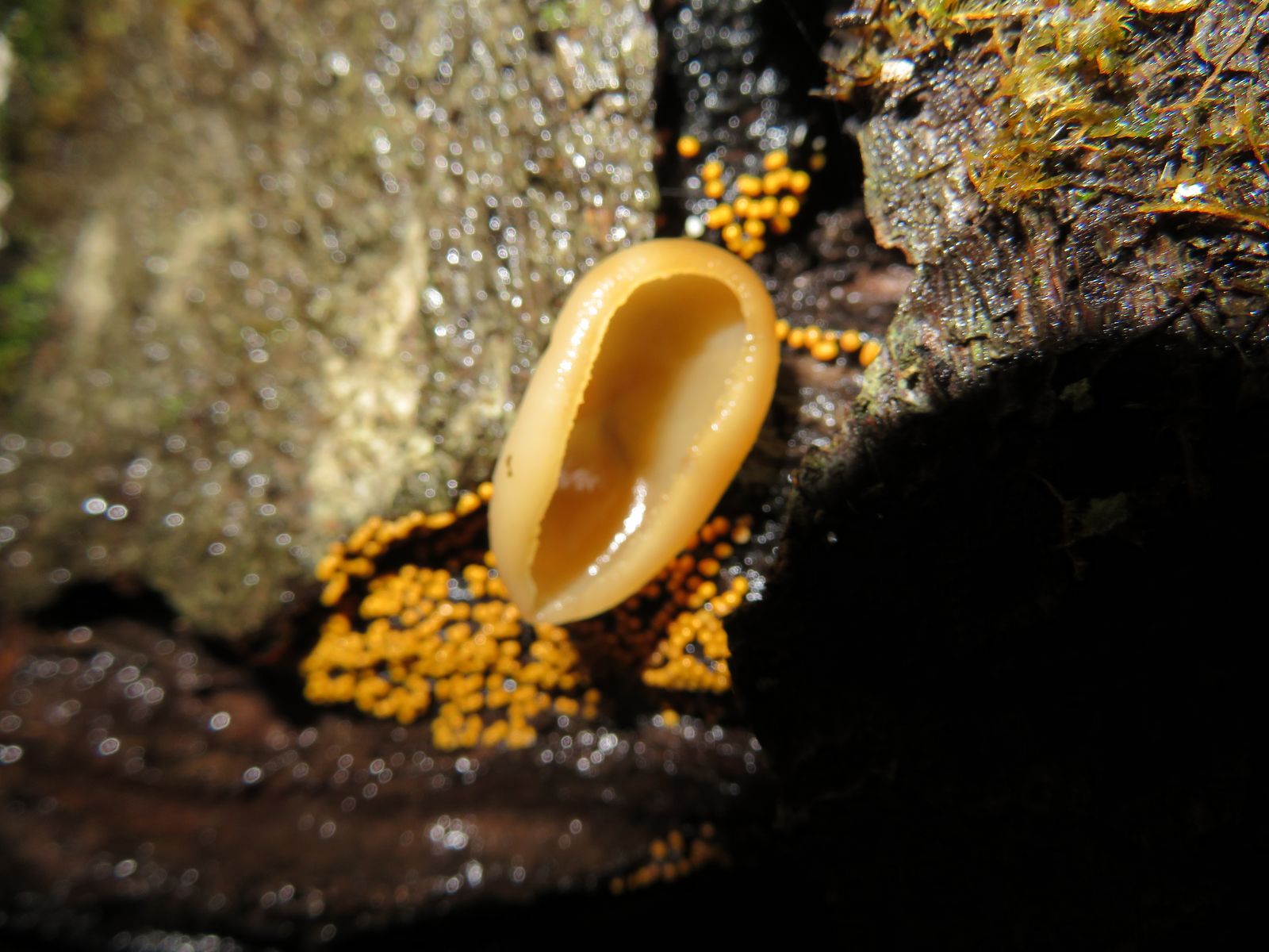 verstehe ich richtig, dass die "Öhrchen" (Peziza?) und die gelben Kügelchen nicht zusammen gehören? Im Kosmos finde ich keine irgend wie ähnliche Peziza,