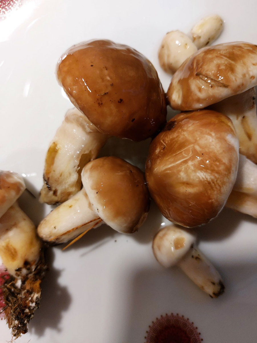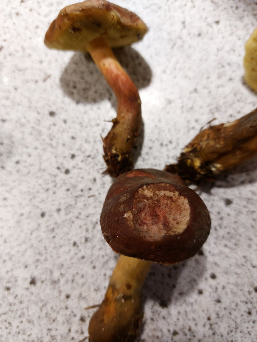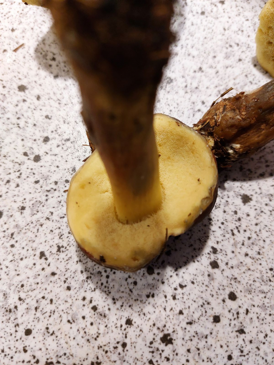 5) Wuchs im Nadelwald neben Fliegenpilzen. Ältere Exemplare bekommen sehr dunkelbraune Röhren. Röhren sind leicht vom Hut zu trennen wie zu sehen an dem älteren Exemplar.