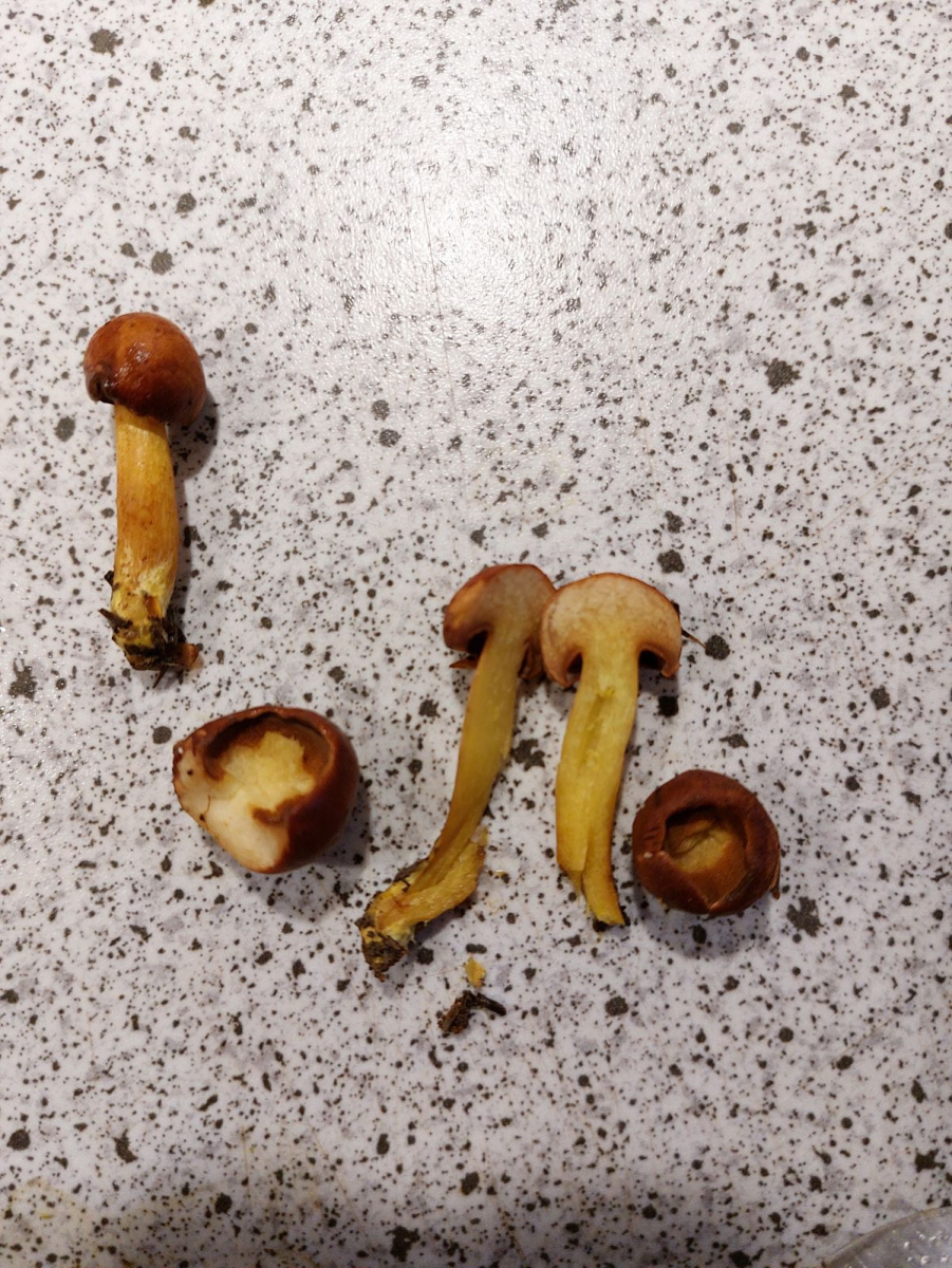 Nr. 1 sind in der Tat junge Butterpilze. Deren Hut wird erst bei genügend Lichtkontakt braun.