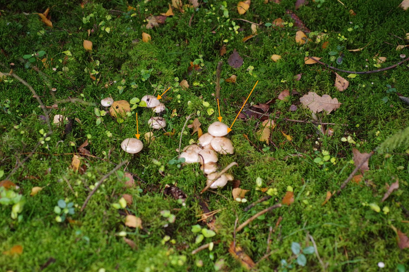 Die Farbe ist von weiß auf elfenbein zu korrigieren. Die Mehrheit der Pilte ist im Hutgrößenbereich 4...6 cm mit einem Maximum von 10 cm. Begleitbaum ist ziemlich sicher Fichte, der Bestand zieht sich in einen dichten jungen Fichtenbestand (nicht gepflanzt, natürliche Verjüngung) hin.