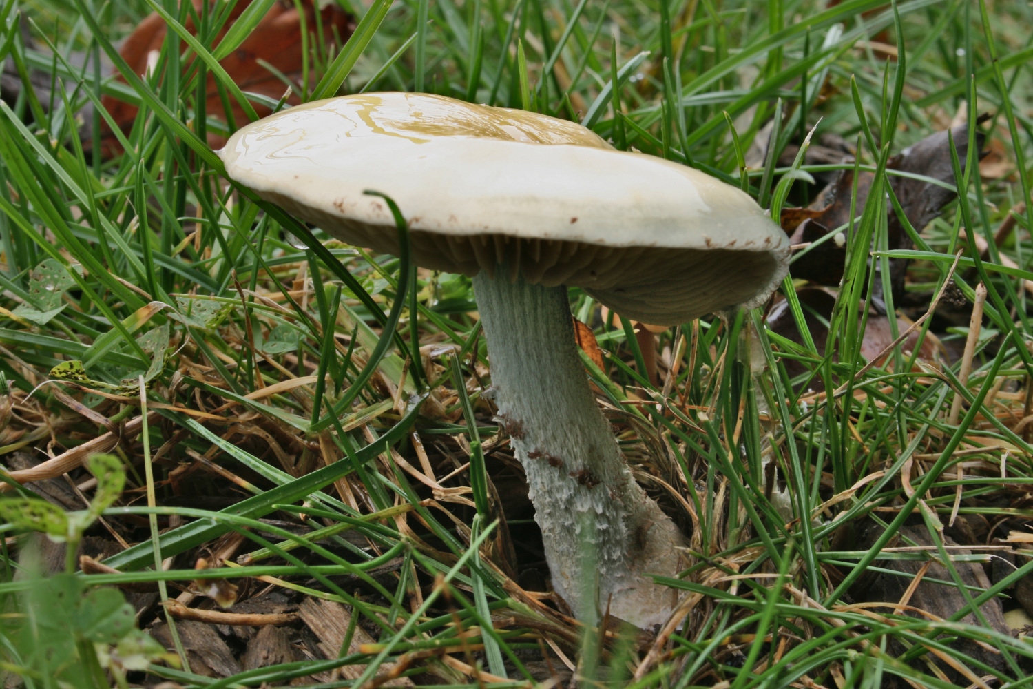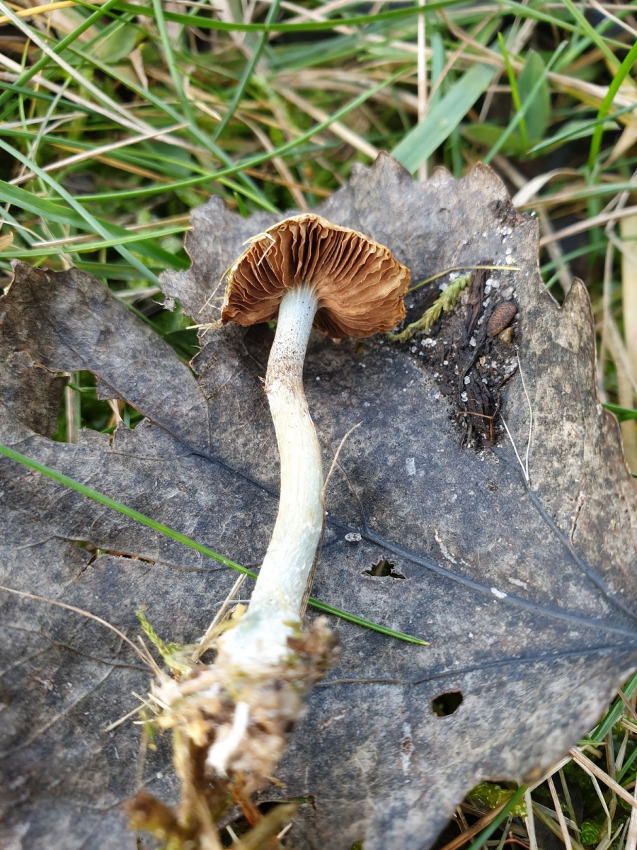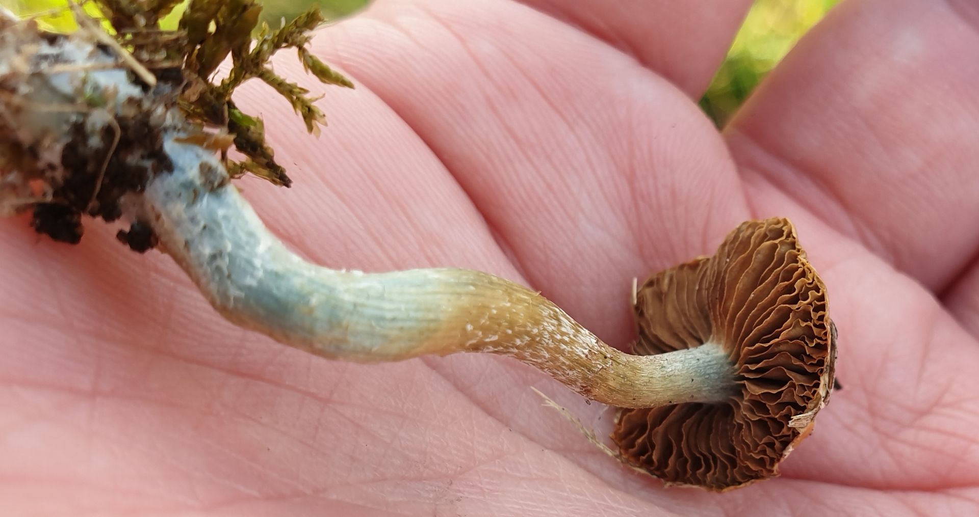 Beim näheren Anschauen offenbarte sich ein sehr hübscher metallisch-blaugrün gefärbter Stiel (auf den Fotos kommt es leider weniger intensiv rüber) mit weißen "Flöckchen" und in der Mitte zudem bräunliche Farben, evtl. vom Sporenpulver.