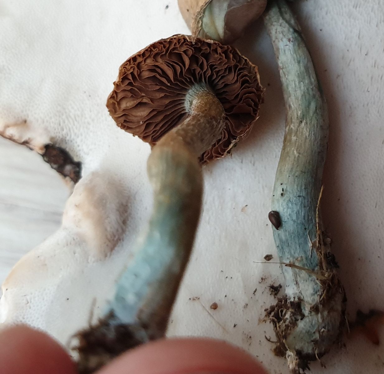 Ich kann leider nicht sagen, ob der Stiel von vorherein blaugrün war oder sich durch Berührung verfärbt hat.
