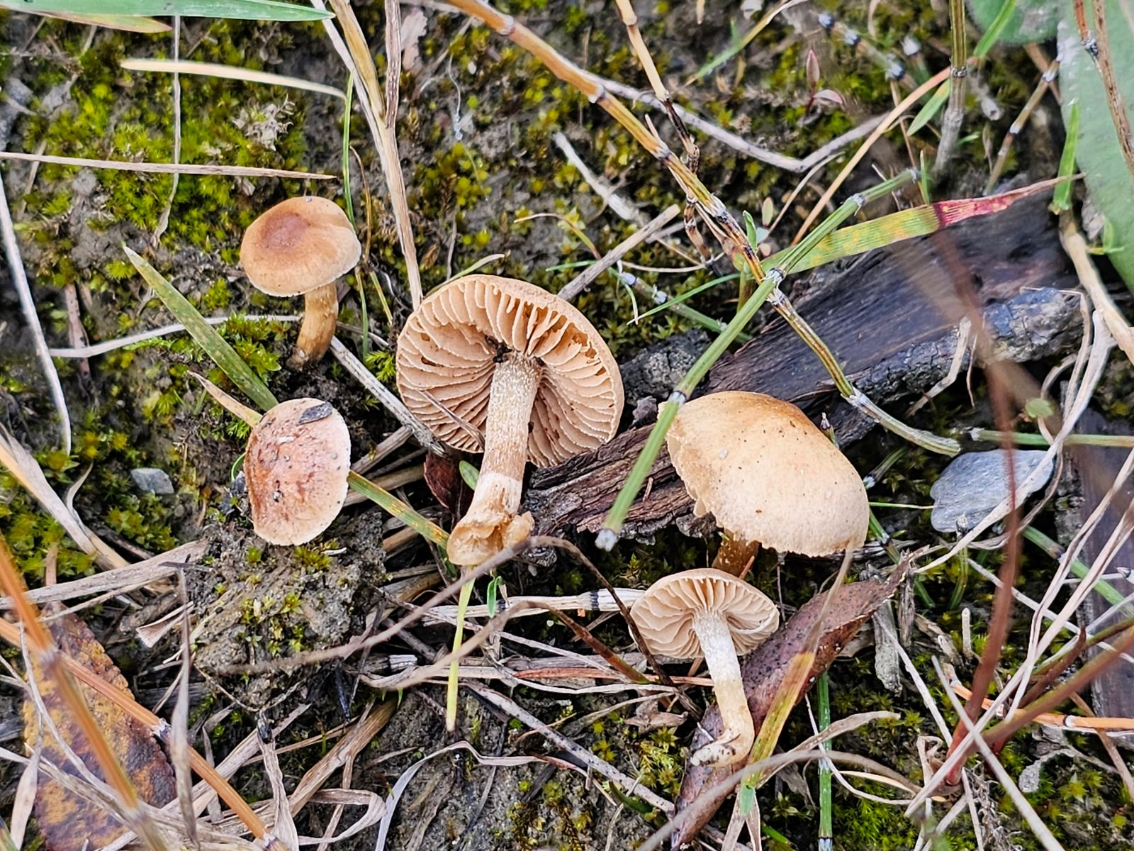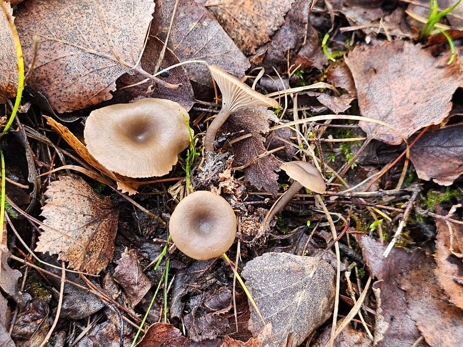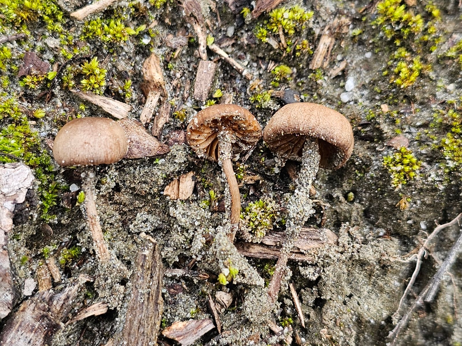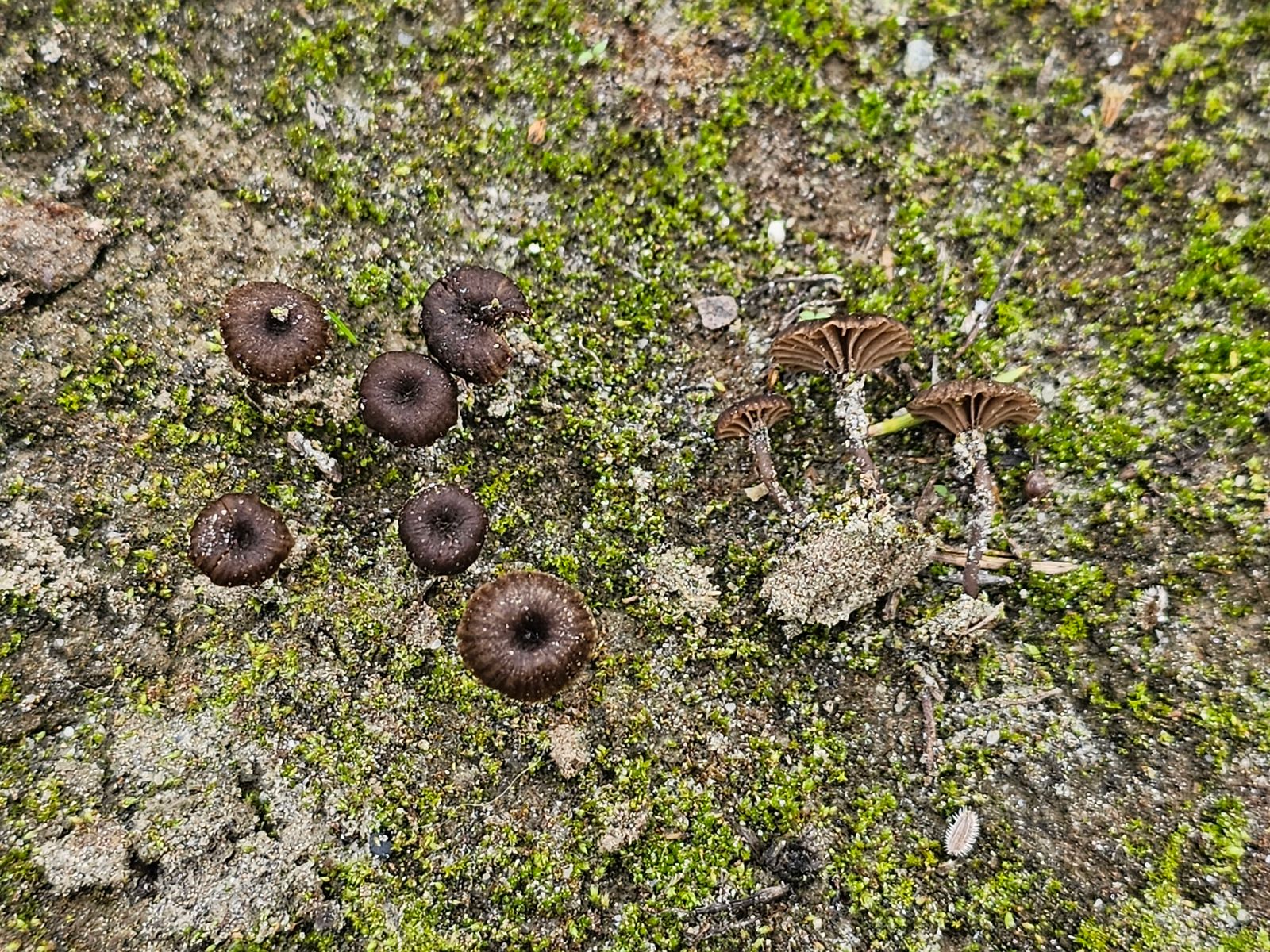 An dunkler Nabeling zwischen Pionier-Vegetation. Arrhenia obscurata.