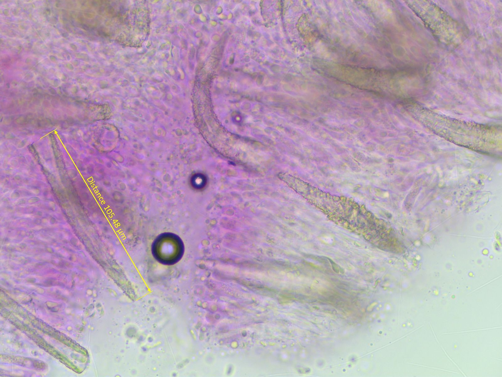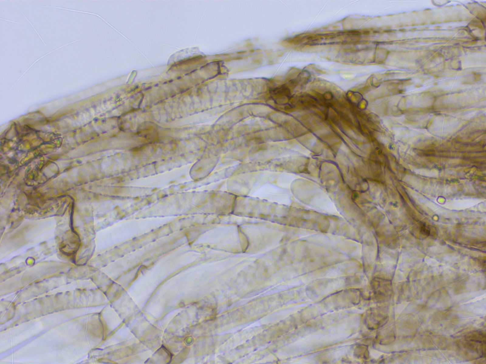 Was am Holz langweilig aussieht, ist unter dem Mikroskop umso schöner: Riesige, kristallisierte Lamprozystiden (hier in SV)
