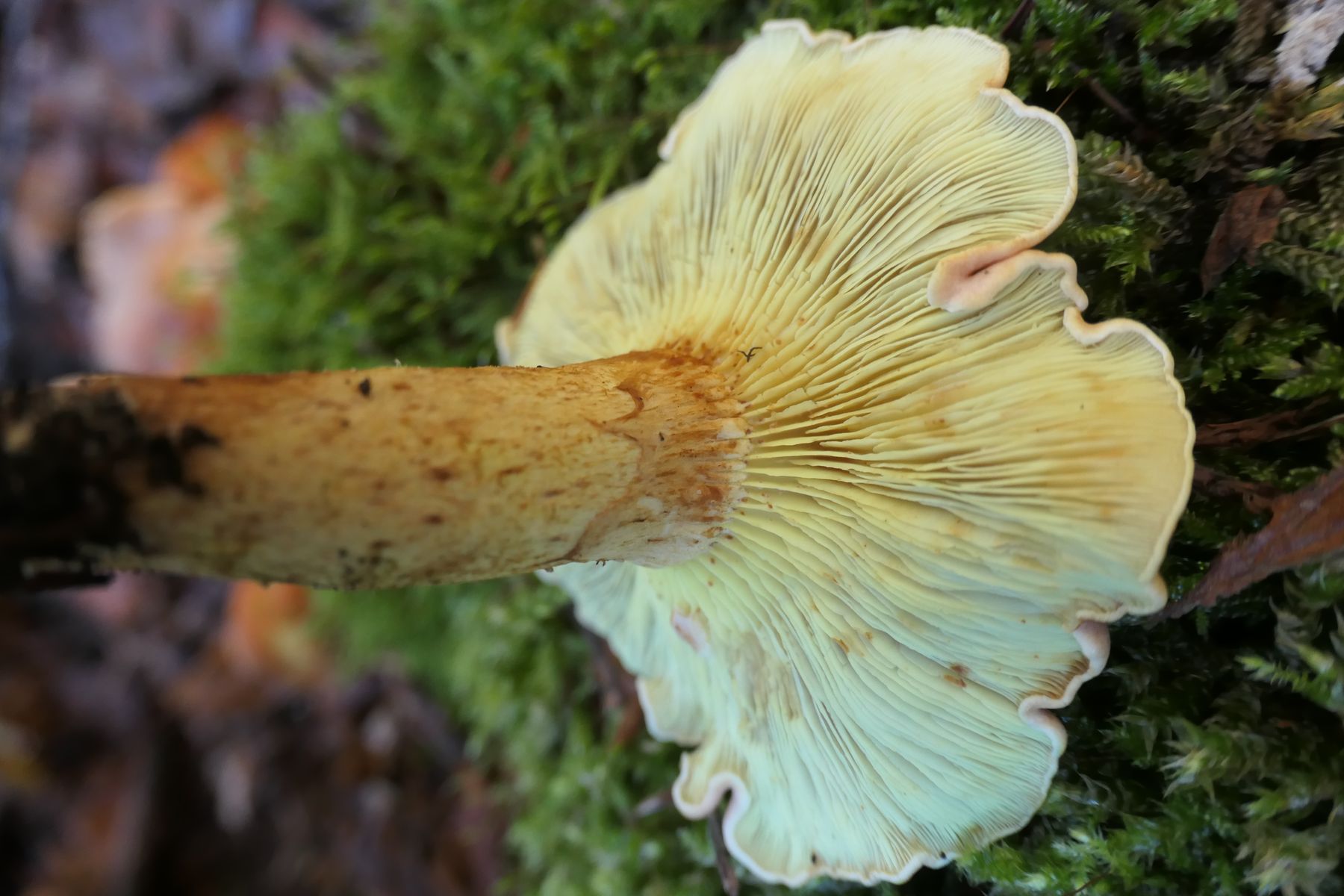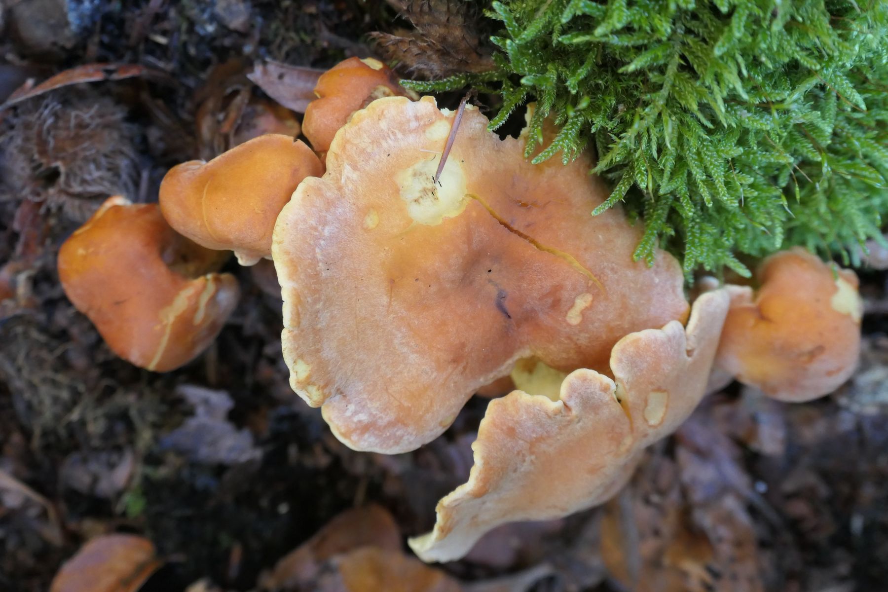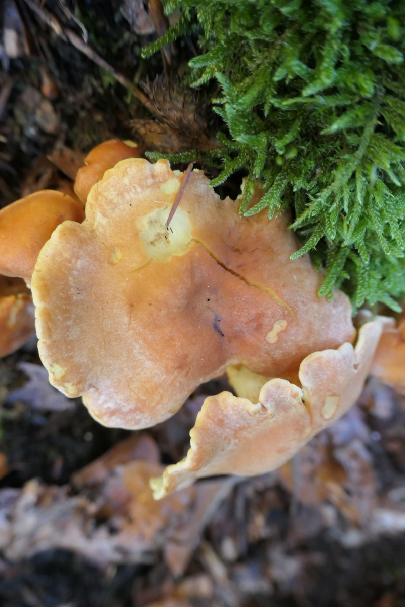 an kaum mehr zu erkennendem verrottetem Baumstrunk, auffällig gewellter Hutrand;