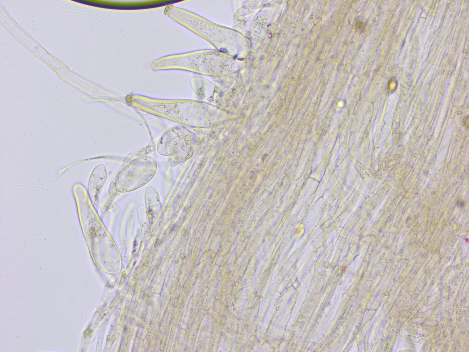 Stiel auf ganzer Länge bereift, mit zahlreichen Kaulozystiden und Parazystiden.