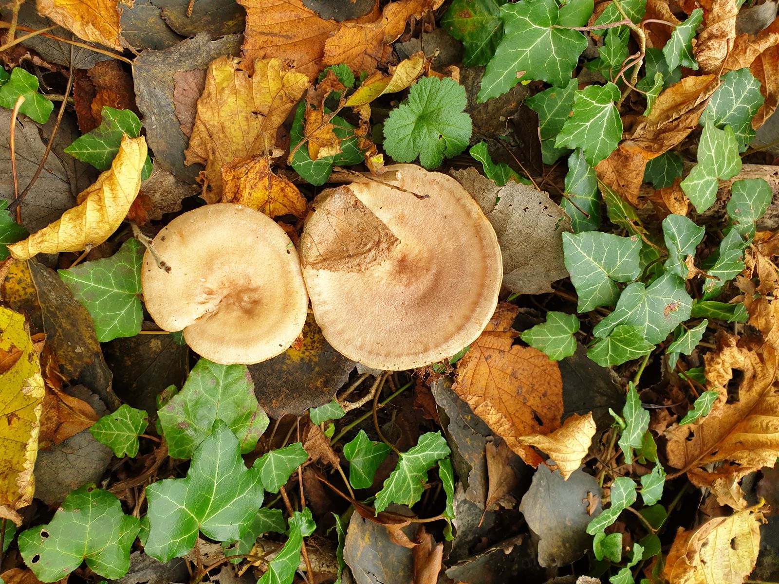 Beide verstreut jeweils zu mehreren in kleinem Espen-Hain (eingestreut auch ein paar Eichen & Weißdorn), mit bodendeckendem Efeu und Espen-Rotkappen.