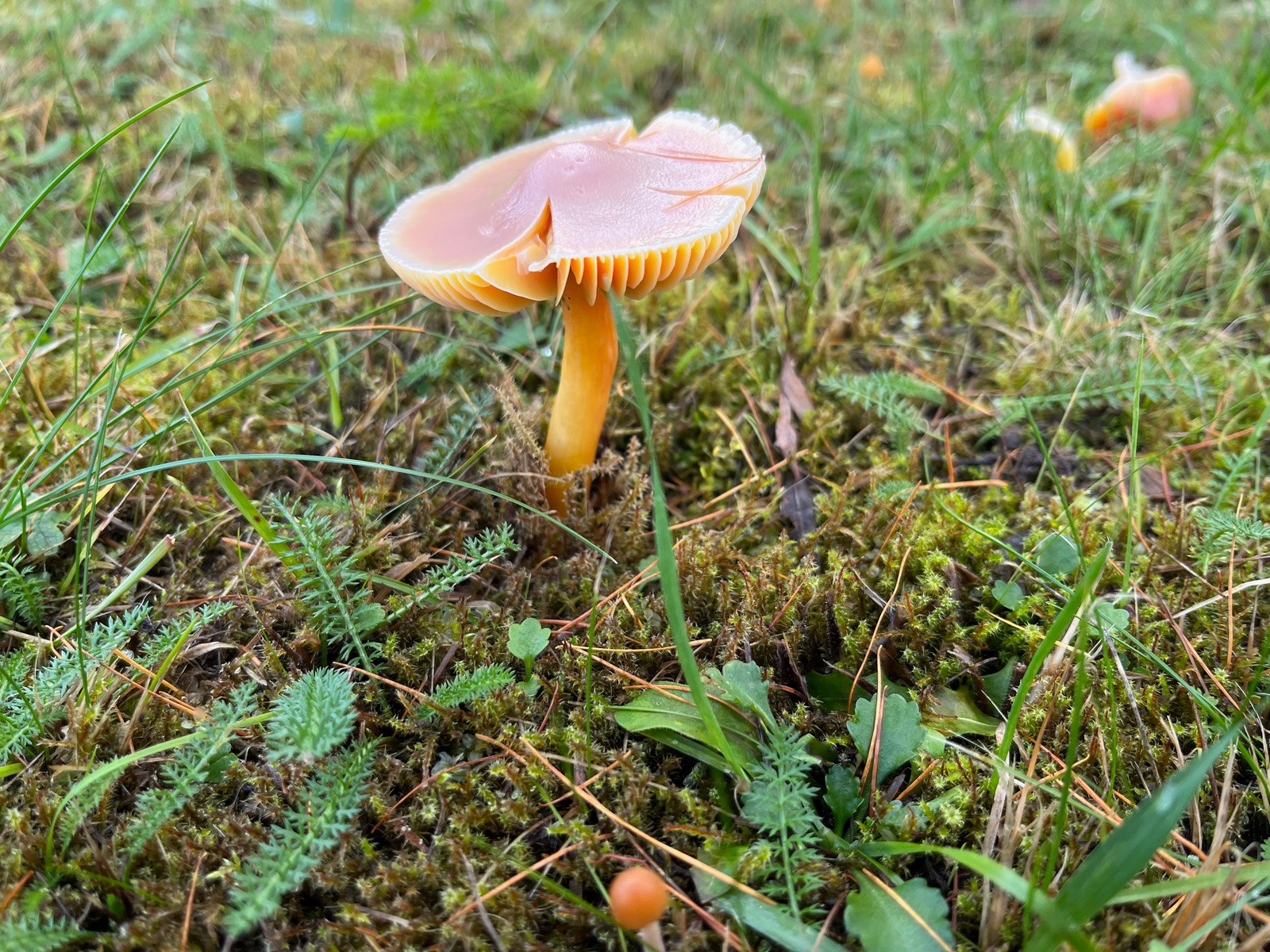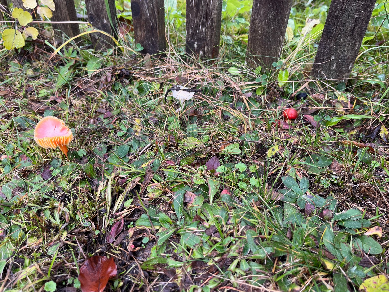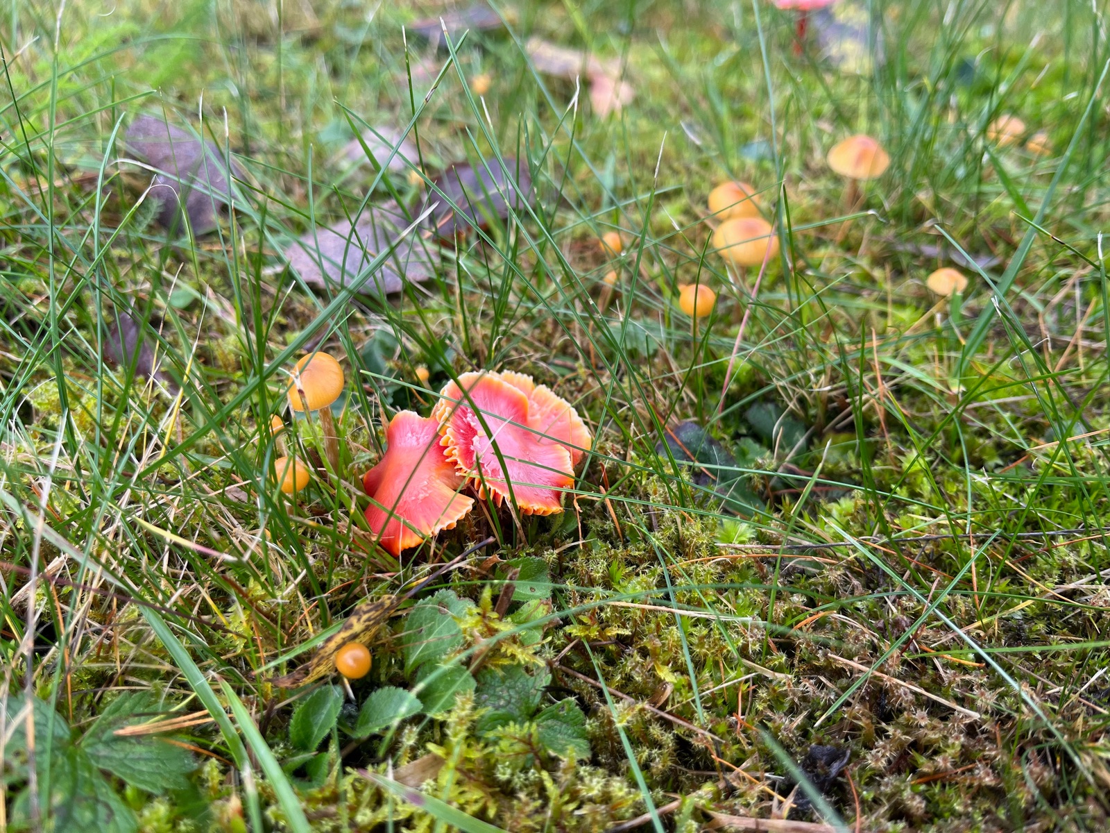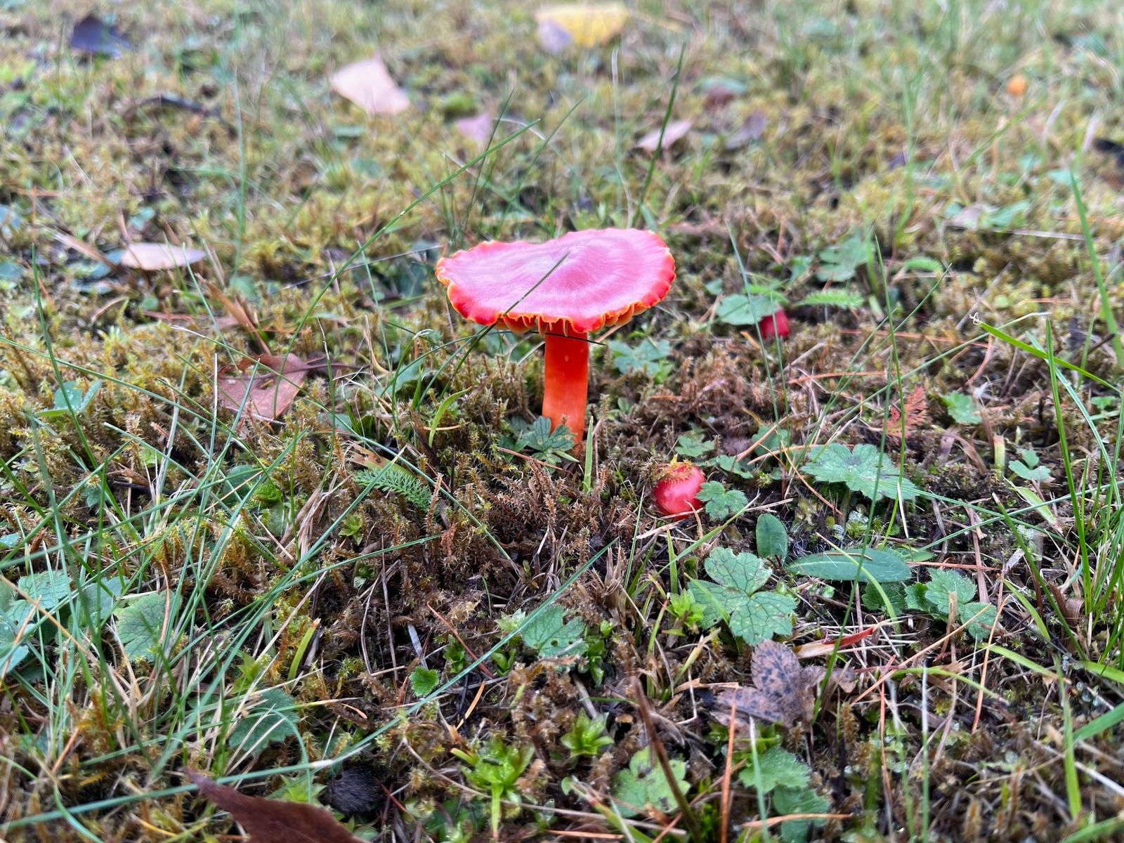 im allgemeinen Chaos, das gerade über mich hereingebrochen ist, wurde nun auch noch der Pilzspürhund krank. Auf dem Weg zur Apotheke habe ich mir eine kurze Chaos-Auszeit gegönnt und einen Blick auf meine Lieblingssaftlingswiese geworfen, die am Weg liegt. Erstaunlich, wie bunt sie am 11. November war. Neben zahllosen wässrigen und überständigen Saftlingen gab es viele ansehnliche Exemplare. Das baut auf. Das ist übrigens dieselbe Wiese, auf der die Glänzenden Orangesaftlinge vor wenigen Wochen dem Gemetzel der Gemeindearbeiter zum Opfer gefallen waren. Wie rasch sich die Funga erholt, wenn lediglich die Fruchtkörper und nicht das Habitat zerstört wird, lässt mich angesichts der generellen Entnahmeverbote aller Hygrocyben schmunzeln.
