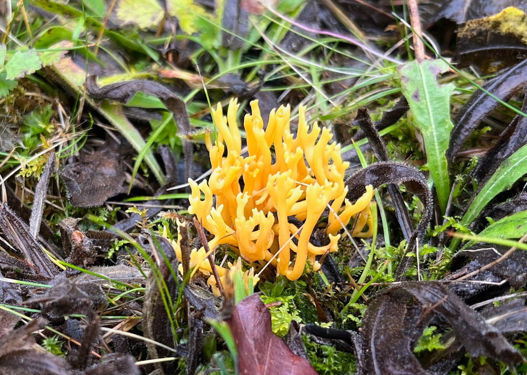 5. Ein sehr spätes und außergewöhnlich dunkel gefärbtes des Exemplar des Glänzenden Orangesaftlings-Hygrocybe aurantiosplendens war frisch gewachsen.