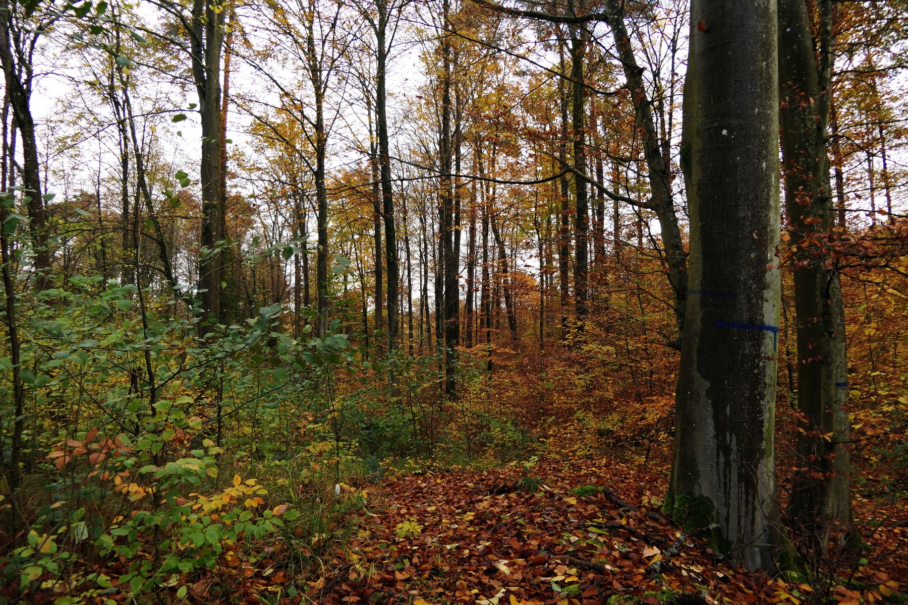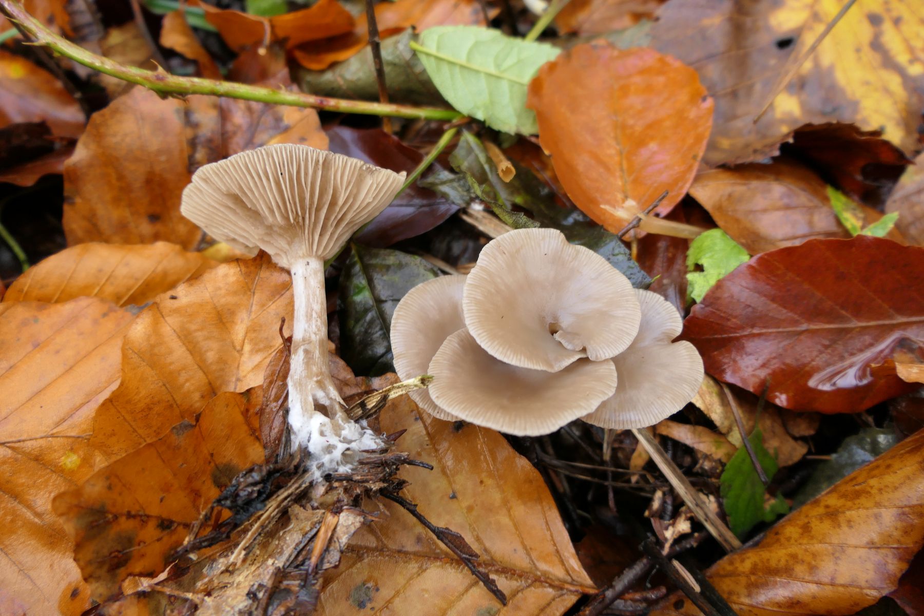 Unter eine Rotbuche am Rande eines Waldweges wuchsen in der Streu zwischen Schopftintlingen und Ritterlingen einige unscheinbar graubraune Pilzchen mit stark geriffeltem Hutrand.