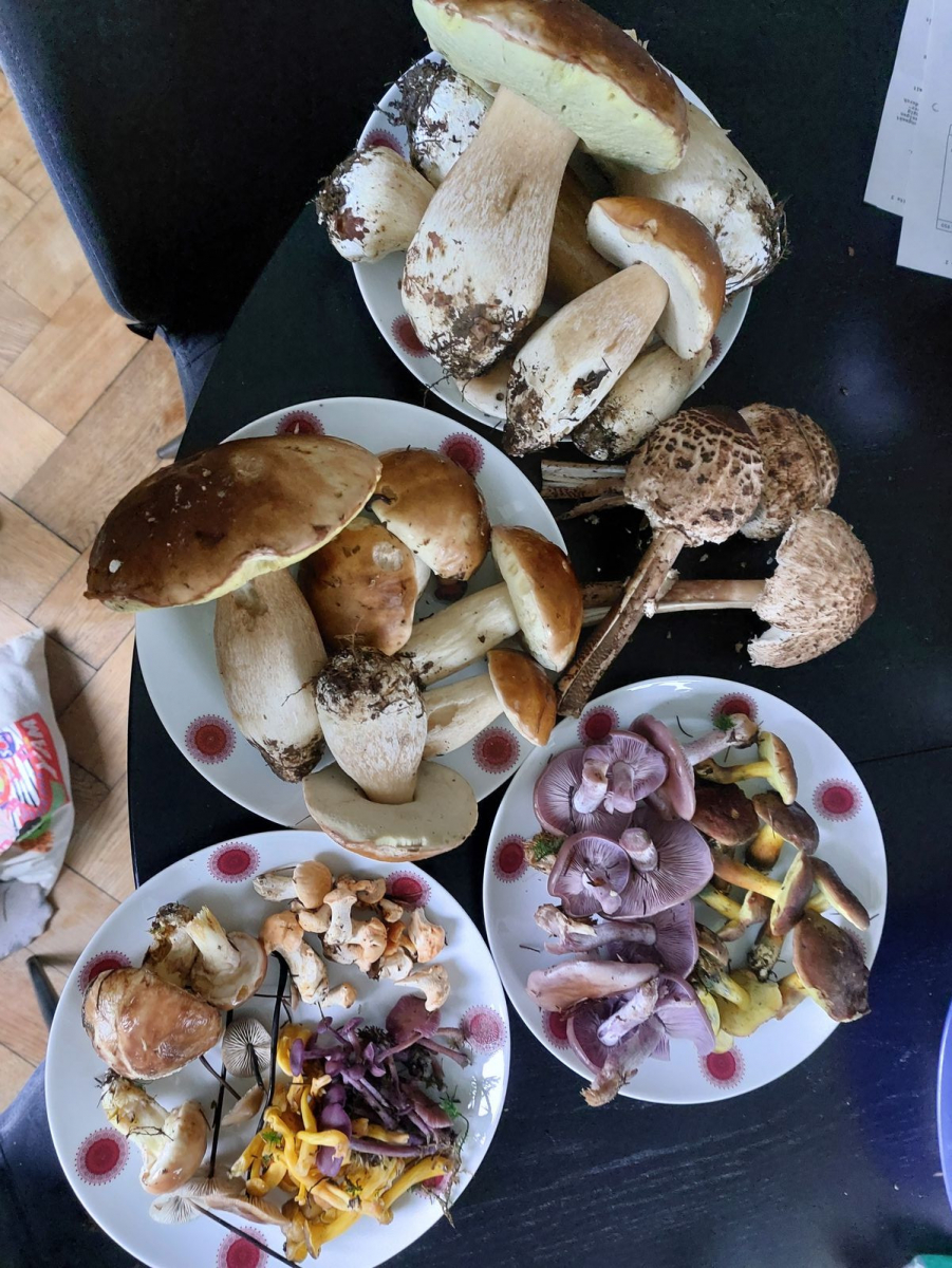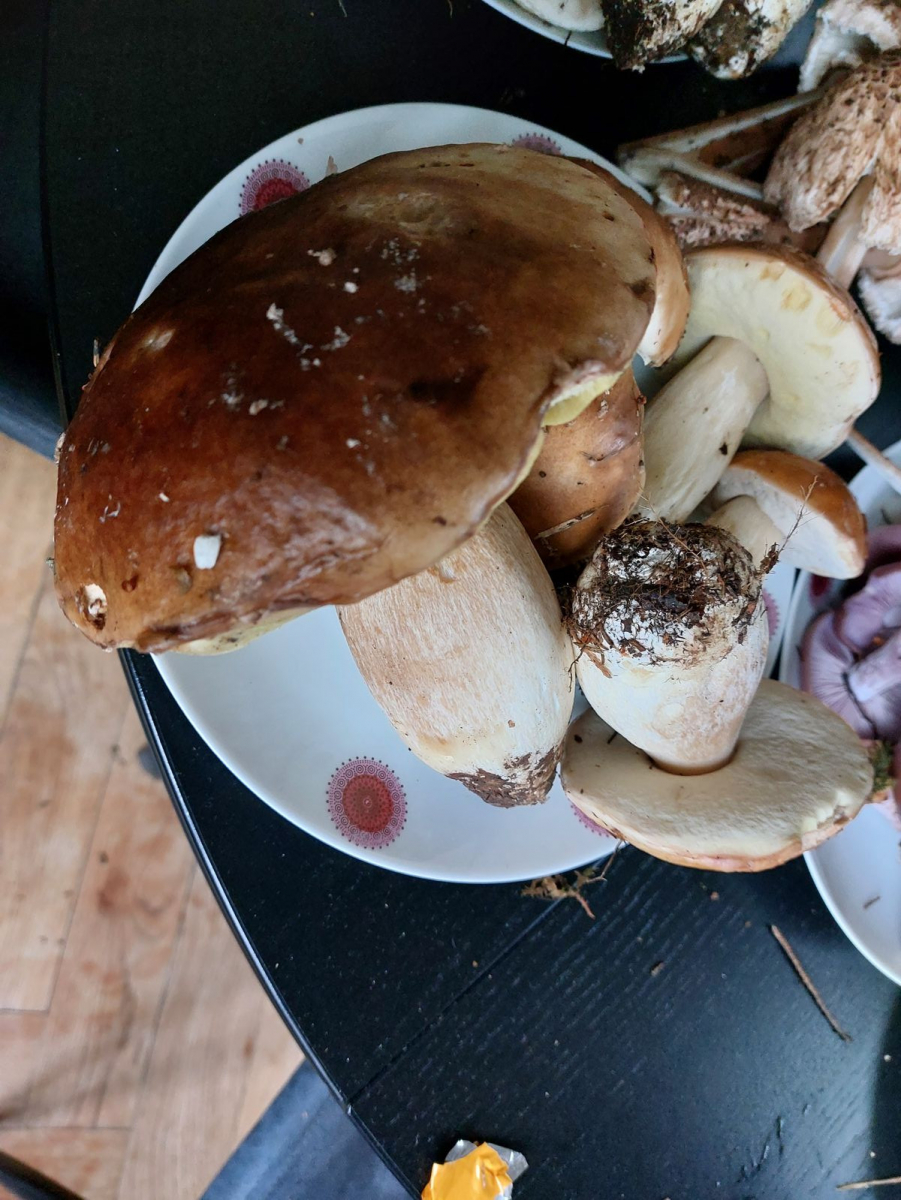 Nachfolgend die Vielfalt einer einstündigen Waldrunde mit Steinpilzen, Trompetenpfifferlingen, etwas Parasole, Violetten Rötelritterlingen, Rotfußröhrlingen, Lacktrichterlingen, Knoblauchschwindlingen, Butterpilzen und Semmelstoppelpilzen.
