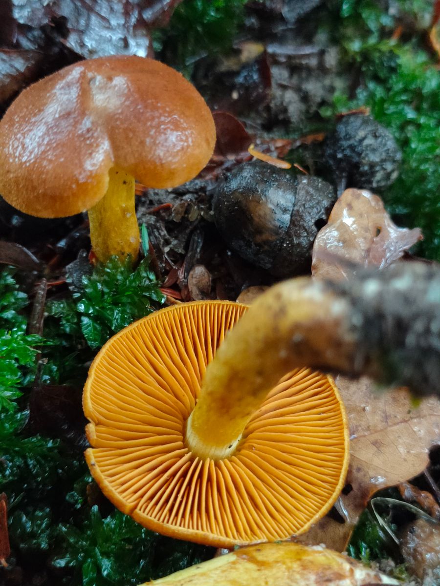 • Ich konnte heute wieder einen interessanten Fund machen. Diesen halte ich aufgrund der Lamellenfarbe für Cortinarien. Die Struktur der Huthaut war aufgrund des anhaltenden Regens schwer zu bewerten. Die Lamellen haben eine deutliche gelb/orange-braune Färbung und ich finde die Reise könnte Richtung Hautkopf gehen.