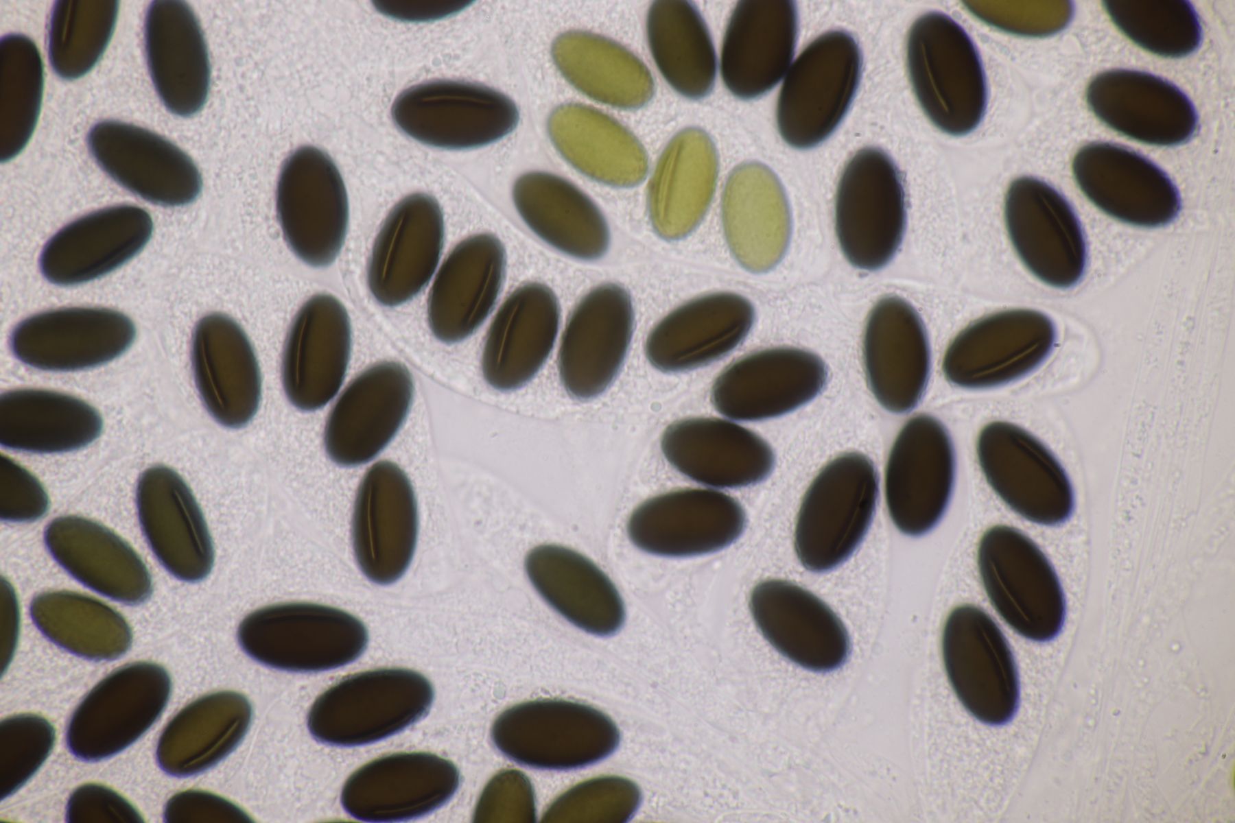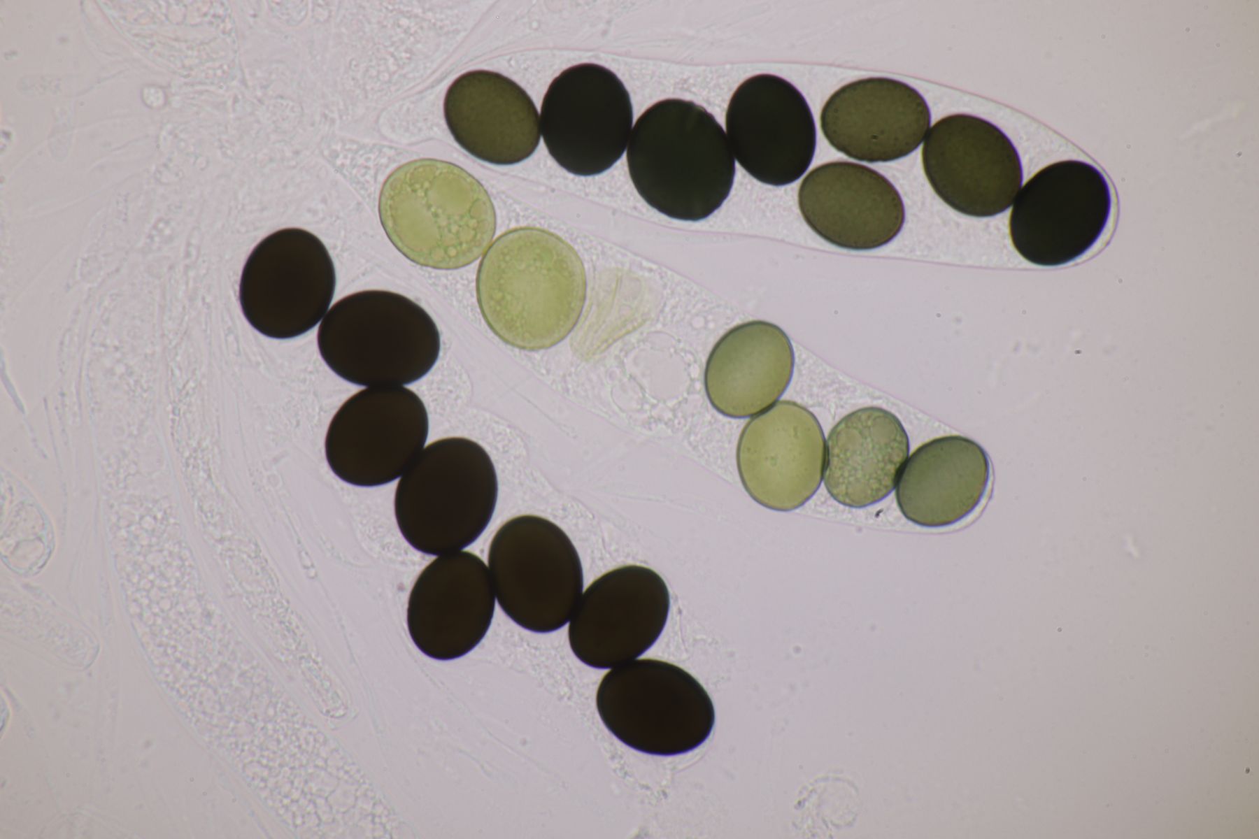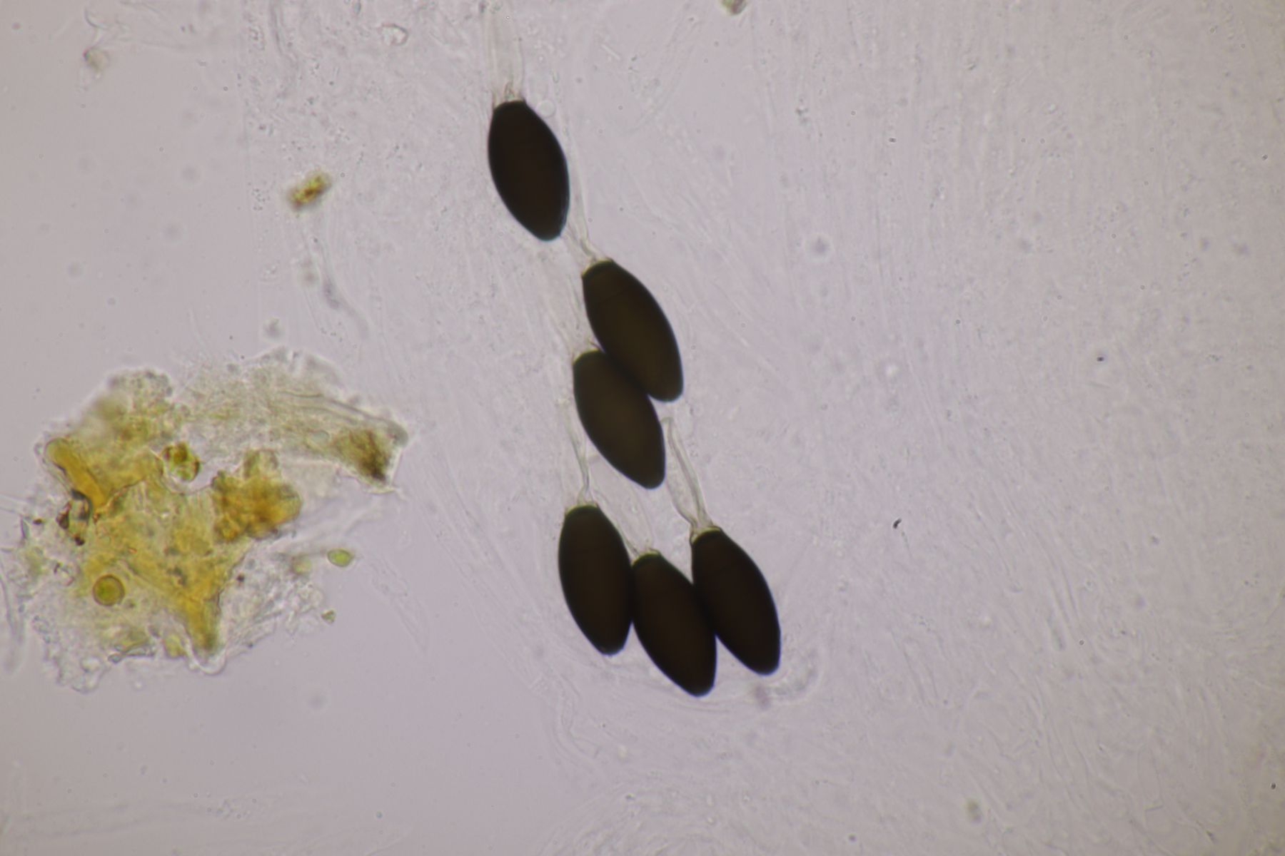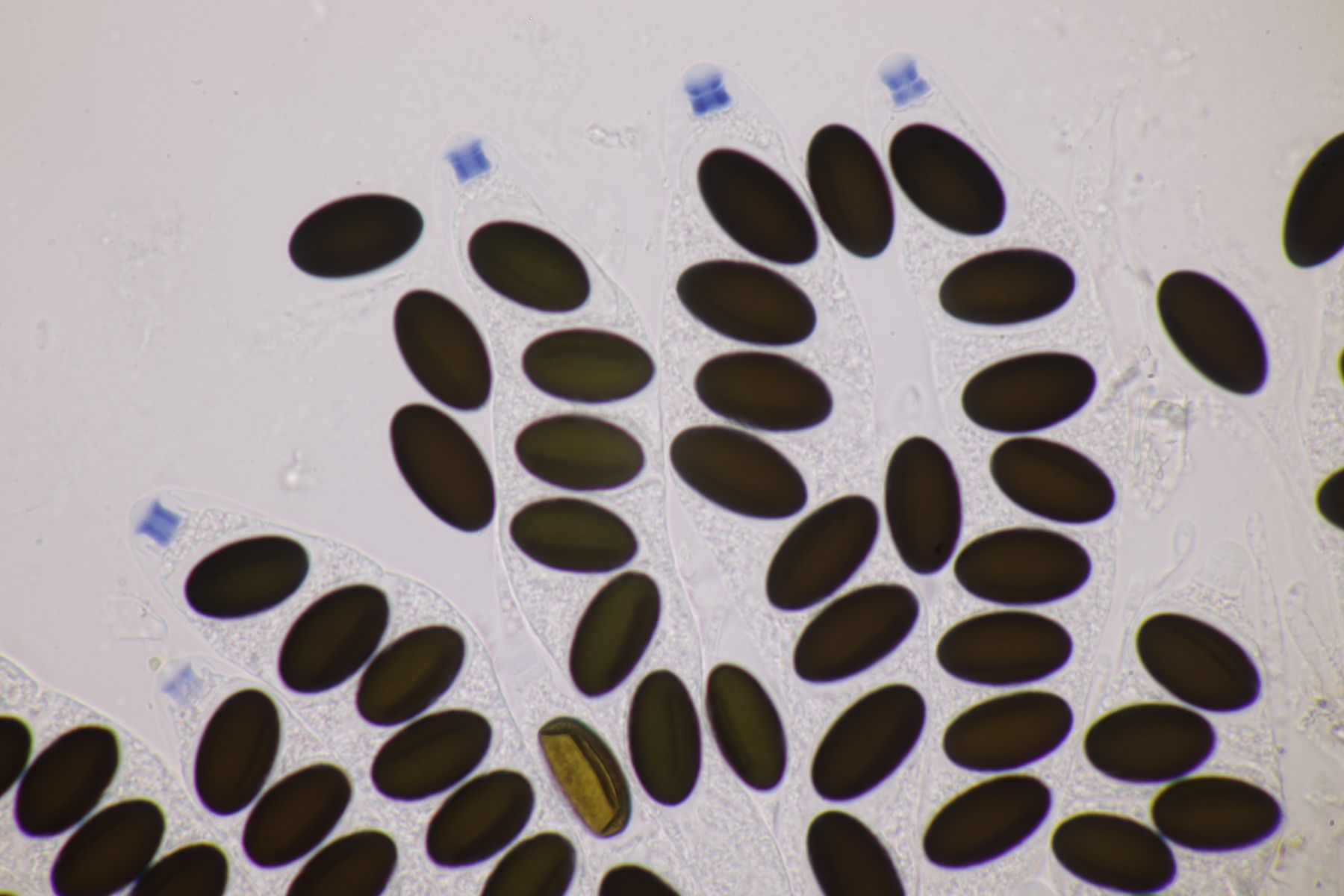 2. Eine Hypocopra, also mal wieder ein schwieriger Fall. Sporen messen 21.7-25.6 µm x 12.3-14.2 µm, die Keimspalte 12-13 µm lang. zweizelligen Sporen habe ich trotz intensiver Suche an unreifen Asci keine beobachtet. Der Apikalapparat amyloid. Pro Stroma habe ich jeweils nur ein Perithecium wahrgenommen (wobei ich nach wie vor unsicher bin, wie gut und richtig ich das beurteile). Nehme ich dann symmetrische Sporen an, lande ich mit dem vorläufigen Hypocopra-Schlüssel von Peter Welt nirgendwo. Übersehe ich am Ende also nur die zweite Zelle, habe die Perithecienzahl falsch beurteilt und es handelt sich bloß um H. brefeldii?