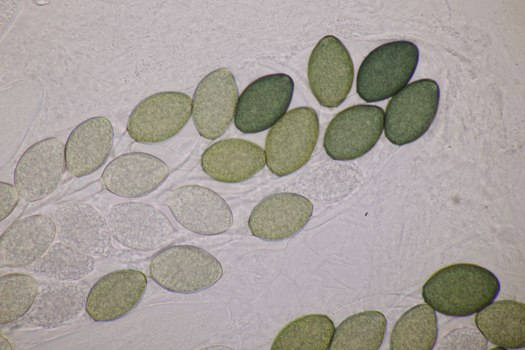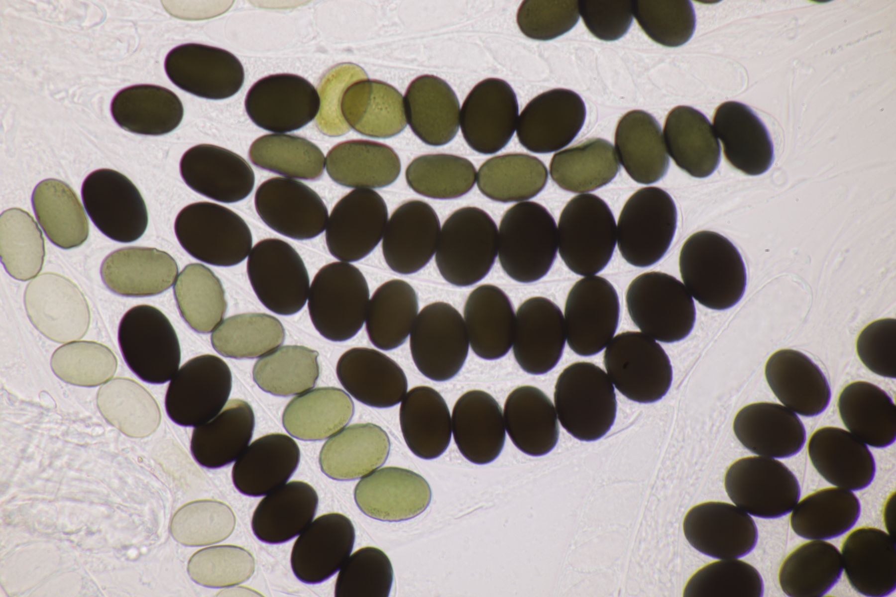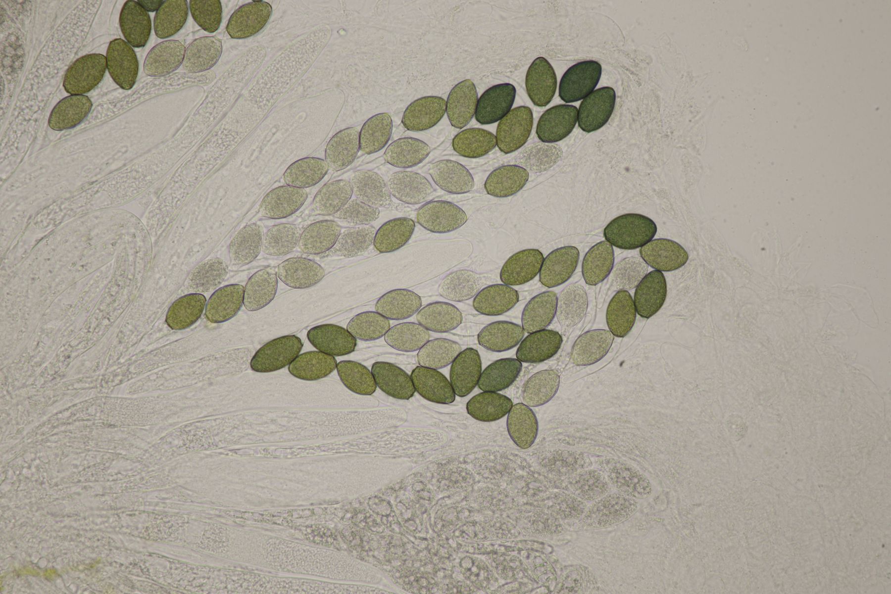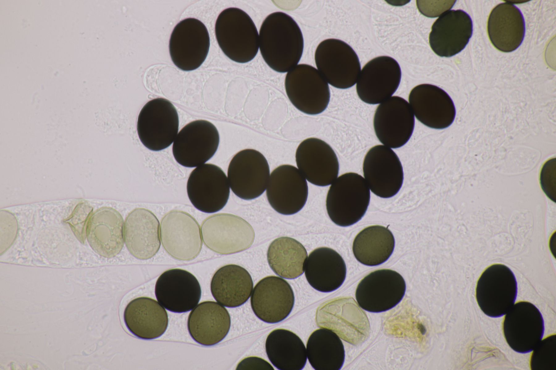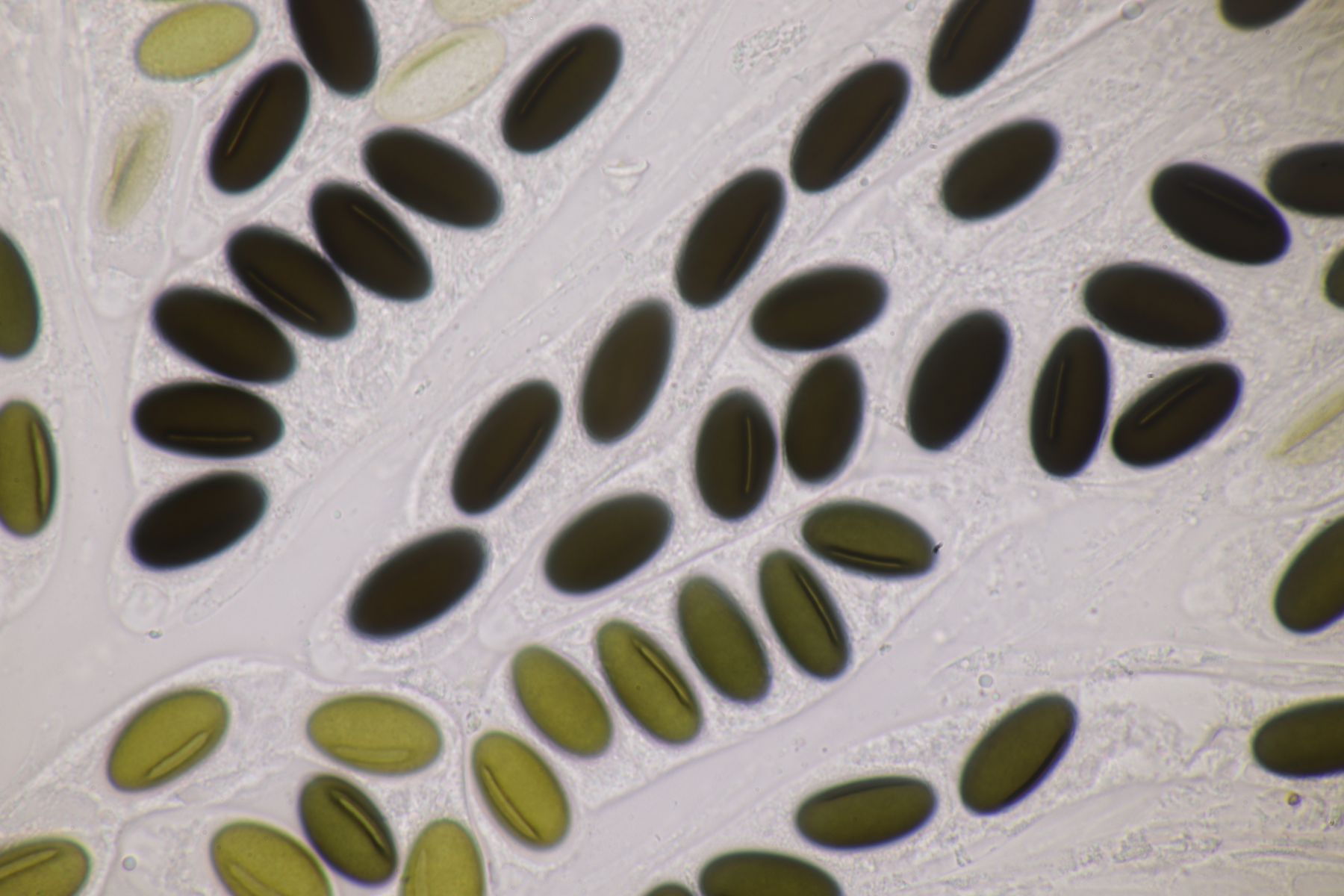 2. Eine Hypocopra, also mal wieder ein schwieriger Fall. Sporen messen 21.7-25.6 µm x 12.3-14.2 µm, die Keimspalte 12-13 µm lang. zweizelligen Sporen habe ich trotz intensiver Suche an unreifen Asci keine beobachtet. Der Apikalapparat amyloid. Pro Stroma habe ich jeweils nur ein Perithecium wahrgenommen (wobei ich nach wie vor unsicher bin, wie gut und richtig ich das beurteile). Nehme ich dann symmetrische Sporen an, lande ich mit dem vorläufigen Hypocopra-Schlüssel von Peter Welt nirgendwo. Übersehe ich am Ende also nur die zweite Zelle, habe die Perithecienzahl falsch beurteilt und es handelt sich bloß um H. brefeldii?