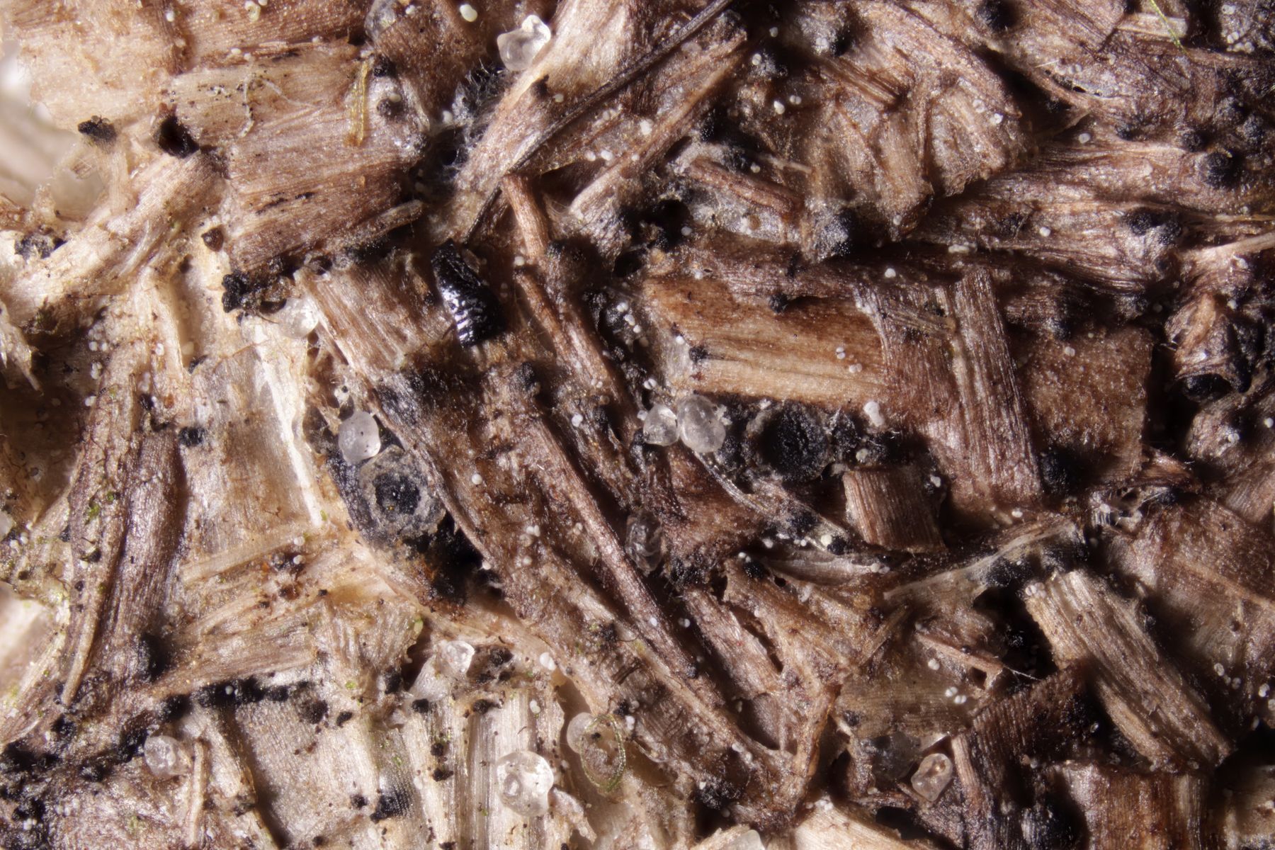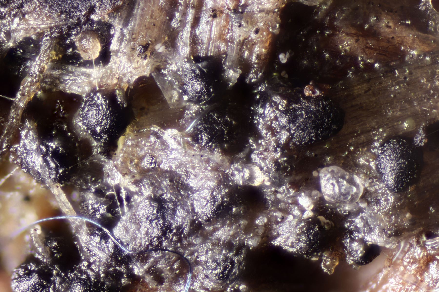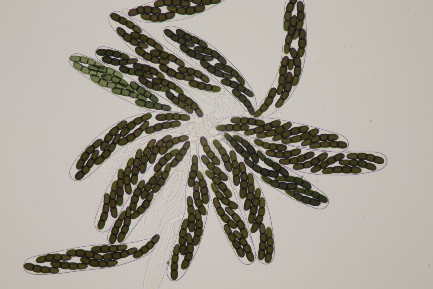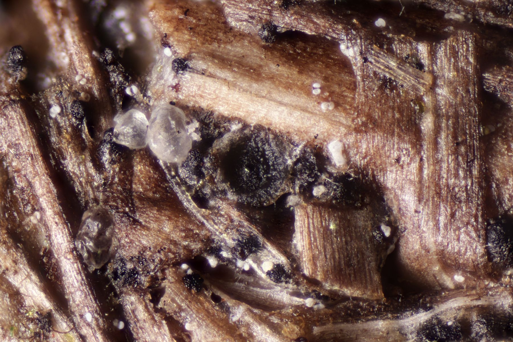 8. Leider ein Einzelfruchtkörper (bzw. ich habe bis dato noch kein weiteres Exemplar davon gefunden), der nur diese wenigen reifen Sporen beinhaltete, die auch so im restlichen Gezumpel lagen, daß sich eventuelle Gelhüllen nicht beurteilen geschweige denn darstellen ließen. Von den Sporen her lande ich bei Trichodelitschia (auch wenn mir am Perithecium keine Haare aufgefallen sind), Sporenmaße sind 20-21.5 µm x 8.5-10.5 µm, was irgendwie nicht so wirklich zu einer Art paßt. Aber es kann natürlich auch sein, daß dieser eine Ascus in seiner Entwicklung gestört ist und die Sporenmaße deshalb etwas untypisch sind. Also mal abwarten, ob sich weitere Perithecien zeigen.