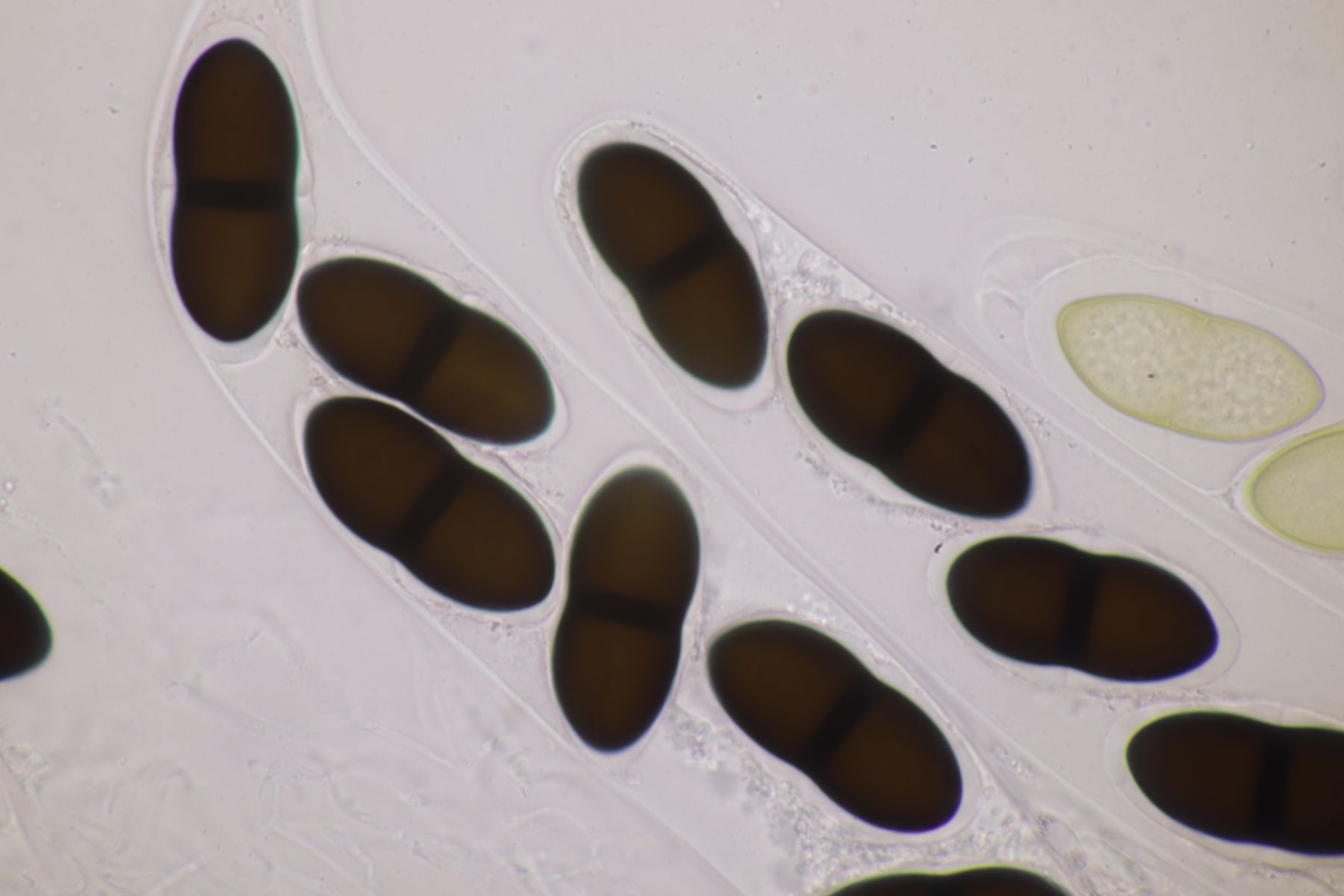 8. Leider ein Einzelfruchtkörper (bzw. ich habe bis dato noch kein weiteres Exemplar davon gefunden), der nur diese wenigen reifen Sporen beinhaltete, die auch so im restlichen Gezumpel lagen, daß sich eventuelle Gelhüllen nicht beurteilen geschweige denn darstellen ließen. Von den Sporen her lande ich bei Trichodelitschia (auch wenn mir am Perithecium keine Haare aufgefallen sind), Sporenmaße sind 20-21.5 µm x 8.5-10.5 µm, was irgendwie nicht so wirklich zu einer Art paßt. Aber es kann natürlich auch sein, daß dieser eine Ascus in seiner Entwicklung gestört ist und die Sporenmaße deshalb etwas untypisch sind. Also mal abwarten, ob sich weitere Perithecien zeigen.