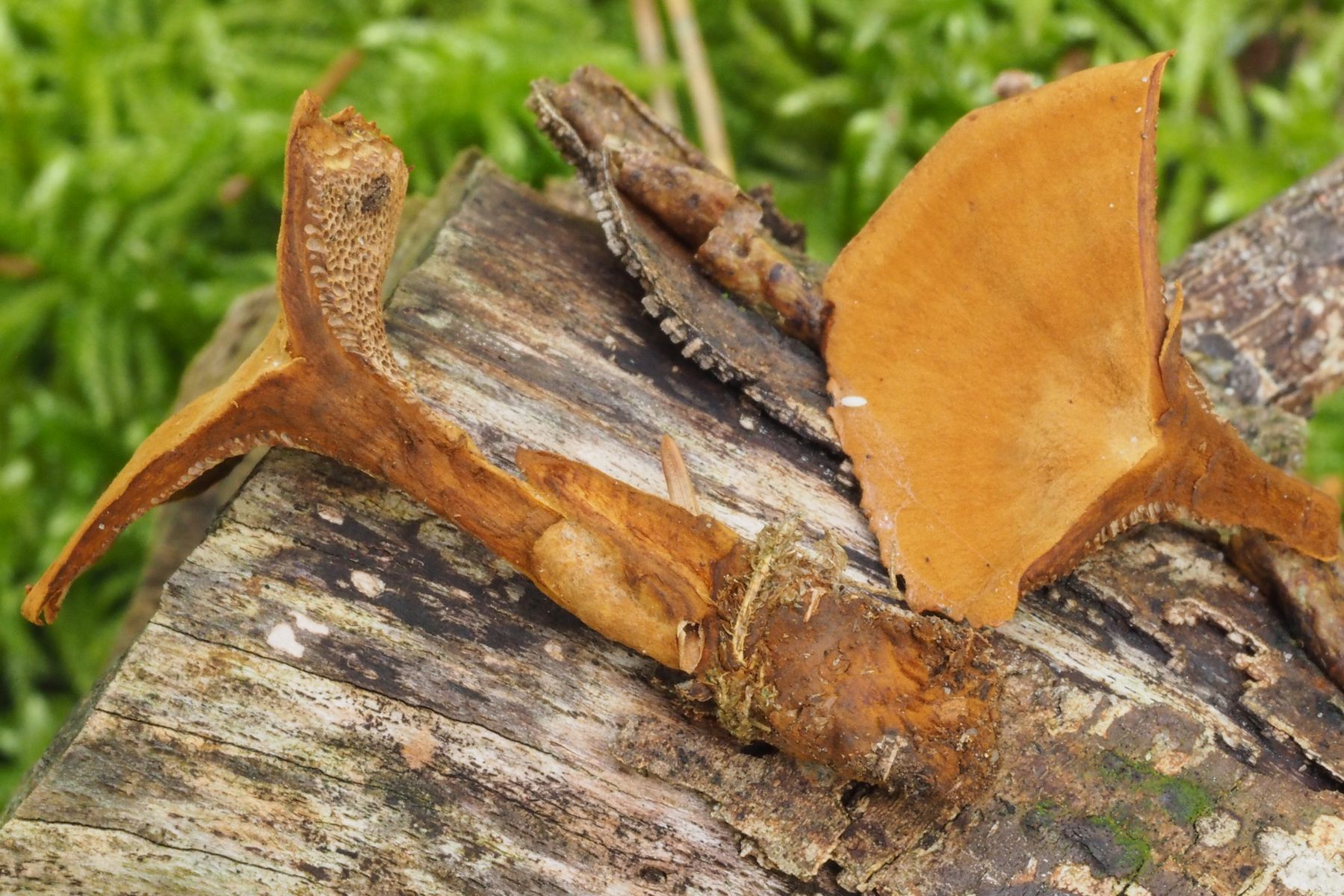 Die am Stiel herablaufenden Röhren sind groß, leicht eckig, außen hellbraun und zur Mitte hin dunkelbraun.