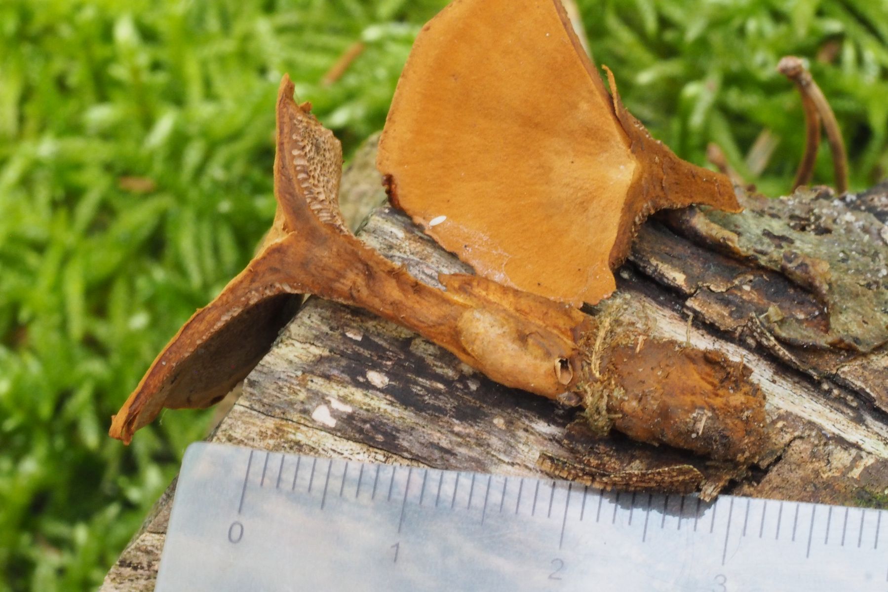 Ein kleiner Stiel-Porling mit trocken-samtigem, leicht getrichterten, zähen Hut von ca. 3,5 cm Durchmesser.