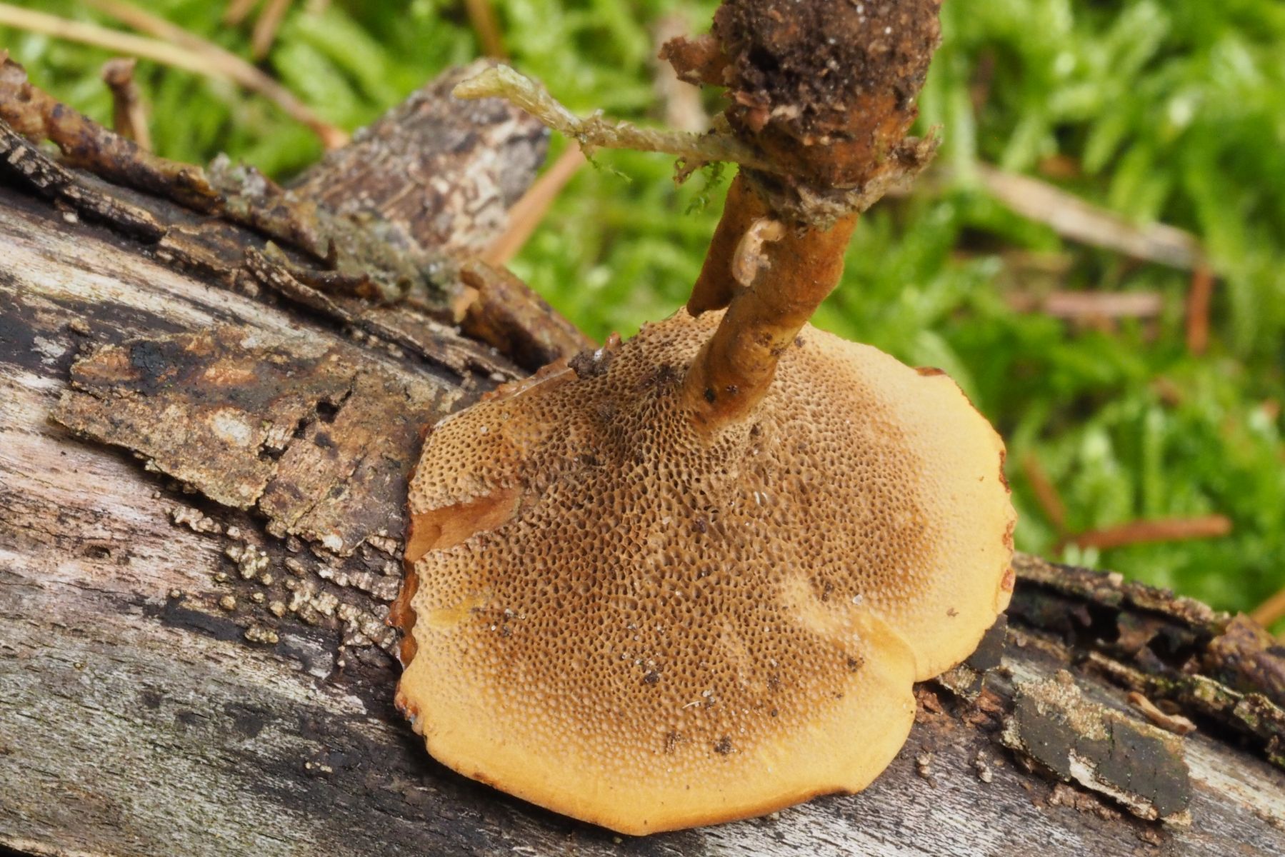 Ein kleiner Stiel-Porling mit trocken-samtigem, leicht getrichterten, zähen Hut von ca. 3,5 cm Durchmesser.