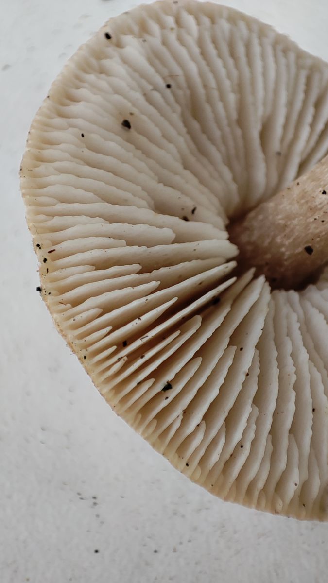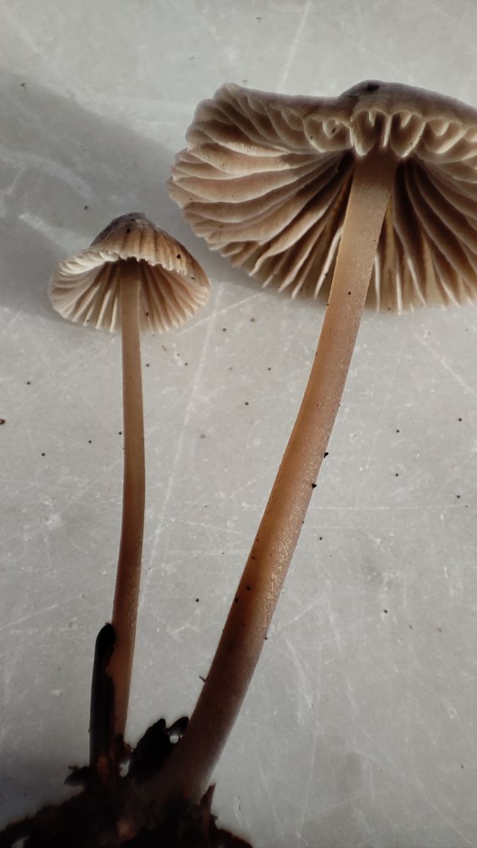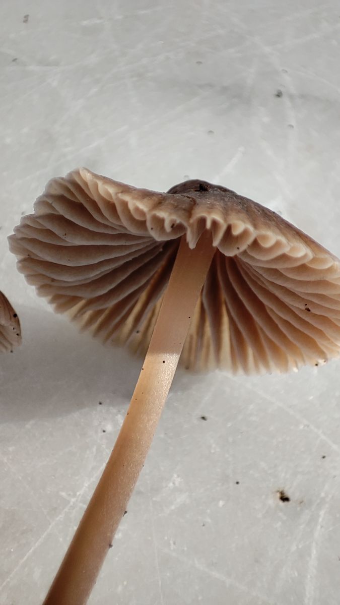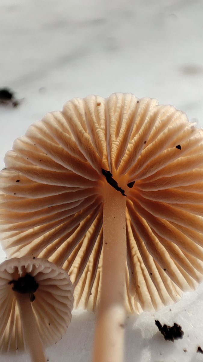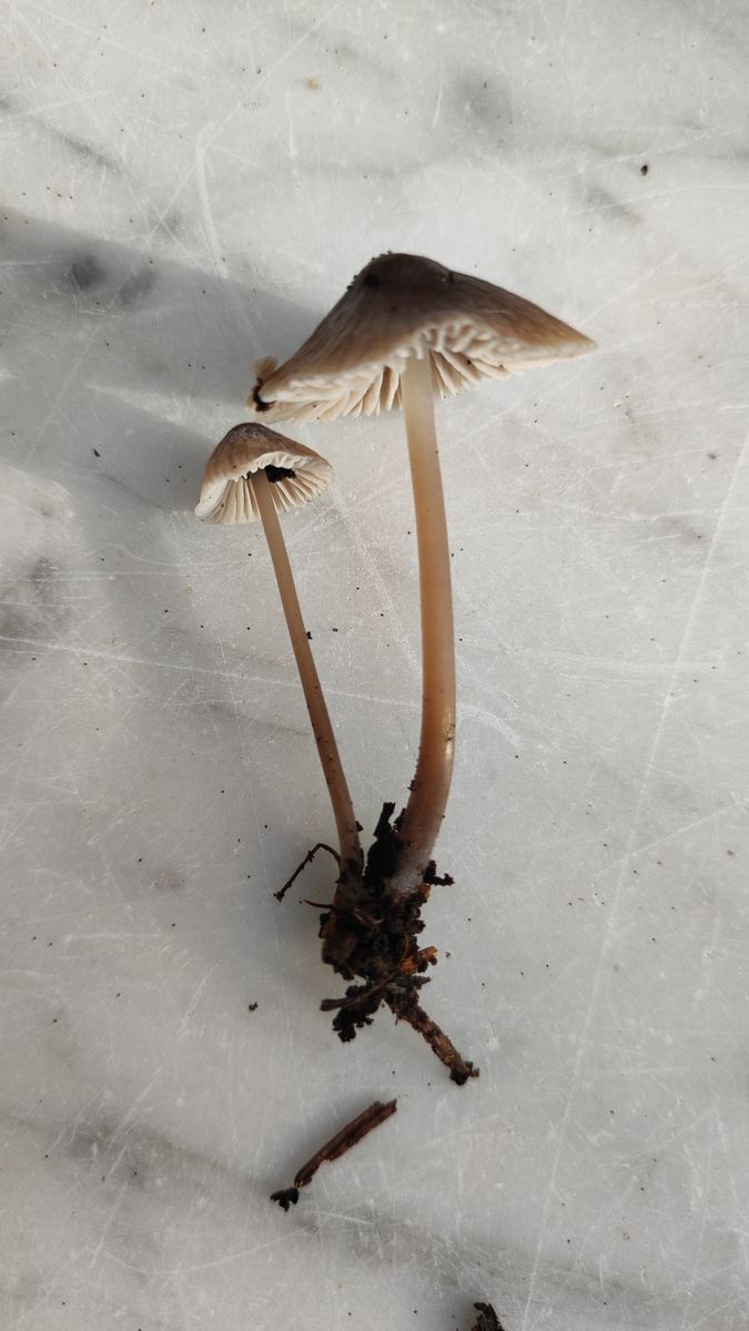 Sie glänzten leicht fettig, sind aber nicht schleimig, die Hutmitte ist zitzenartig erhoben, Hut deutlich radial creme und braun gestreift, Hutmitte braun, Hutrand gebogt, Hutfleisch sehr dĂźnn bzw. nicht vorhanden (siehe Bild 20!), Lamellen "herzchenfĂśrmig" untermischt, weitstehend, Zwischenräume zwischen den Lamellen wellig strukturiert (siehe Foto Nr. 20!), Stiele trocken, hellbraun, zur Basis dunkler, Lamellen hell. Geruch deutlich nitrĂśs. (selbst fĂźr mich stark wahrnehmbar!) Sporenabdruck ist in Arbeit. (evtl. Mycena capillaripes (obwohl da die Lamellen mehr unten rausgucken mĂźĂten) oder stipata, wg. des Geruchs?)
