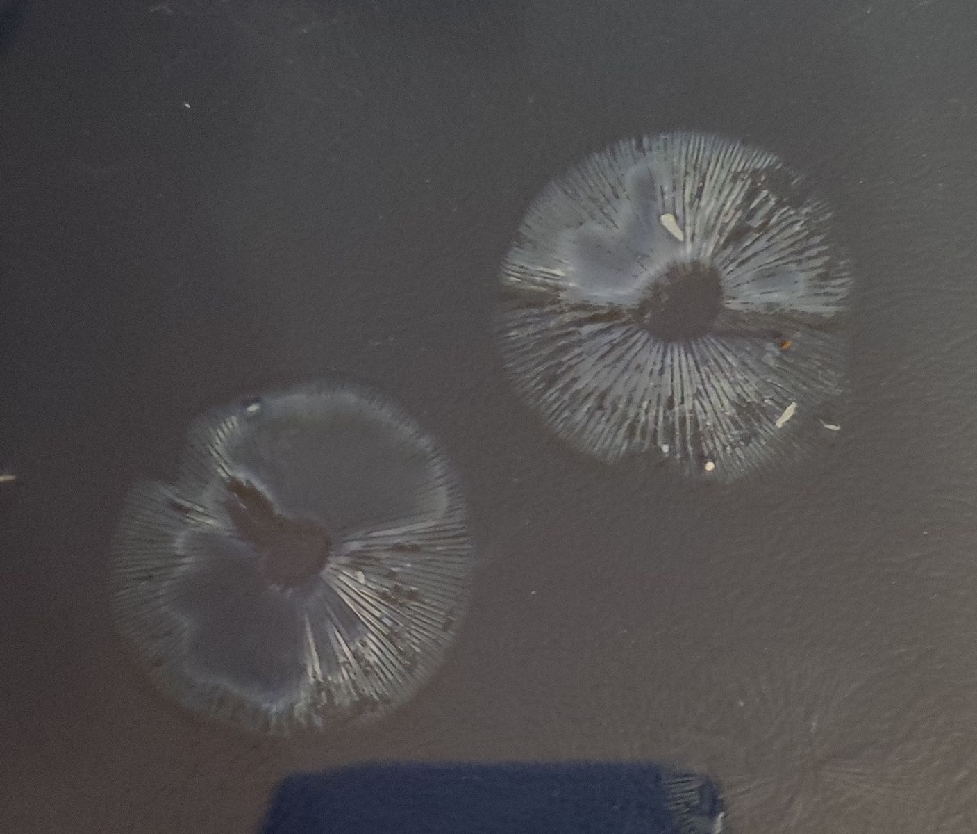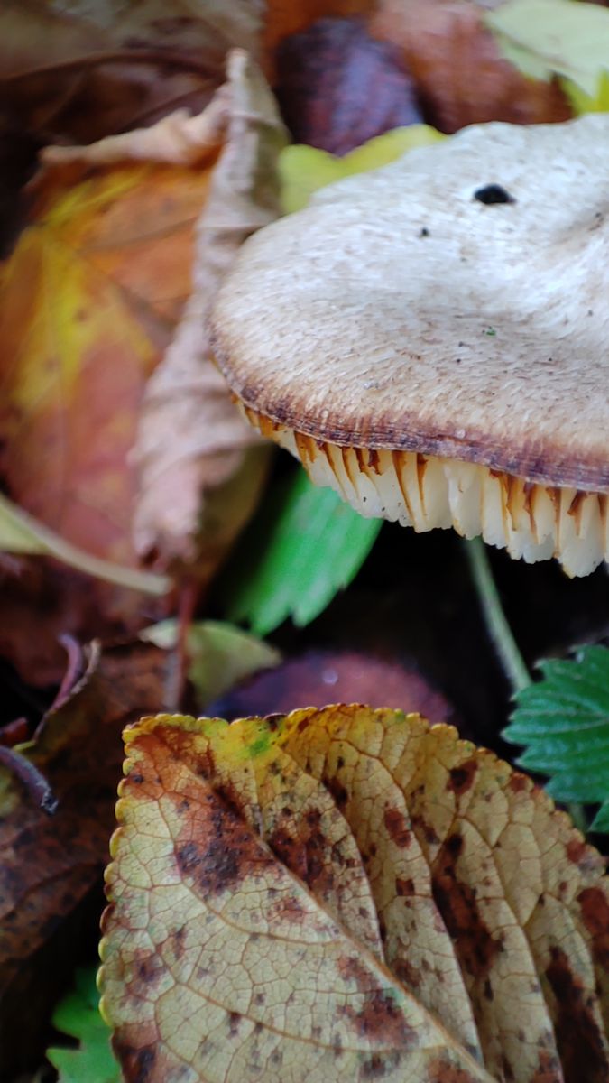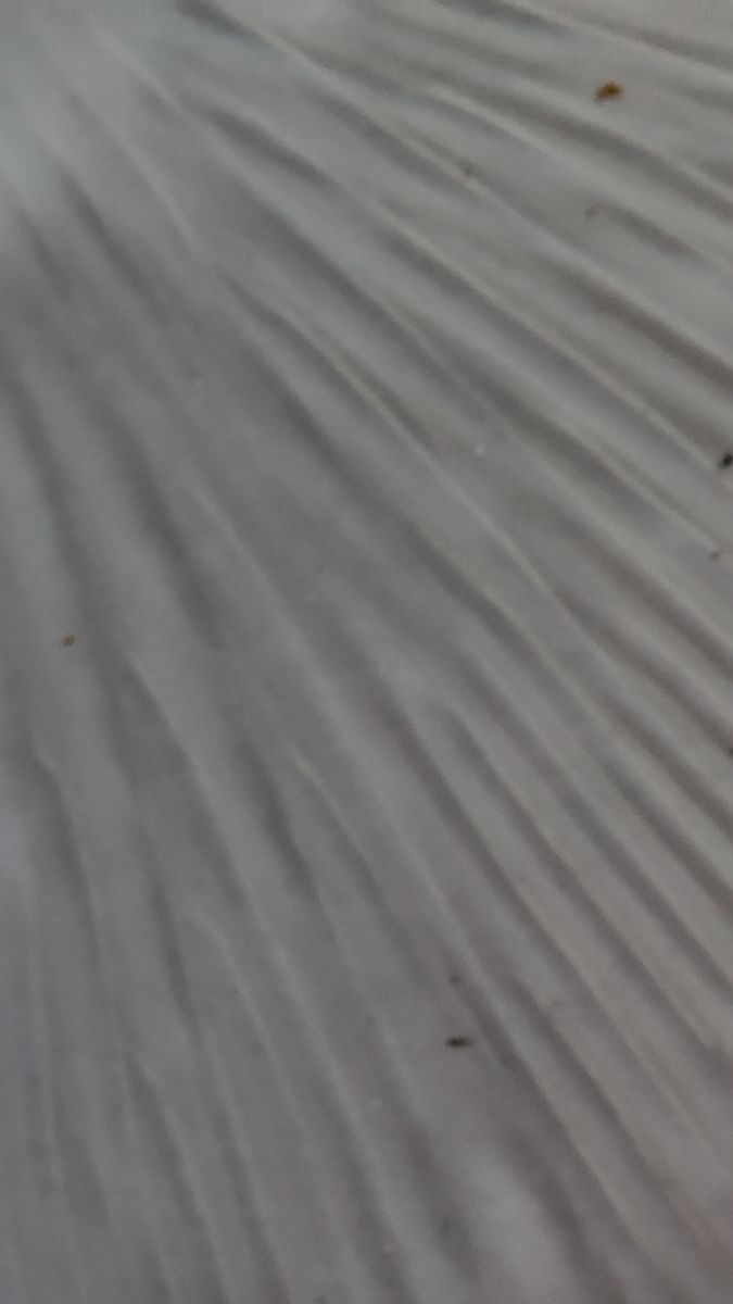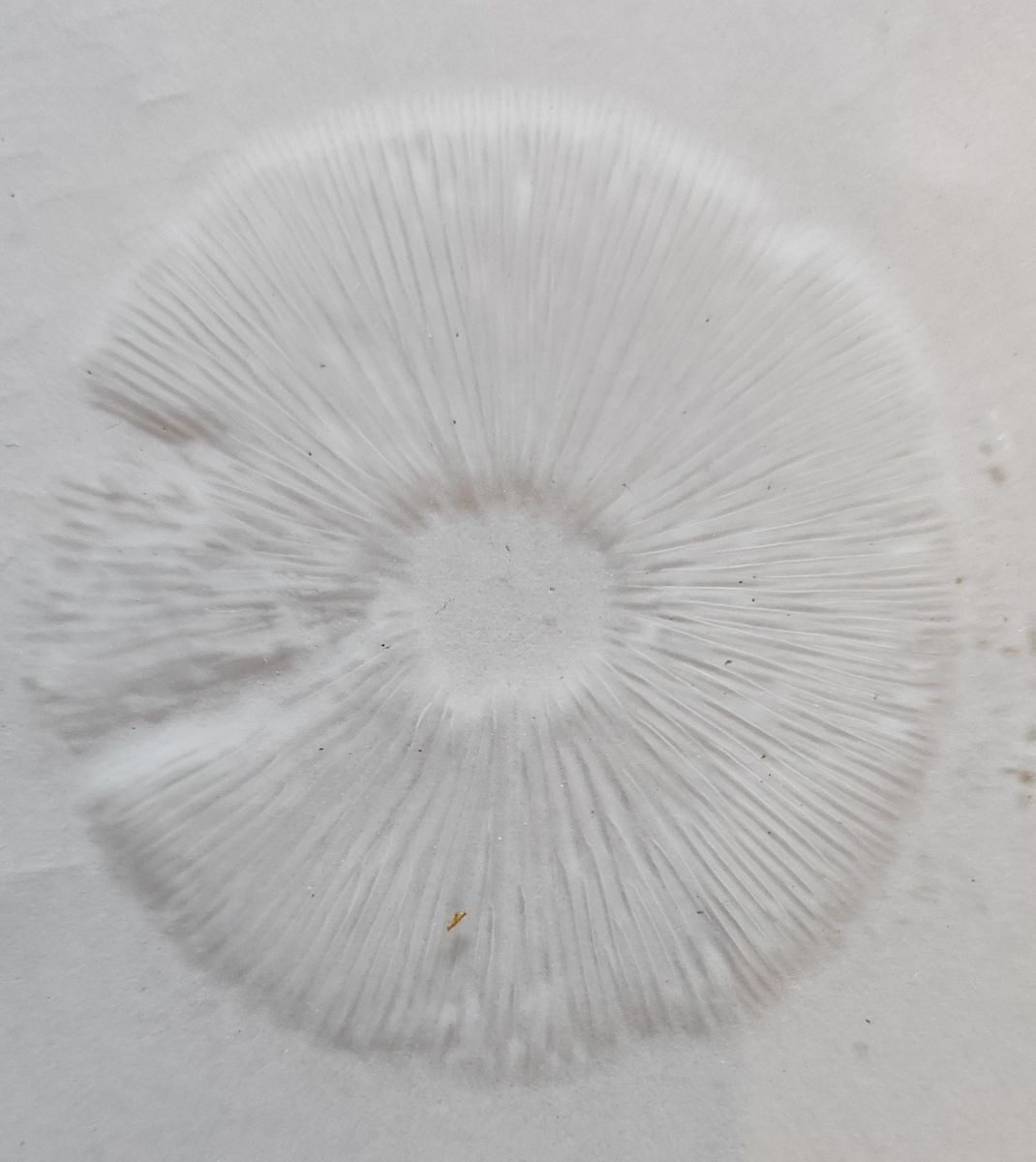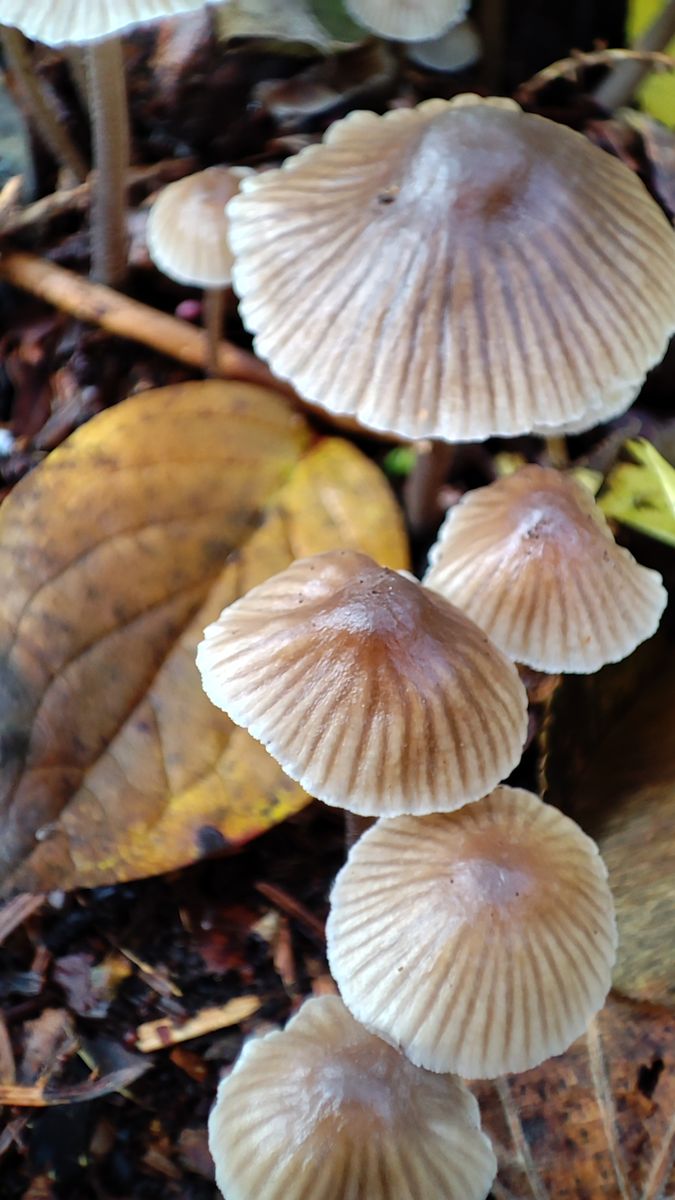 Sie glänzten leicht fettig, sind aber nicht schleimig, die Hutmitte ist zitzenartig erhoben, Hut deutlich radial creme und braun gestreift, Hutmitte braun, Hutrand gebogt, Hutfleisch sehr dĂźnn bzw. nicht vorhanden (siehe Bild 20!), Lamellen "herzchenfĂśrmig" untermischt, weitstehend, Zwischenräume zwischen den Lamellen wellig strukturiert (siehe Foto Nr. 20!), Stiele trocken, hellbraun, zur Basis dunkler, Lamellen hell. Geruch deutlich nitrĂśs. (selbst fĂźr mich stark wahrnehmbar!) Sporenabdruck ist in Arbeit. (evtl. Mycena capillaripes (obwohl da die Lamellen mehr unten rausgucken mĂźĂten) oder stipata, wg. des Geruchs?)