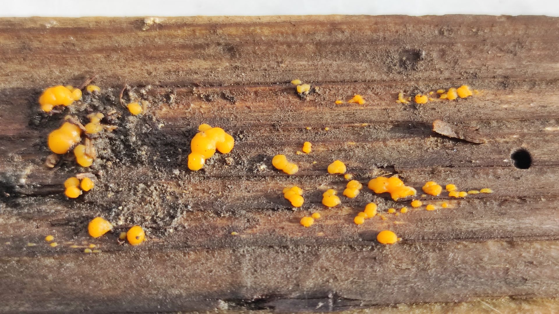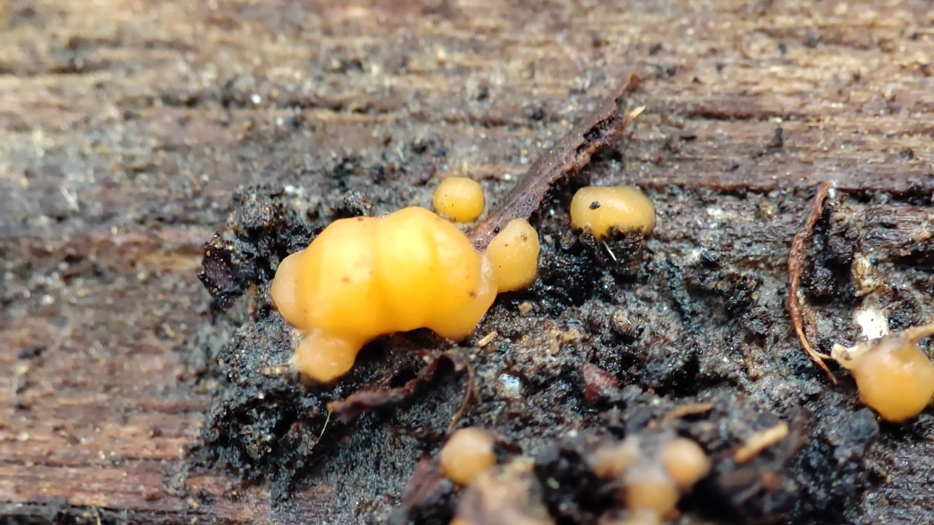 23.-25.: Pilz 3: An einem alten Holzbrettchen: Irgendwas Gallerttränen-artiges...