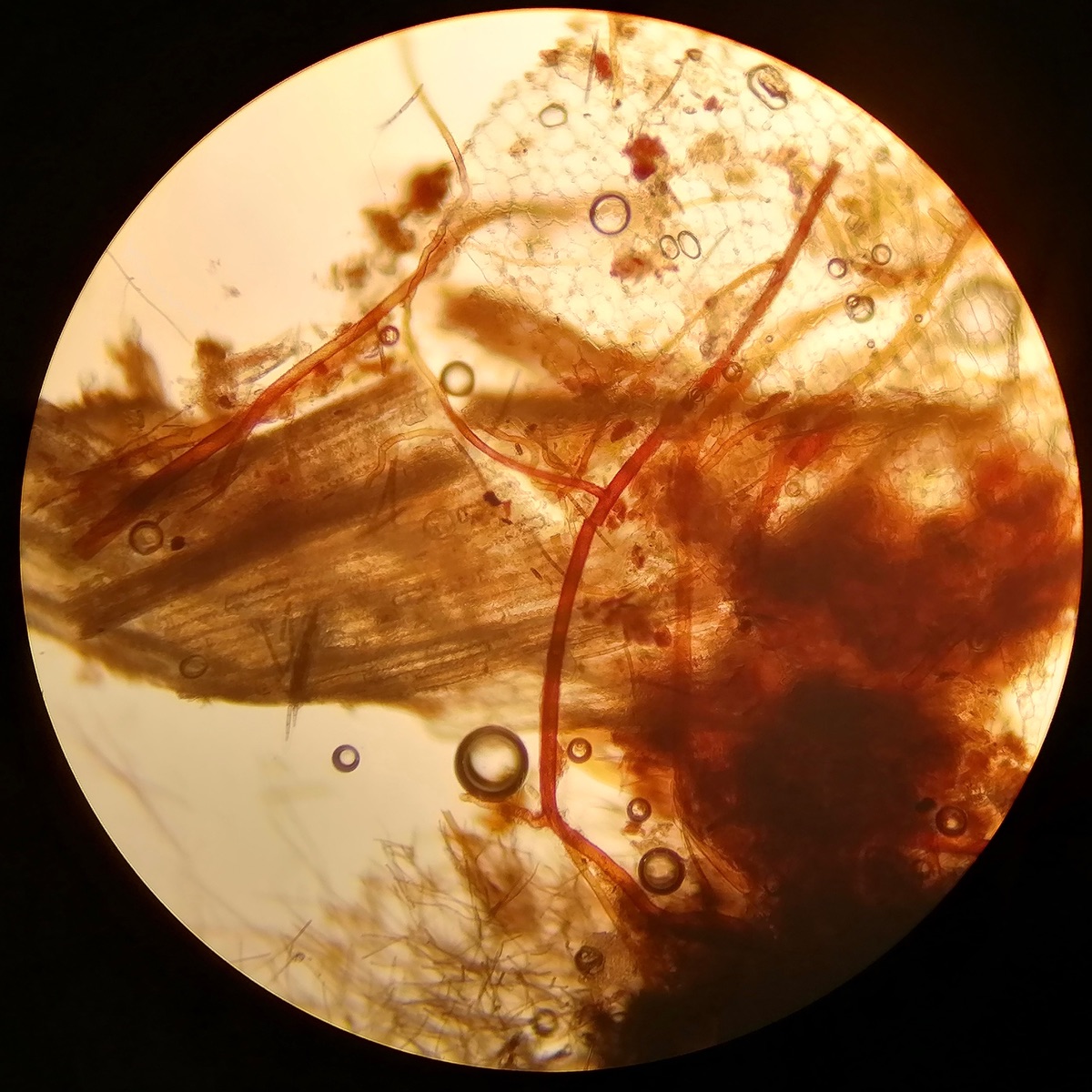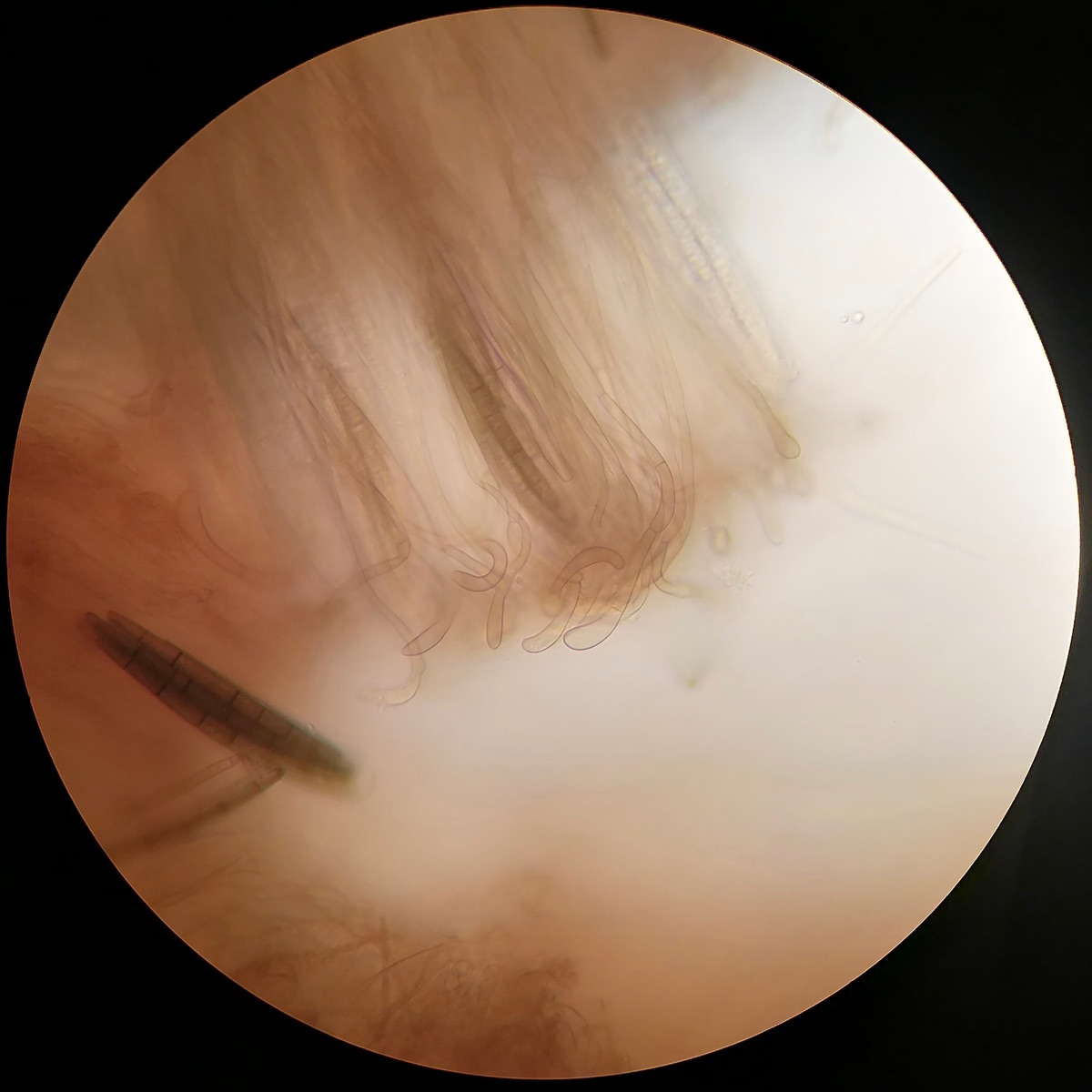 Ich kĂśnnt mir vorstellen, dass das ein Mycelfilz ist. Man mĂźsste mal genau schauen wo und wie diese Haare angewachsen sind ( ob sie von ganz aussen oder vom FruchtkĂśrperinnern heraus wachsen).
