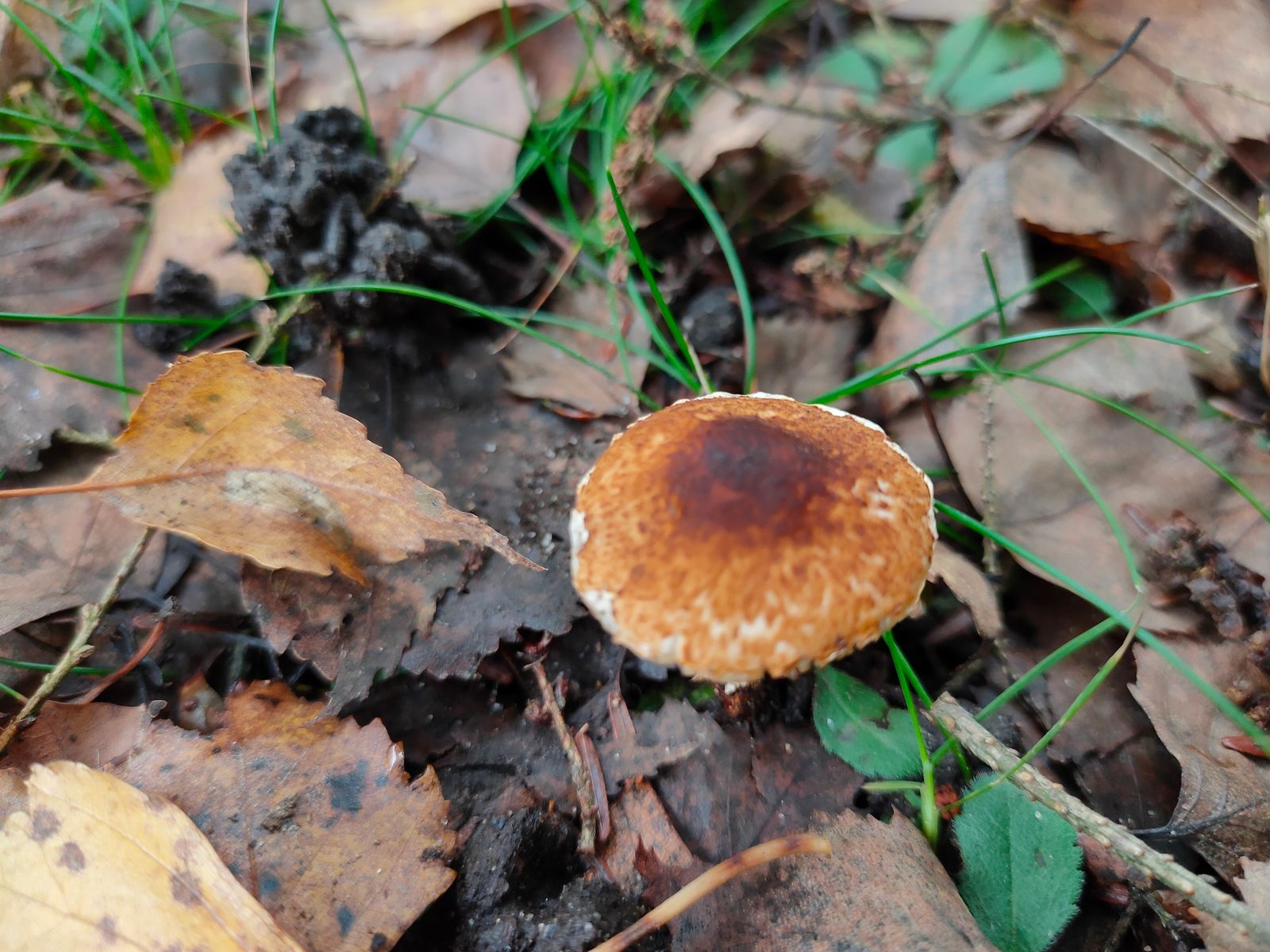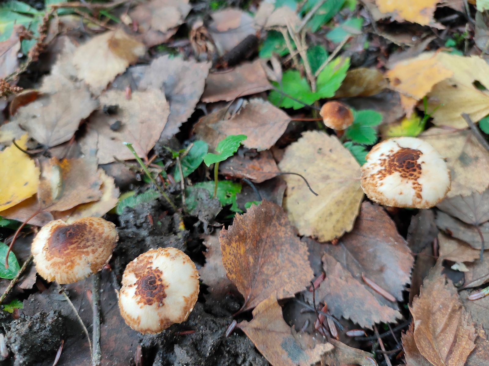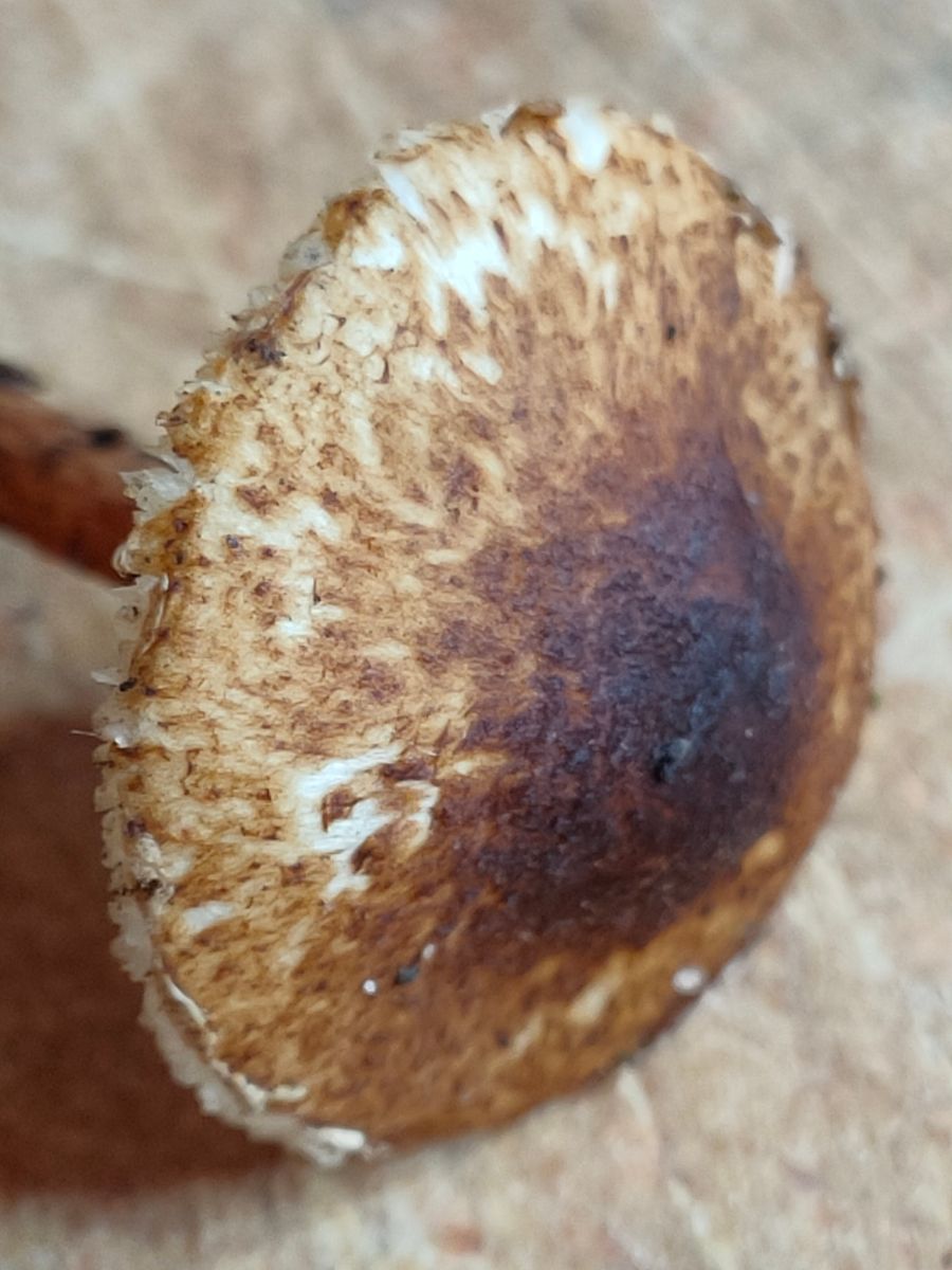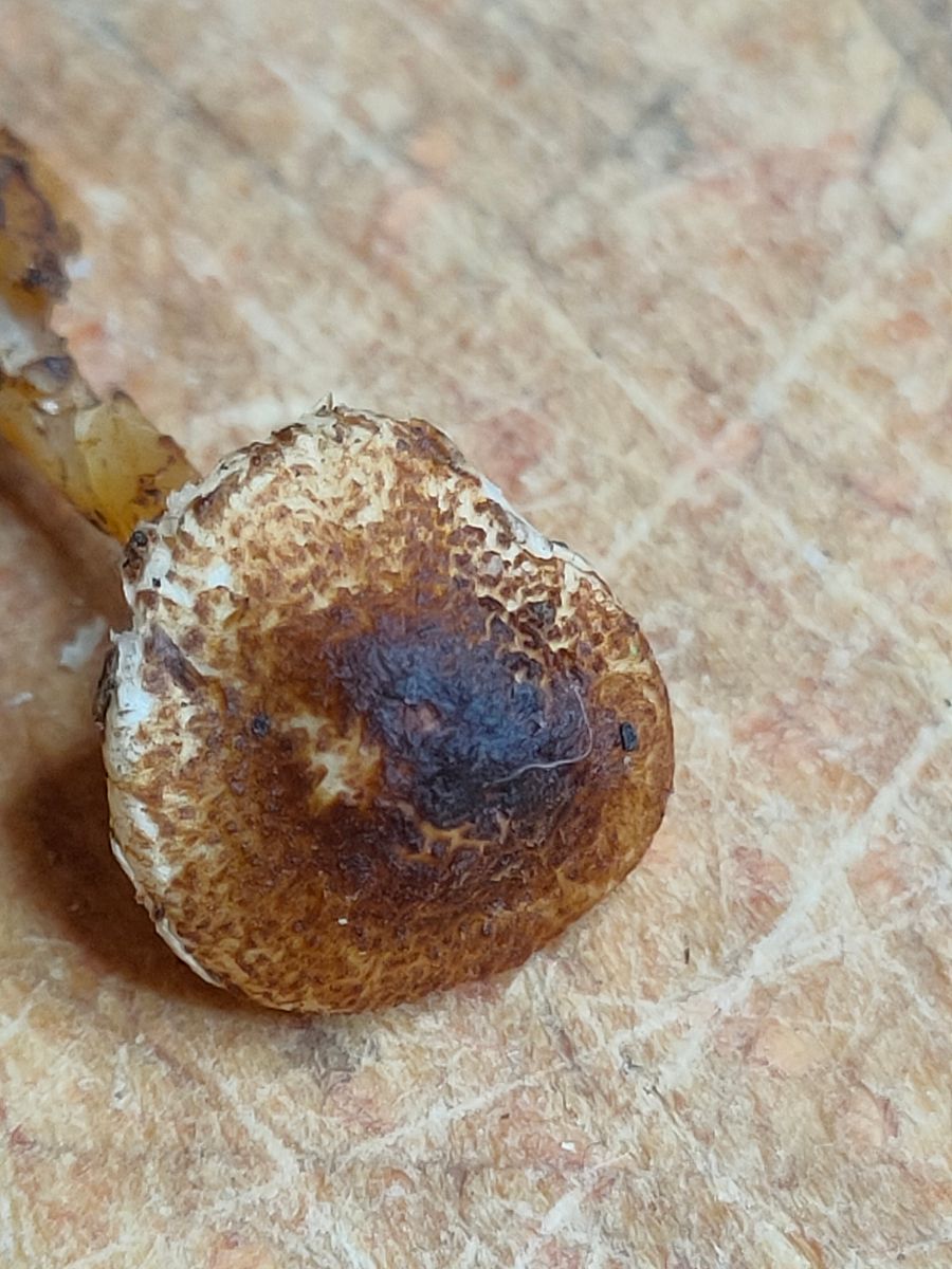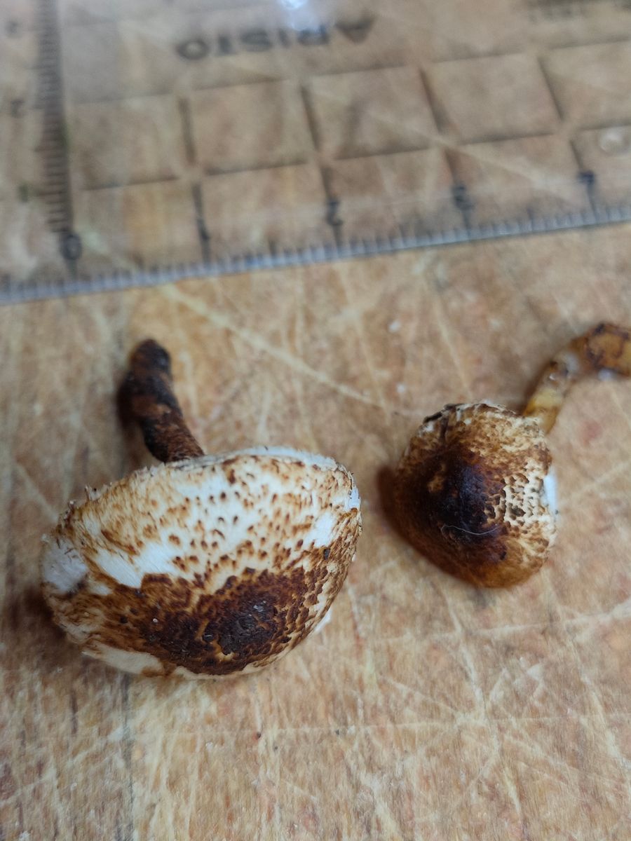 1. Ein kleiner brauner Lepiota. Dieser wurde unter einer Fichte gefunden und hat einen deutlich braun gefärbten Hut und einen braune beschuppten Stiel.