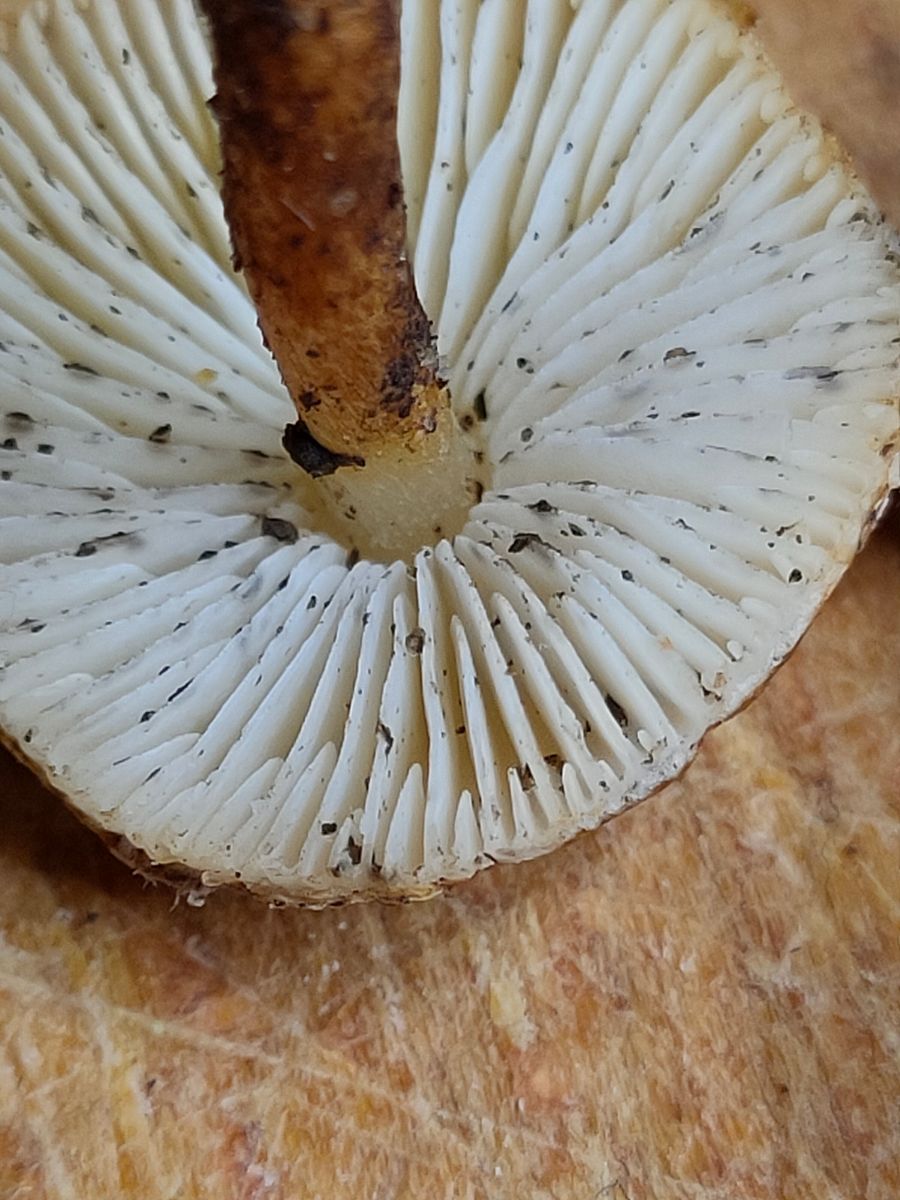 Der Geruch ist schwer zu beschreibbar, hat vielleicht eine leicht süsslich Note nach Birne. Die weißen Lamellen sind nicht wellig und fast frei und stehen nicht dicht.