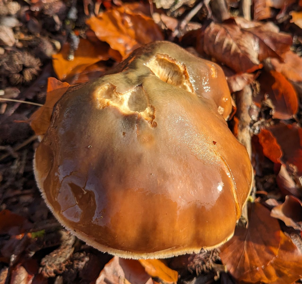 Es wuchsen drei Pilze in unmittelbarer Nähe, alle drei recht groß. Die Hüte, wie man sehen kann, schleimig mit lebhafter Färbung und glockig, der Stiel weiß mit einem Hauch lila im unteren Bereich.