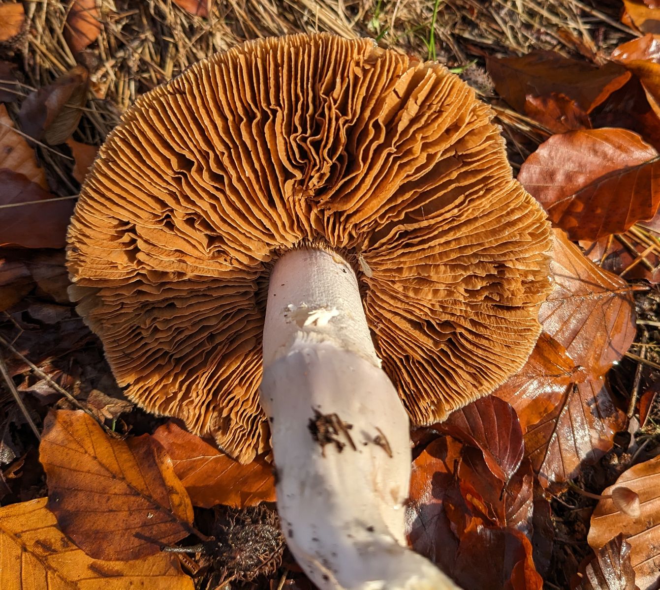 Die Lamellen sind rostbraun, Velumreste minimal am Hutrand noch vorhanden. Leider blieb die Basis im Boden und ich habe sie nicht herausgeholt, ebenso wenig kann ich etwas zum Geruch sagen. Der Stiel scheint mir aber auffällig lang zu sein.
