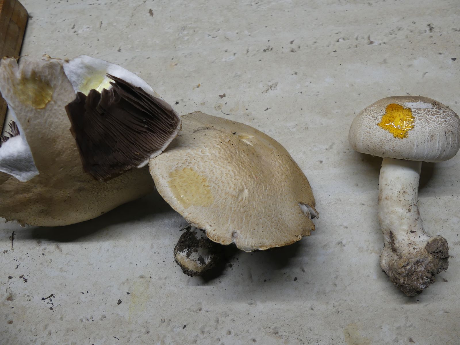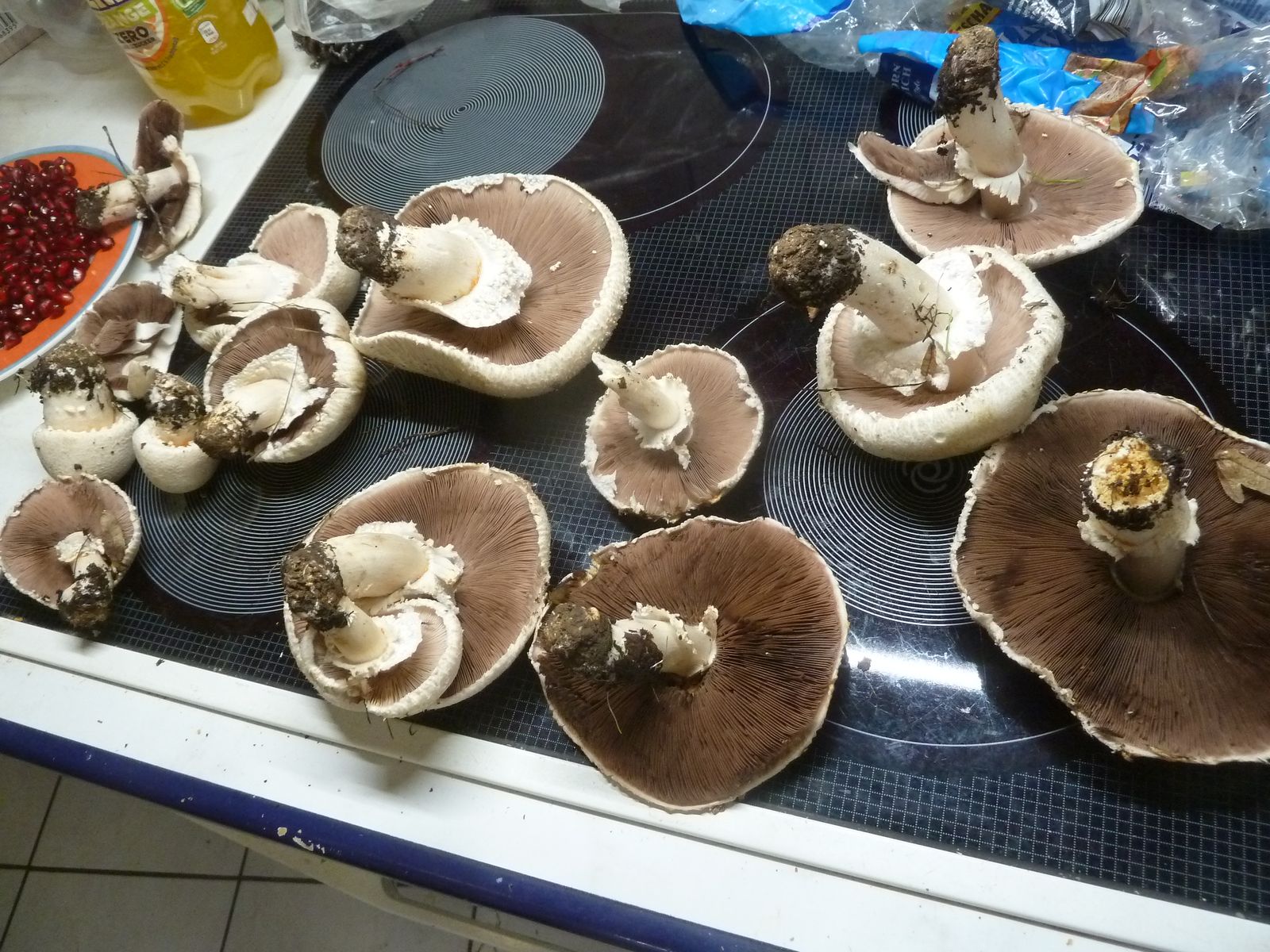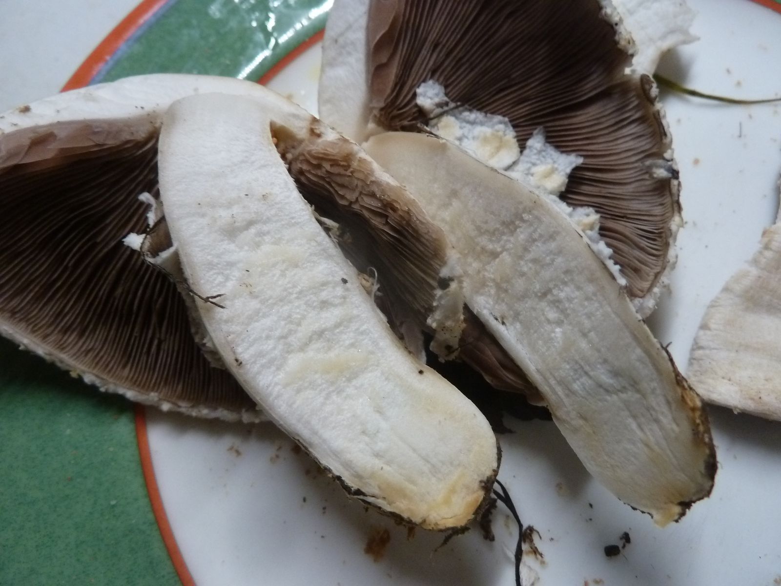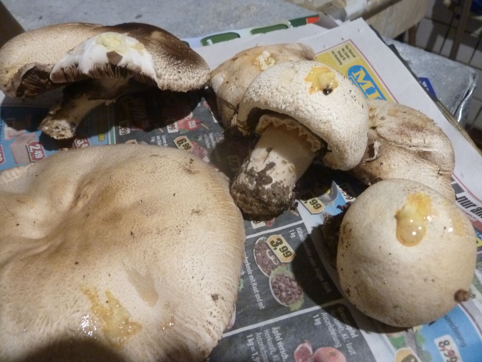 Keine Riesenchampignons mangels Marzipangeruch. Die Lamellen gab's in allen Tönen von schwach rosa bis dunkelbraun, siehe Fotos. Ich bin gespannt, ob ich richtig liege. ![]()