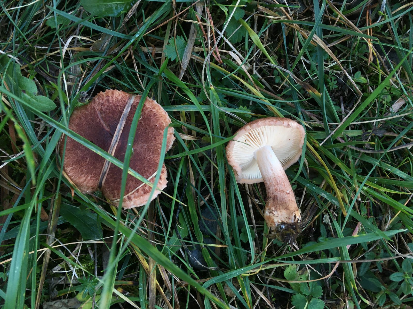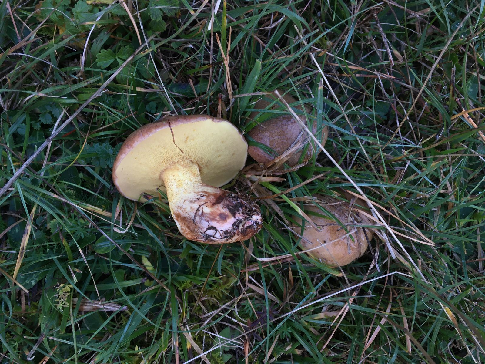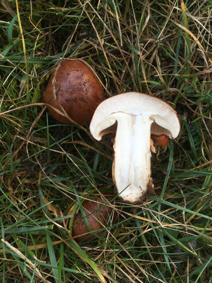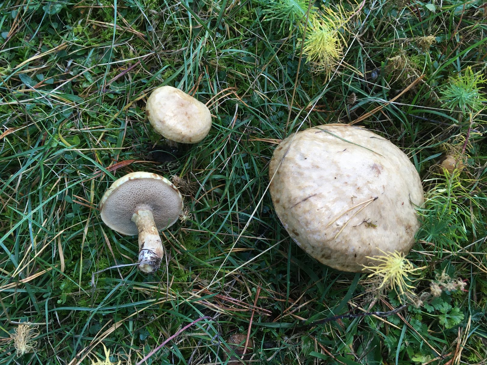 Suillus viscidus, ergrauter Lärchenröhrling, rechts ein Pfundskerl (fast)
