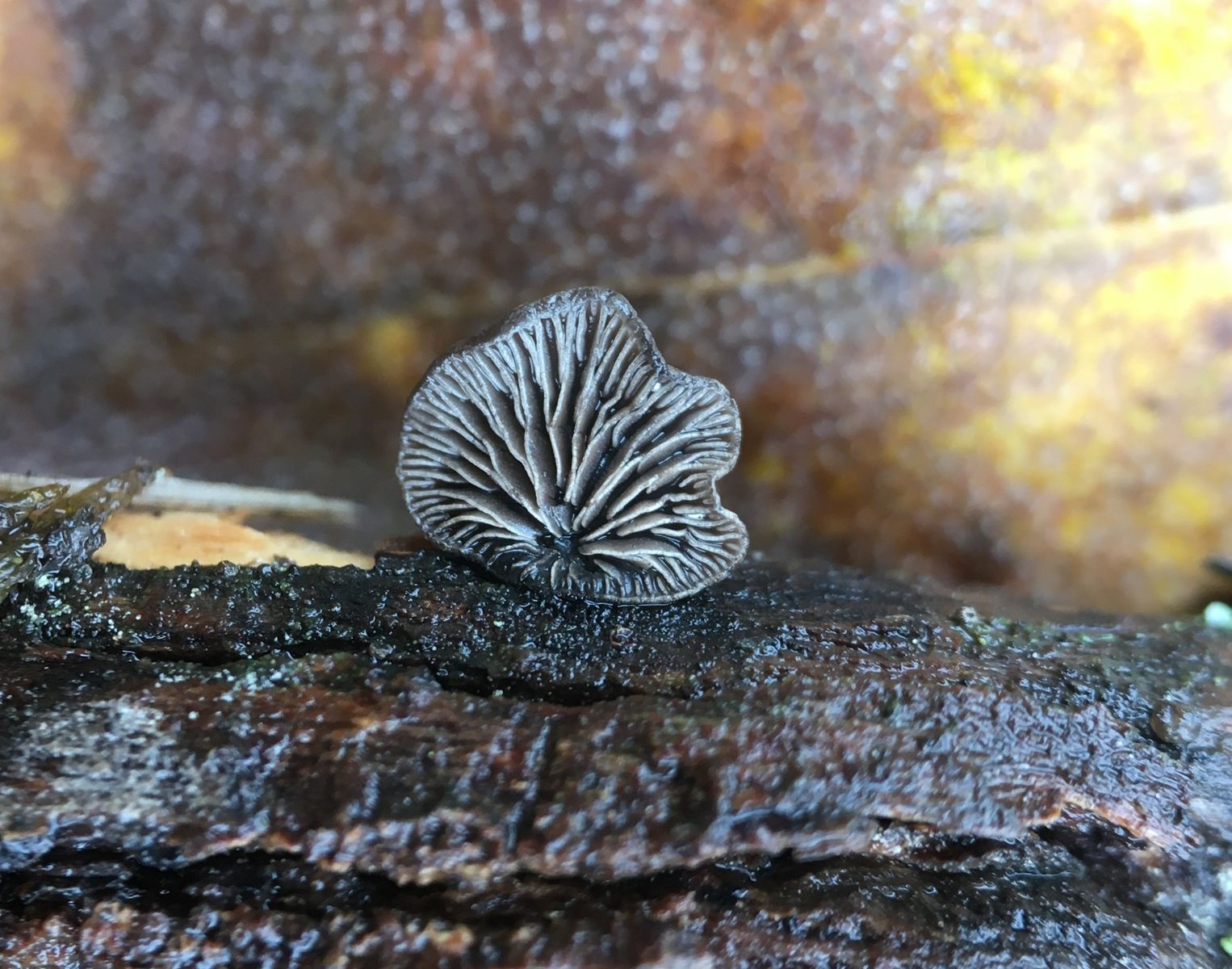 Clitocybe cf quisquiliarum, der Feldtrichterling (Größe täuscht, siehe Birkenblatt!)