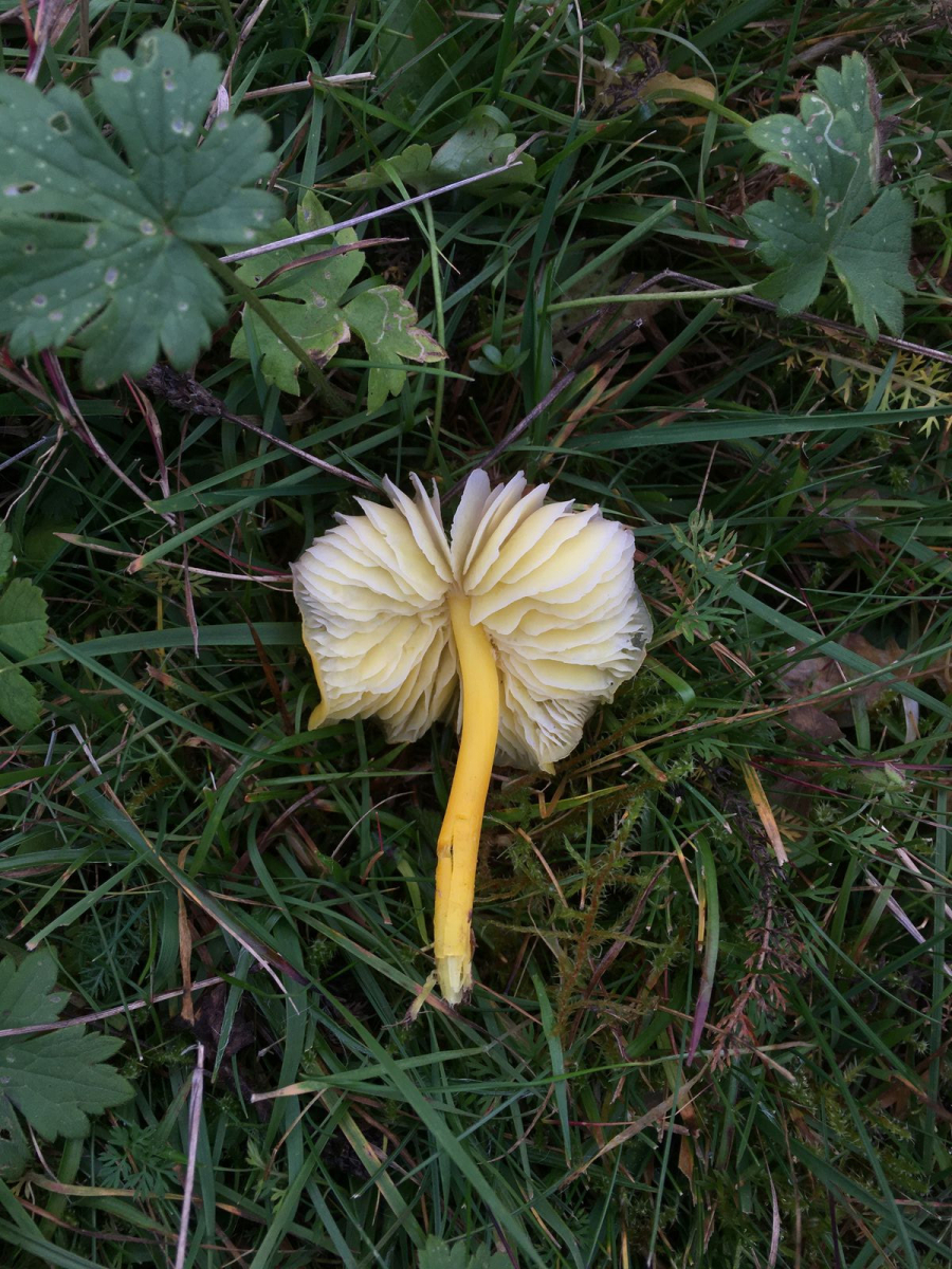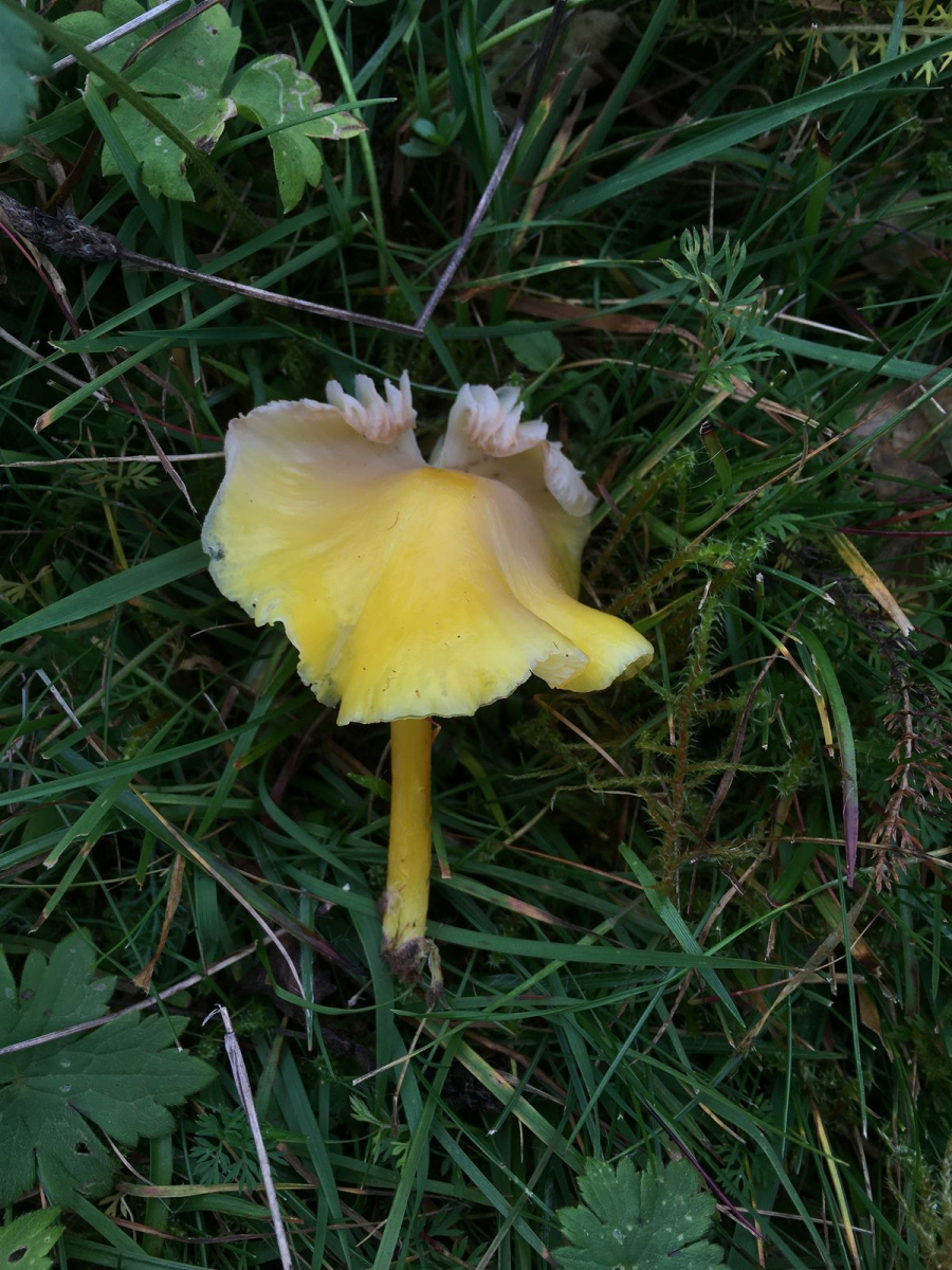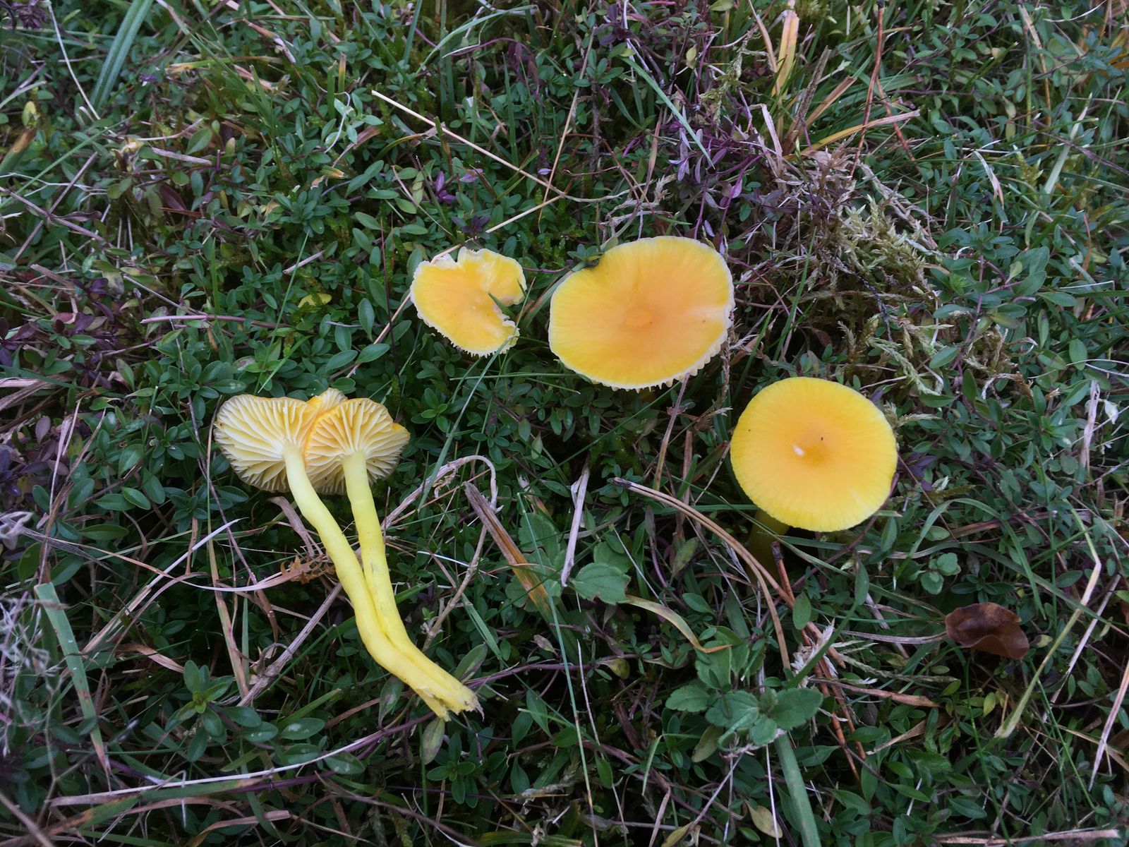 ebenfalls stattlich: Hut etwas schmierig, wegen des Kalbodens wahrscheinlich Hygrocybe chlorophana